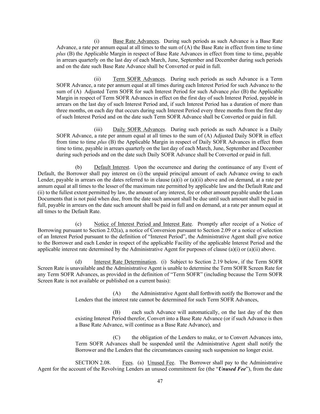 47 (i) Base Rate Advances. During such periods as such Advance is a Base Rate Advance, a rate per annum equal at all times to the sum of (A) the Base Rate in effect from time to time plus (B) the Applicable Margin in respect of Base Rate Advances in effect from time to time, payable in arrears quarterly on the last day of each March, June, September and December during such periods and on the date such Base Rate Advance shall be Converted or paid in full. (ii) Term SOFR Advances. During such periods as such Advance is a Term SOFR Advance, a rate per annum equal at all times during each Interest Period for such Advance to the sum of (A) Adjusted Term SOFR for such Interest Period for such Advance plus (B) the Applicable Margin in respect of Term SOFR Advances in effect on the first day of such Interest Period, payable in arrears on the last day of such Interest Period and, if such Interest Period has a duration of more than three months, on each day that occurs during such Interest Period every three months from the first day of such Interest Period and on the date such Term SOFR Advance shall be Converted or paid in full. (iii) Daily SOFR Advances. During such periods as such Advance is a Daily SOFR Advance, a rate per annum equal at all times to the sum of (A) Adjusted Daily SOFR in effect from time to time plus (B) the Applicable Margin in respect of Daily SOFR Advances in effect from time to time, payable in arrears quarterly on the last day of each March, June, September and December during such periods and on the date such Daily SOFR Advance shall be Converted or paid in full. (b) Default Interest. Upon the occurrence and during the continuance of any Event of Default, the Borrower shall pay interest on (i) the unpaid principal amount of each Advance owing to each Lender, payable in arrears on the dates referred to in clause (a)(i) or (a)(ii) above and on demand, at a rate per annum equal at all times to the lesser of the maximum rate permitted by applicable law and the Default Rate and (ii) to the fullest extent permitted by law, the amount of any interest, fee or other amount payable under the Loan Documents that is not paid when due, from the date such amount shall be due until such amount shall be paid in full, payable in arrears on the date such amount shall be paid in full and on demand, at a rate per annum equal at all times to the Default Rate. (c) Notice of Interest Period and Interest Rate. Promptly after receipt of a Notice of Borrowing pursuant to Section 2.02(a), a notice of Conversion pursuant to Section 2.09 or a notice of selection of an Interest Period pursuant to the definition of “Interest Period”, the Administrative Agent shall give notice to the Borrower and each Lender in respect of the applicable Facility of the applicable Interest Period and the applicable interest rate determined by the Administrative Agent for purposes of clause (a)(i) or (a)(ii) above. (d) Interest Rate Determination. (i) Subject to Section 2.19 below, if the Term SOFR Screen Rate is unavailable and the Administrative Agent is unable to determine the Term SOFR Screen Rate for any Term SOFR Advances, as provided in the definition of “Term SOFR” (including because the Term SOFR Screen Rate is not available or published on a current basis): (A) the Administrative Agent shall forthwith notify the Borrower and the Lenders that the interest rate cannot be determined for such Term SOFR Advances, (B) each such Advance will automatically, on the last day of the then existing Interest Period therefor, Convert into a Base Rate Advance (or if such Advance is then a Base Rate Advance, will continue as a Base Rate Advance), and (C) the obligation of the Lenders to make, or to Convert Advances into, Term SOFR Advances shall be suspended until the Administrative Agent shall notify the Borrower and the Lenders that the circumstances causing such suspension no longer exist. SECTION 2.08. Fees. (a) Unused Fee. The Borrower shall pay to the Administrative Agent for the account of the Revolving Lenders an unused commitment fee (the “Unused Fee”), from the date