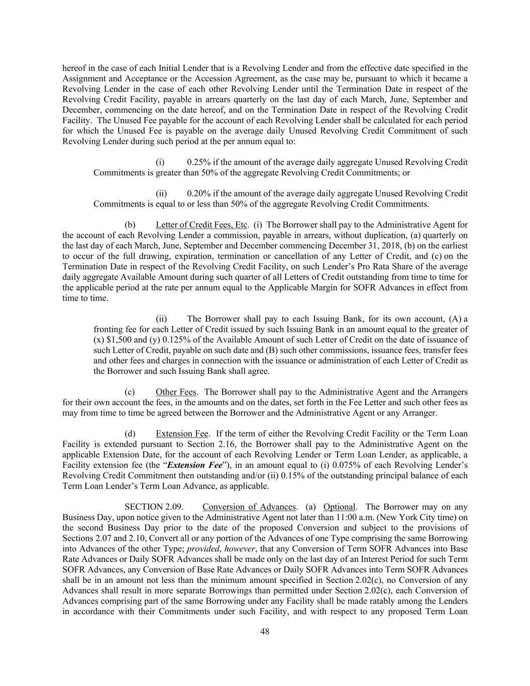 48 hereof in the case of each Initial Lender that is a Revolving Lender and from the effective date specified in the Assignment and Acceptance or the Accession Agreement, as the case may be, pursuant to which it became a Revolving Lender in the case of each other Revolving Lender until the Termination Date in respect of the Revolving Credit Facility, payable in arrears quarterly on the last day of each March, June, September and December, commencing on the date hereof, and on the Termination Date in respect of the Revolving Credit Facility. The Unused Fee payable for the account of each Revolving Lender shall be calculated for each period for which the Unused Fee is payable on the average daily Unused Revolving Credit Commitment of such Revolving Lender during such period at the per annum equal to: (i) 0.25% if the amount of the average daily aggregate Unused Revolving Credit Commitments is greater than 50% of the aggregate Revolving Credit Commitments; or (ii) 0.20% if the amount of the average daily aggregate Unused Revolving Credit Commitments is equal to or less than 50% of the aggregate Revolving Credit Commitments. (b) Letter of Credit Fees, Etc. (i) The Borrower shall pay to the Administrative Agent for the account of each Revolving Lender a commission, payable in arrears, without duplication, (a) quarterly on the last day of each March, June, September and December commencing December 31, 2018, (b) on the earliest to occur of the full drawing, expiration, termination or cancellation of any Letter of Credit, and (c) on the Termination Date in respect of the Revolving Credit Facility, on such Lender’s Pro Rata Share of the average daily aggregate Available Amount during such quarter of all Letters of Credit outstanding from time to time for the applicable period at the rate per annum equal to the Applicable Margin for SOFR Advances in effect from time to time. (ii) The Borrower shall pay to each Issuing Bank, for its own account, (A) a fronting fee for each Letter of Credit issued by such Issuing Bank in an amount equal to the greater of (x) $1,500 and (y) 0.125% of the Available Amount of such Letter of Credit on the date of issuance of such Letter of Credit, payable on such date and (B) such other commissions, issuance fees, transfer fees and other fees and charges in connection with the issuance or administration of each Letter of Credit as the Borrower and such Issuing Bank shall agree. (c) Other Fees. The Borrower shall pay to the Administrative Agent and the Arrangers for their own account the fees, in the amounts and on the dates, set forth in the Fee Letter and such other fees as may from time to time be agreed between the Borrower and the Administrative Agent or any Arranger. (d) Extension Fee. If the term of either the Revolving Credit Facility or the Term Loan Facility is extended pursuant to Section 2.16, the Borrower shall pay to the Administrative Agent on the applicable Extension Date, for the account of each Revolving Lender or Term Loan Lender, as applicable, a Facility extension fee (the “Extension Fee”), in an amount equal to (i) 0.075% of each Revolving Lender’s Revolving Credit Commitment then outstanding and/or (ii) 0.15% of the outstanding principal balance of each Term Loan Lender’s Term Loan Advance, as applicable. SECTION 2.09. Conversion of Advances. (a) Optional. The Borrower may on any Business Day, upon notice given to the Administrative Agent not later than 11:00 a.m. (New York City time) on the second Business Day prior to the date of the proposed Conversion and subject to the provisions of Sections 2.07 and 2.10, Convert all or any portion of the Advances of one Type comprising the same Borrowing into Advances of the other Type; provided, however, that any Conversion of Term SOFR Advances into Base Rate Advances or Daily SOFR Advances shall be made only on the last day of an Interest Period for such Term SOFR Advances, any Conversion of Base Rate Advances or Daily SOFR Advances into Term SOFR Advances shall be in an amount not less than the minimum amount specified in Section 2.02(c), no Conversion of any Advances shall result in more separate Borrowings than permitted under Section 2.02(c), each Conversion of Advances comprising part of the same Borrowing under any Facility shall be made ratably among the Lenders in accordance with their Commitments under such Facility, and with respect to any proposed Term Loan