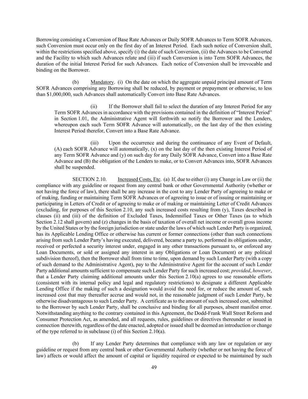 49 Borrowing consisting a Conversion of Base Rate Advances or Daily SOFR Advances to Term SOFR Advances, such Conversion must occur only on the first day of an Interest Period. Each such notice of Conversion shall, within the restrictions specified above, specify (i) the date of such Conversion, (ii) the Advances to be Converted and the Facility to which such Advances relate and (iii) if such Conversion is into Term SOFR Advances, the duration of the initial Interest Period for such Advances. Each notice of Conversion shall be irrevocable and binding on the Borrower. (b) Mandatory. (i) On the date on which the aggregate unpaid principal amount of Term SOFR Advances comprising any Borrowing shall be reduced, by payment or prepayment or otherwise, to less than $1,000,000, such Advances shall automatically Convert into Base Rate Advances. (ii) If the Borrower shall fail to select the duration of any Interest Period for any Term SOFR Advances in accordance with the provisions contained in the definition of “Interest Period” in Section 1.01, the Administrative Agent will forthwith so notify the Borrower and the Lenders, whereupon each such Term SOFR Advance will automatically, on the last day of the then existing Interest Period therefor, Convert into a Base Rate Advance. (iii) Upon the occurrence and during the continuance of any Event of Default, (A) each SOFR Advance will automatically, (x) on the last day of the then existing Interest Period of any Term SOFR Advance and (y) on such day for any Daily SOFR Advance, Convert into a Base Rate Advance and (B) the obligation of the Lenders to make, or to Convert Advances into, SOFR Advances shall be suspended. SECTION 2.10. Increased Costs, Etc. (a) If, due to either (i) any Change in Law or (ii) the compliance with any guideline or request from any central bank or other Governmental Authority (whether or not having the force of law), there shall be any increase in the cost to any Lender Party of agreeing to make or of making, funding or maintaining Term SOFR Advances or of agreeing to issue or of issuing or maintaining or participating in Letters of Credit or of agreeing to make or of making or maintaining Letter of Credit Advances (excluding, for purposes of this Section 2.10, any such increased costs resulting from (y), Taxes described in clauses (ii) and (iii) of the definition of Excluded Taxes, Indemnified Taxes or Other Taxes (as to which Section 2.12 shall govern) and (z) changes in the basis of taxation of overall net income or overall gross income by the United States or by the foreign jurisdiction or state under the laws of which such Lender Party is organized, has its Applicable Lending Office or otherwise has current or former connections (other than such connections arising from such Lender Party’s having executed, delivered, became a party to, performed its obligations under, received or perfected a security interest under, engaged in any other transactions pursuant to, or enforced any Loan Documents, or sold or assigned any interest in any Obligations or Loan Document) or any political subdivision thereof), then the Borrower shall from time to time, upon demand by such Lender Party (with a copy of such demand to the Administrative Agent), pay to the Administrative Agent for the account of such Lender Party additional amounts sufficient to compensate such Lender Party for such increased cost; provided, however, that a Lender Party claiming additional amounts under this Section 2.10(a) agrees to use reasonable efforts (consistent with its internal policy and legal and regulatory restrictions) to designate a different Applicable Lending Office if the making of such a designation would avoid the need for, or reduce the amount of, such increased cost that may thereafter accrue and would not, in the reasonable judgment of such Lender Party, be otherwise disadvantageous to such Lender Party. A certificate as to the amount of such increased cost, submitted to the Borrower by such Lender Party, shall be conclusive and binding for all purposes, absent manifest error. Notwithstanding anything to the contrary contained in this Agreement, the Dodd-Frank Wall Street Reform and Consumer Protection Act, as amended, and all requests, rules, guidelines or directives thereunder or issued in connection therewith, regardless of the date enacted, adopted or issued shall be deemed an introduction or change of the type referred to in subclause (i) of this Section 2.10(a). (b) If any Lender Party determines that compliance with any law or regulation or any guideline or request from any central bank or other Governmental Authority (whether or not having the force of law) affects or would affect the amount of capital or liquidity required or expected to be maintained by such