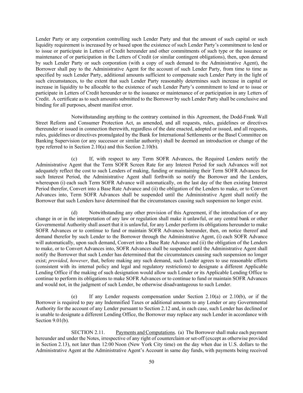 50 Lender Party or any corporation controlling such Lender Party and that the amount of such capital or such liquidity requirement is increased by or based upon the existence of such Lender Party’s commitment to lend or to issue or participate in Letters of Credit hereunder and other commitments of such type or the issuance or maintenance of or participation in the Letters of Credit (or similar contingent obligations), then, upon demand by such Lender Party or such corporation (with a copy of such demand to the Administrative Agent), the Borrower shall pay to the Administrative Agent for the account of such Lender Party, from time to time as specified by such Lender Party, additional amounts sufficient to compensate such Lender Party in the light of such circumstances, to the extent that such Lender Party reasonably determines such increase in capital or increase in liquidity to be allocable to the existence of such Lender Party’s commitment to lend or to issue or participate in Letters of Credit hereunder or to the issuance or maintenance of or participation in any Letters of Credit. A certificate as to such amounts submitted to the Borrower by such Lender Party shall be conclusive and binding for all purposes, absent manifest error. Notwithstanding anything to the contrary contained in this Agreement, the Dodd-Frank Wall Street Reform and Consumer Protection Act, as amended, and all requests, rules, guidelines or directives thereunder or issued in connection therewith, regardless of the date enacted, adopted or issued, and all requests, rules, guidelines or directives promulgated by the Bank for International Settlements or the Basel Committee on Banking Supervision (or any successor or similar authority) shall be deemed an introduction or change of the type referred to in Section 2.10(a) and this Section 2.10(b). (c) If, with respect to any Term SOFR Advances, the Required Lenders notify the Administrative Agent that the Term SOFR Screen Rate for any Interest Period for such Advances will not adequately reflect the cost to such Lenders of making, funding or maintaining their Term SOFR Advances for such Interest Period, the Administrative Agent shall forthwith so notify the Borrower and the Lenders, whereupon (i) each such Term SOFR Advance will automatically, on the last day of the then existing Interest Period therefor, Convert into a Base Rate Advance and (ii) the obligation of the Lenders to make, or to Convert Advances into, Term SOFR Advances shall be suspended until the Administrative Agent shall notify the Borrower that such Lenders have determined that the circumstances causing such suspension no longer exist. (d) Notwithstanding any other provision of this Agreement, if the introduction of or any change in or in the interpretation of any law or regulation shall make it unlawful, or any central bank or other Governmental Authority shall assert that it is unlawful, for any Lender perform its obligations hereunder to make SOFR Advances or to continue to fund or maintain SOFR Advances hereunder, then, on notice thereof and demand therefor by such Lender to the Borrower through the Administrative Agent, (i) each SOFR Advance will automatically, upon such demand, Convert into a Base Rate Advance and (ii) the obligation of the Lenders to make, or to Convert Advances into, SOFR Advances shall be suspended until the Administrative Agent shall notify the Borrower that such Lender has determined that the circumstances causing such suspension no longer exist; provided, however, that, before making any such demand, such Lender agrees to use reasonable efforts (consistent with its internal policy and legal and regulatory restrictions) to designate a different Applicable Lending Office if the making of such designation would allow such Lender or its Applicable Lending Office to continue to perform its obligations to make SOFR Advances or to continue to fund or maintain SOFR Advances and would not, in the judgment of such Lender, be otherwise disadvantageous to such Lender. (e) If any Lender requests compensation under Section 2.10(a) or 2.10(b), or if the Borrower is required to pay any Indemnified Taxes or additional amounts to any Lender or any Governmental Authority for the account of any Lender pursuant to Section 2.12 and, in each case, such Lender has declined or is unable to designate a different Lending Office, the Borrower may replace any such Lender in accordance with Section 9.01(b). SECTION 2.11. Payments and Computations. (a) The Borrower shall make each payment hereunder and under the Notes, irrespective of any right of counterclaim or set-off (except as otherwise provided in Section 2.13), not later than 12:00 Noon (New York City time) on the day when due in U.S. dollars to the Administrative Agent at the Administrative Agent’s Account in same day funds, with payments being received