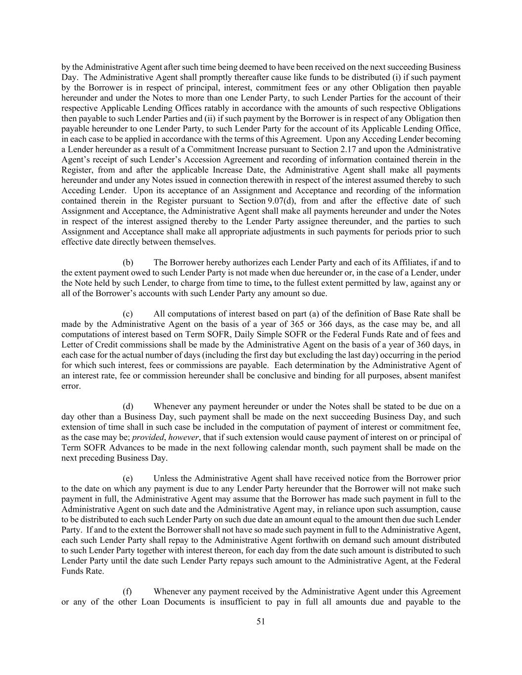 51 by the Administrative Agent after such time being deemed to have been received on the next succeeding Business Day. The Administrative Agent shall promptly thereafter cause like funds to be distributed (i) if such payment by the Borrower is in respect of principal, interest, commitment fees or any other Obligation then payable hereunder and under the Notes to more than one Lender Party, to such Lender Parties for the account of their respective Applicable Lending Offices ratably in accordance with the amounts of such respective Obligations then payable to such Lender Parties and (ii) if such payment by the Borrower is in respect of any Obligation then payable hereunder to one Lender Party, to such Lender Party for the account of its Applicable Lending Office, in each case to be applied in accordance with the terms of this Agreement. Upon any Acceding Lender becoming a Lender hereunder as a result of a Commitment Increase pursuant to Section 2.17 and upon the Administrative Agent’s receipt of such Lender’s Accession Agreement and recording of information contained therein in the Register, from and after the applicable Increase Date, the Administrative Agent shall make all payments hereunder and under any Notes issued in connection therewith in respect of the interest assumed thereby to such Acceding Lender. Upon its acceptance of an Assignment and Acceptance and recording of the information contained therein in the Register pursuant to Section 9.07(d), from and after the effective date of such Assignment and Acceptance, the Administrative Agent shall make all payments hereunder and under the Notes in respect of the interest assigned thereby to the Lender Party assignee thereunder, and the parties to such Assignment and Acceptance shall make all appropriate adjustments in such payments for periods prior to such effective date directly between themselves. (b) The Borrower hereby authorizes each Lender Party and each of its Affiliates, if and to the extent payment owed to such Lender Party is not made when due hereunder or, in the case of a Lender, under the Note held by such Lender, to charge from time to time, to the fullest extent permitted by law, against any or all of the Borrower’s accounts with such Lender Party any amount so due. (c) All computations of interest based on part (a) of the definition of Base Rate shall be made by the Administrative Agent on the basis of a year of 365 or 366 days, as the case may be, and all computations of interest based on Term SOFR, Daily Simple SOFR or the Federal Funds Rate and of fees and Letter of Credit commissions shall be made by the Administrative Agent on the basis of a year of 360 days, in each case for the actual number of days (including the first day but excluding the last day) occurring in the period for which such interest, fees or commissions are payable. Each determination by the Administrative Agent of an interest rate, fee or commission hereunder shall be conclusive and binding for all purposes, absent manifest error. (d) Whenever any payment hereunder or under the Notes shall be stated to be due on a day other than a Business Day, such payment shall be made on the next succeeding Business Day, and such extension of time shall in such case be included in the computation of payment of interest or commitment fee, as the case may be; provided, however, that if such extension would cause payment of interest on or principal of Term SOFR Advances to be made in the next following calendar month, such payment shall be made on the next preceding Business Day. (e) Unless the Administrative Agent shall have received notice from the Borrower prior to the date on which any payment is due to any Lender Party hereunder that the Borrower will not make such payment in full, the Administrative Agent may assume that the Borrower has made such payment in full to the Administrative Agent on such date and the Administrative Agent may, in reliance upon such assumption, cause to be distributed to each such Lender Party on such due date an amount equal to the amount then due such Lender Party. If and to the extent the Borrower shall not have so made such payment in full to the Administrative Agent, each such Lender Party shall repay to the Administrative Agent forthwith on demand such amount distributed to such Lender Party together with interest thereon, for each day from the date such amount is distributed to such Lender Party until the date such Lender Party repays such amount to the Administrative Agent, at the Federal Funds Rate. (f) Whenever any payment received by the Administrative Agent under this Agreement or any of the other Loan Documents is insufficient to pay in full all amounts due and payable to the