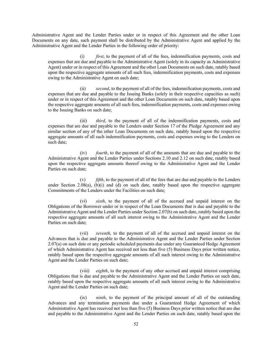 52 Administrative Agent and the Lender Parties under or in respect of this Agreement and the other Loan Documents on any date, such payment shall be distributed by the Administrative Agent and applied by the Administrative Agent and the Lender Parties in the following order of priority: (i) first, to the payment of all of the fees, indemnification payments, costs and expenses that are due and payable to the Administrative Agent (solely in its capacity as Administrative Agent) under or in respect of this Agreement and the other Loan Documents on such date, ratably based upon the respective aggregate amounts of all such fees, indemnification payments, costs and expenses owing to the Administrative Agent on such date; (ii) second, to the payment of all of the fees, indemnification payments, costs and expenses that are due and payable to the Issuing Banks (solely in their respective capacities as such) under or in respect of this Agreement and the other Loan Documents on such date, ratably based upon the respective aggregate amounts of all such fees, indemnification payments, costs and expenses owing to the Issuing Banks on such date; (iii) third, to the payment of all of the indemnification payments, costs and expenses that are due and payable to the Lenders under Section 17 of the Pledge Agreement and any similar section of any of the other Loan Documents on such date, ratably based upon the respective aggregate amounts of all such indemnification payments, costs and expenses owing to the Lenders on such date; (iv) fourth, to the payment of all of the amounts that are due and payable to the Administrative Agent and the Lender Parties under Sections 2.10 and 2.12 on such date, ratably based upon the respective aggregate amounts thereof owing to the Administrative Agent and the Lender Parties on such date; (v) fifth, to the payment of all of the fees that are due and payable to the Lenders under Section 2.08(a), (b)(i) and (d) on such date, ratably based upon the respective aggregate Commitments of the Lenders under the Facilities on such date; (vi) sixth, to the payment of all of the accrued and unpaid interest on the Obligations of the Borrower under or in respect of the Loan Documents that is due and payable to the Administrative Agent and the Lender Parties under Section 2.07(b) on such date, ratably based upon the respective aggregate amounts of all such interest owing to the Administrative Agent and the Lender Parties on such date; (vii) seventh, to the payment of all of the accrued and unpaid interest on the Advances that is due and payable to the Administrative Agent and the Lender Parties under Section 2.07(a) on such date or any periodic scheduled payments due under any Guaranteed Hedge Agreement of which Administrative Agent has received not less than five (5) Business Days prior written notice, ratably based upon the respective aggregate amounts of all such interest owing to the Administrative Agent and the Lender Parties on such date; (viii) eighth, to the payment of any other accrued and unpaid interest comprising Obligations that is due and payable to the Administrative Agent and the Lender Parties on such date, ratably based upon the respective aggregate amounts of all such interest owing to the Administrative Agent and the Lender Parties on such date; (ix) ninth, to the payment of the principal amount of all of the outstanding Advances and any termination payments due under a Guaranteed Hedge Agreement of which Administrative Agent has received not less than five (5) Business Days prior written notice that are due and payable to the Administrative Agent and the Lender Parties on such date, ratably based upon the