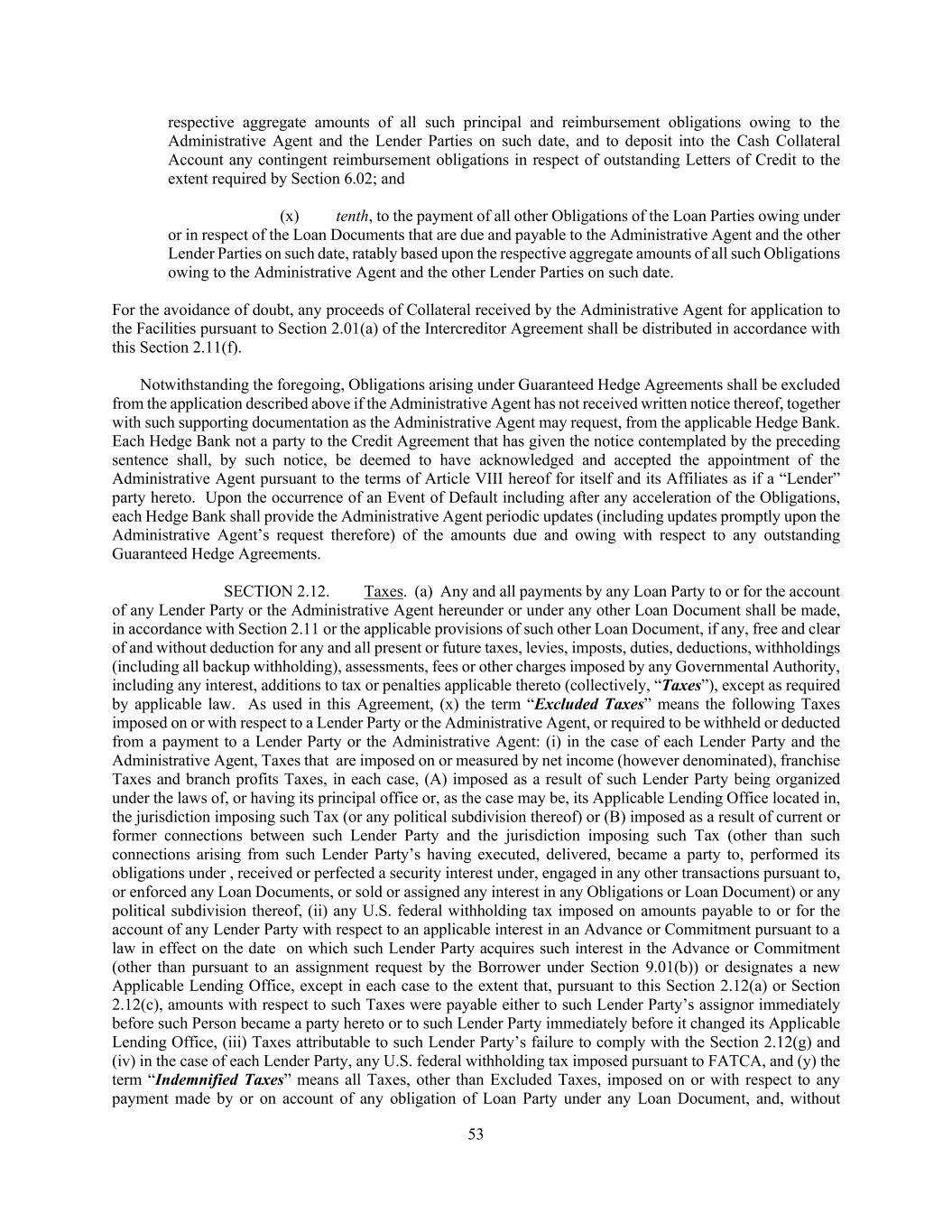 53 respective aggregate amounts of all such principal and reimbursement obligations owing to the Administrative Agent and the Lender Parties on such date, and to deposit into the Cash Collateral Account any contingent reimbursement obligations in respect of outstanding Letters of Credit to the extent required by Section 6.02; and (x) tenth, to the payment of all other Obligations of the Loan Parties owing under or in respect of the Loan Documents that are due and payable to the Administrative Agent and the other Lender Parties on such date, ratably based upon the respective aggregate amounts of all such Obligations owing to the Administrative Agent and the other Lender Parties on such date. For the avoidance of doubt, any proceeds of Collateral received by the Administrative Agent for application to the Facilities pursuant to Section 2.01(a) of the Intercreditor Agreement shall be distributed in accordance with this Section 2.11(f). Notwithstanding the foregoing, Obligations arising under Guaranteed Hedge Agreements shall be excluded from the application described above if the Administrative Agent has not received written notice thereof, together with such supporting documentation as the Administrative Agent may request, from the applicable Hedge Bank. Each Hedge Bank not a party to the Credit Agreement that has given the notice contemplated by the preceding sentence shall, by such notice, be deemed to have acknowledged and accepted the appointment of the Administrative Agent pursuant to the terms of Article VIII hereof for itself and its Affiliates as if a “Lender” party hereto. Upon the occurrence of an Event of Default including after any acceleration of the Obligations, each Hedge Bank shall provide the Administrative Agent periodic updates (including updates promptly upon the Administrative Agent’s request therefore) of the amounts due and owing with respect to any outstanding Guaranteed Hedge Agreements. SECTION 2.12. Taxes. (a) Any and all payments by any Loan Party to or for the account of any Lender Party or the Administrative Agent hereunder or under any other Loan Document shall be made, in accordance with Section 2.11 or the applicable provisions of such other Loan Document, if any, free and clear of and without deduction for any and all present or future taxes, levies, imposts, duties, deductions, withholdings (including all backup withholding), assessments, fees or other charges imposed by any Governmental Authority, including any interest, additions to tax or penalties applicable thereto (collectively, “Taxes”), except as required by applicable law. As used in this Agreement, (x) the term “Excluded Taxes” means the following Taxes imposed on or with respect to a Lender Party or the Administrative Agent, or required to be withheld or deducted from a payment to a Lender Party or the Administrative Agent: (i) in the case of each Lender Party and the Administrative Agent, Taxes that are imposed on or measured by net income (however denominated), franchise Taxes and branch profits Taxes, in each case, (A) imposed as a result of such Lender Party being organized under the laws of, or having its principal office or, as the case may be, its Applicable Lending Office located in, the jurisdiction imposing such Tax (or any political subdivision thereof) or (B) imposed as a result of current or former connections between such Lender Party and the jurisdiction imposing such Tax (other than such connections arising from such Lender Party’s having executed, delivered, became a party to, performed its obligations under , received or perfected a security interest under, engaged in any other transactions pursuant to, or enforced any Loan Documents, or sold or assigned any interest in any Obligations or Loan Document) or any political subdivision thereof, (ii) any U.S. federal withholding tax imposed on amounts payable to or for the account of any Lender Party with respect to an applicable interest in an Advance or Commitment pursuant to a law in effect on the date on which such Lender Party acquires such interest in the Advance or Commitment (other than pursuant to an assignment request by the Borrower under Section 9.01(b)) or designates a new Applicable Lending Office, except in each case to the extent that, pursuant to this Section 2.12(a) or Section 2.12(c), amounts with respect to such Taxes were payable either to such Lender Party’s assignor immediately before such Person became a party hereto or to such Lender Party immediately before it changed its Applicable Lending Office, (iii) Taxes attributable to such Lender Party’s failure to comply with the Section 2.12(g) and (iv) in the case of each Lender Party, any U.S. federal withholding tax imposed pursuant to FATCA, and (y) the term “Indemnified Taxes” means all Taxes, other than Excluded Taxes, imposed on or with respect to any payment made by or on account of any obligation of Loan Party under any Loan Document, and, without