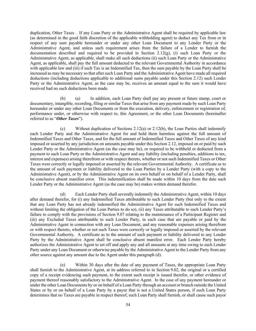 54 duplication, Other Taxes . If any Loan Party or the Administrative Agent shall be required by applicable law (as determined in the good faith discretion of the applicable withholding agent) to deduct any Tax from or in respect of any sum payable hereunder or under any other Loan Document to any Lender Party or the Administrative Agent, and unless such requirement arises from the failure of a Lender to furnish the documentation described and required to be provided in Section 2.12(g), (i) such Loan Party or the Administrative Agent, as applicable, shall make all such deductions (ii) such Loan Party or the Administrative Agent, as applicable, shall pay the full amount deducted to the relevant Governmental Authority in accordance with applicable law and (iii) if such Tax is an Indemnified Tax, then the sum payable by the Loan Party shall be increased as may be necessary so that after such Loan Party and the Administrative Agent have made all required deductions (including deductions applicable to additional sums payable under this Section 2.12) such Lender Party or the Administrative Agent, as the case may be, receives an amount equal to the sum it would have received had no such deductions been made. (b) (a) In addition, each Loan Party shall pay any present or future stamp, court or documentary, intangible, recording, filing or similar Taxes that arise from any payment made by such Loan Party hereunder or under any other Loan Documents or from the execution, delivery, enforcement or registration of, performance under, or otherwise with respect to, this Agreement, or the other Loan Documents (hereinafter referred to as “Other Taxes”). (c) Without duplication of Sections 2.12(a) or 2.12(b), the Loan Parties shall indemnify each Lender Party and the Administrative Agent for and hold them harmless against the full amount of Indemnified Taxes and Other Taxes, and for the full amount of Indemnified Taxes and Other Taxes of any kind imposed or asserted by any jurisdiction on amounts payable under this Section 2.12, imposed on or paid by such Lender Party or the Administrative Agent (as the case may be), or required to be withheld or deducted from a payment to such Loan Party or the Administrative Agent and any liability (including penalties, additions to tax, interest and expenses) arising therefrom or with respect thereto, whether or not such Indemnified Taxes or Other Taxes were correctly or legally imposed or asserted by the relevant Governmental Authority. A certificate as to the amount of such payment or liability delivered to the Loan Parties by a Lender Party (with a copy to the Administrative Agent), or by the Administrative Agent on its own behalf or on behalf of a Lender Party, shall be conclusive absent manifest error. This indemnification shall be made within 10 days from the date such Lender Party or the Administrative Agent (as the case may be) makes written demand therefor. (d) Each Lender Party shall severally indemnify the Administrative Agent, within 10 days after demand therefor, for (i) any Indemnified Taxes attributable to such Lender Party (but only to the extent that any Loan Party has not already indemnified the Administrative Agent for such Indemnified Taxes and without limiting the obligation of the Loan Parties to do so), (ii) any Taxes attributable to such Lender Party’s failure to comply with the provisions of Section 9.07 relating to the maintenance of a Participant Register and (iii) any Excluded Taxes attributable to such Lender Party, in each case that are payable or paid by the Administrative Agent in connection with any Loan Document, and any reasonable expenses arising therefrom or with respect thereto, whether or not such Taxes were correctly or legally imposed or asserted by the relevant Governmental Authority. A certificate as to the amount of such payment or liability delivered to any Lender Party by the Administrative Agent shall be conclusive absent manifest error. Each Lender Party hereby authorizes the Administrative Agent to set off and apply any and all amounts at any time owing to such Lender Party under any Loan Document or otherwise payable by the Administrative Agent to the Lender Party from any other source against any amount due to the Agent under this paragraph (d). (e) Within 30 days after the date of any payment of Taxes, the appropriate Loan Party shall furnish to the Administrative Agent, at its address referred to in Section 9.02, the original or a certified copy of a receipt evidencing such payment, to the extent such receipt is issued therefor, or other evidence of payment thereof reasonably satisfactory to the Administrative Agent. In the case of any payment hereunder or under the other Loan Documents by or on behalf of a Loan Party through an account or branch outside the United States or by or on behalf of a Loan Party by a payor that is not a United States person, if such Loan Party determines that no Taxes are payable in respect thereof, such Loan Party shall furnish, or shall cause such payor