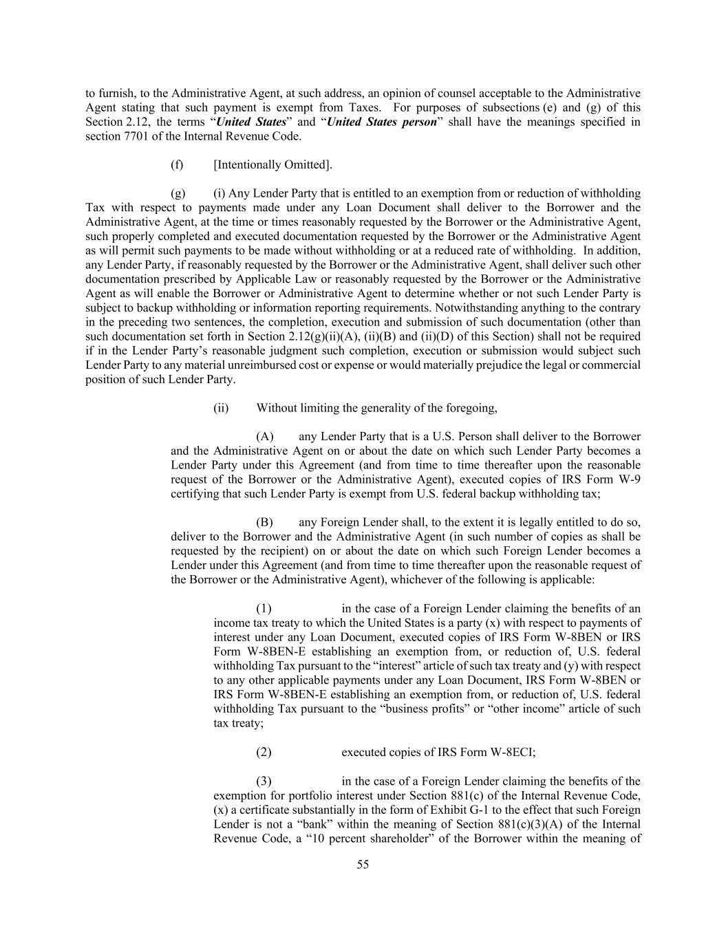 55 to furnish, to the Administrative Agent, at such address, an opinion of counsel acceptable to the Administrative Agent stating that such payment is exempt from Taxes. For purposes of subsections (e) and (g) of this Section 2.12, the terms “United States” and “United States person” shall have the meanings specified in section 7701 of the Internal Revenue Code. (f) [Intentionally Omitted]. (g) (i) Any Lender Party that is entitled to an exemption from or reduction of withholding Tax with respect to payments made under any Loan Document shall deliver to the Borrower and the Administrative Agent, at the time or times reasonably requested by the Borrower or the Administrative Agent, such properly completed and executed documentation requested by the Borrower or the Administrative Agent as will permit such payments to be made without withholding or at a reduced rate of withholding. In addition, any Lender Party, if reasonably requested by the Borrower or the Administrative Agent, shall deliver such other documentation prescribed by Applicable Law or reasonably requested by the Borrower or the Administrative Agent as will enable the Borrower or Administrative Agent to determine whether or not such Lender Party is subject to backup withholding or information reporting requirements. Notwithstanding anything to the contrary in the preceding two sentences, the completion, execution and submission of such documentation (other than such documentation set forth in Section 2.12(g)(ii)(A), (ii)(B) and (ii)(D) of this Section) shall not be required if in the Lender Party’s reasonable judgment such completion, execution or submission would subject such Lender Party to any material unreimbursed cost or expense or would materially prejudice the legal or commercial position of such Lender Party. (ii) Without limiting the generality of the foregoing, (A) any Lender Party that is a U.S. Person shall deliver to the Borrower and the Administrative Agent on or about the date on which such Lender Party becomes a Lender Party under this Agreement (and from time to time thereafter upon the reasonable request of the Borrower or the Administrative Agent), executed copies of IRS Form W-9 certifying that such Lender Party is exempt from U.S. federal backup withholding tax; (B) any Foreign Lender shall, to the extent it is legally entitled to do so, deliver to the Borrower and the Administrative Agent (in such number of copies as shall be requested by the recipient) on or about the date on which such Foreign Lender becomes a Lender under this Agreement (and from time to time thereafter upon the reasonable request of the Borrower or the Administrative Agent), whichever of the following is applicable: (1) in the case of a Foreign Lender claiming the benefits of an income tax treaty to which the United States is a party (x) with respect to payments of interest under any Loan Document, executed copies of IRS Form W-8BEN or IRS Form W-8BEN-E establishing an exemption from, or reduction of, U.S. federal withholding Tax pursuant to the “interest” article of such tax treaty and (y) with respect to any other applicable payments under any Loan Document, IRS Form W-8BEN or IRS Form W-8BEN-E establishing an exemption from, or reduction of, U.S. federal withholding Tax pursuant to the “business profits” or “other income” article of such tax treaty; (2) executed copies of IRS Form W-8ECI; (3) in the case of a Foreign Lender claiming the benefits of the exemption for portfolio interest under Section 881(c) of the Internal Revenue Code, (x) a certificate substantially in the form of Exhibit G-1 to the effect that such Foreign Lender is not a “bank” within the meaning of Section 881(c)(3)(A) of the Internal Revenue Code, a “10 percent shareholder” of the Borrower within the meaning of