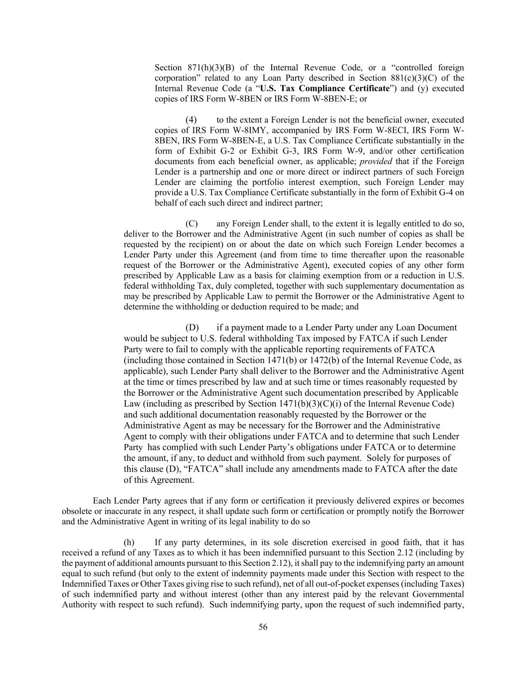 56 Section 871(h)(3)(B) of the Internal Revenue Code, or a “controlled foreign corporation” related to any Loan Party described in Section 881(c)(3)(C) of the Internal Revenue Code (a “U.S. Tax Compliance Certificate”) and (y) executed copies of IRS Form W-8BEN or IRS Form W-8BEN-E; or (4) to the extent a Foreign Lender is not the beneficial owner, executed copies of IRS Form W-8IMY, accompanied by IRS Form W-8ECI, IRS Form W- 8BEN, IRS Form W-8BEN-E, a U.S. Tax Compliance Certificate substantially in the form of Exhibit G-2 or Exhibit G-3, IRS Form W-9, and/or other certification documents from each beneficial owner, as applicable; provided that if the Foreign Lender is a partnership and one or more direct or indirect partners of such Foreign Lender are claiming the portfolio interest exemption, such Foreign Lender may provide a U.S. Tax Compliance Certificate substantially in the form of Exhibit G-4 on behalf of each such direct and indirect partner; (C) any Foreign Lender shall, to the extent it is legally entitled to do so, deliver to the Borrower and the Administrative Agent (in such number of copies as shall be requested by the recipient) on or about the date on which such Foreign Lender becomes a Lender Party under this Agreement (and from time to time thereafter upon the reasonable request of the Borrower or the Administrative Agent), executed copies of any other form prescribed by Applicable Law as a basis for claiming exemption from or a reduction in U.S. federal withholding Tax, duly completed, together with such supplementary documentation as may be prescribed by Applicable Law to permit the Borrower or the Administrative Agent to determine the withholding or deduction required to be made; and (D) if a payment made to a Lender Party under any Loan Document would be subject to U.S. federal withholding Tax imposed by FATCA if such Lender Party were to fail to comply with the applicable reporting requirements of FATCA (including those contained in Section 1471(b) or 1472(b) of the Internal Revenue Code, as applicable), such Lender Party shall deliver to the Borrower and the Administrative Agent at the time or times prescribed by law and at such time or times reasonably requested by the Borrower or the Administrative Agent such documentation prescribed by Applicable Law (including as prescribed by Section 1471(b)(3)(C)(i) of the Internal Revenue Code) and such additional documentation reasonably requested by the Borrower or the Administrative Agent as may be necessary for the Borrower and the Administrative Agent to comply with their obligations under FATCA and to determine that such Lender Party has complied with such Lender Party’s obligations under FATCA or to determine the amount, if any, to deduct and withhold from such payment. Solely for purposes of this clause (D), “FATCA” shall include any amendments made to FATCA after the date of this Agreement. Each Lender Party agrees that if any form or certification it previously delivered expires or becomes obsolete or inaccurate in any respect, it shall update such form or certification or promptly notify the Borrower and the Administrative Agent in writing of its legal inability to do so (h) If any party determines, in its sole discretion exercised in good faith, that it has received a refund of any Taxes as to which it has been indemnified pursuant to this Section 2.12 (including by the payment of additional amounts pursuant to this Section 2.12), it shall pay to the indemnifying party an amount equal to such refund (but only to the extent of indemnity payments made under this Section with respect to the Indemnified Taxes or Other Taxes giving rise to such refund), net of all out-of-pocket expenses (including Taxes) of such indemnified party and without interest (other than any interest paid by the relevant Governmental Authority with respect to such refund). Such indemnifying party, upon the request of such indemnified party,
