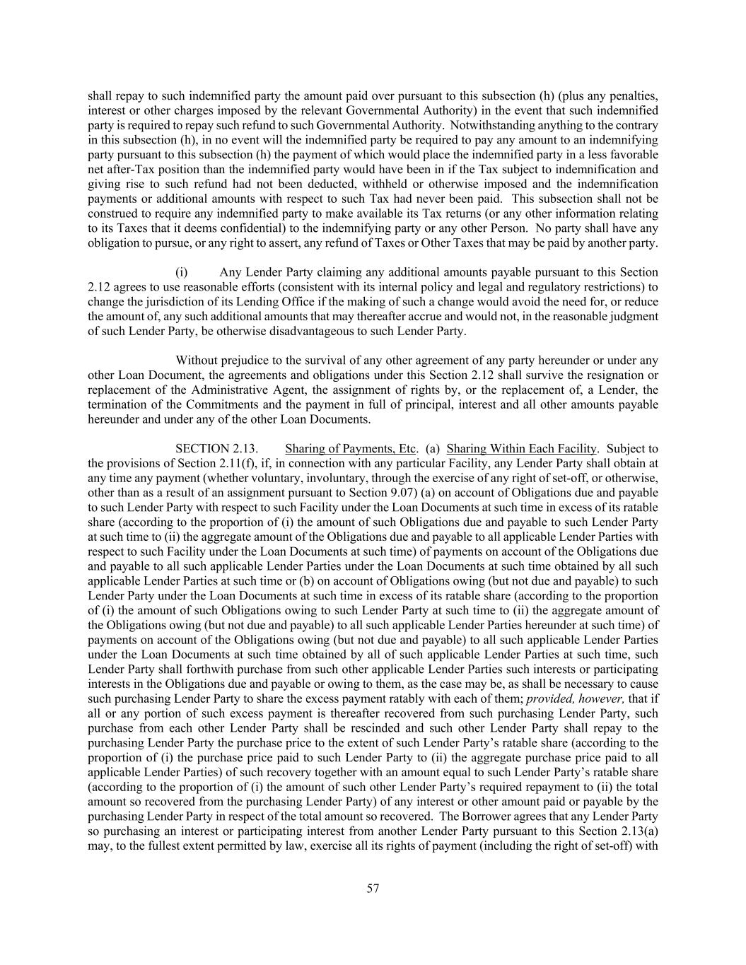 57 shall repay to such indemnified party the amount paid over pursuant to this subsection (h) (plus any penalties, interest or other charges imposed by the relevant Governmental Authority) in the event that such indemnified party is required to repay such refund to such Governmental Authority. Notwithstanding anything to the contrary in this subsection (h), in no event will the indemnified party be required to pay any amount to an indemnifying party pursuant to this subsection (h) the payment of which would place the indemnified party in a less favorable net after-Tax position than the indemnified party would have been in if the Tax subject to indemnification and giving rise to such refund had not been deducted, withheld or otherwise imposed and the indemnification payments or additional amounts with respect to such Tax had never been paid. This subsection shall not be construed to require any indemnified party to make available its Tax returns (or any other information relating to its Taxes that it deems confidential) to the indemnifying party or any other Person. No party shall have any obligation to pursue, or any right to assert, any refund of Taxes or Other Taxes that may be paid by another party. (i) Any Lender Party claiming any additional amounts payable pursuant to this Section 2.12 agrees to use reasonable efforts (consistent with its internal policy and legal and regulatory restrictions) to change the jurisdiction of its Lending Office if the making of such a change would avoid the need for, or reduce the amount of, any such additional amounts that may thereafter accrue and would not, in the reasonable judgment of such Lender Party, be otherwise disadvantageous to such Lender Party. Without prejudice to the survival of any other agreement of any party hereunder or under any other Loan Document, the agreements and obligations under this Section 2.12 shall survive the resignation or replacement of the Administrative Agent, the assignment of rights by, or the replacement of, a Lender, the termination of the Commitments and the payment in full of principal, interest and all other amounts payable hereunder and under any of the other Loan Documents. SECTION 2.13. Sharing of Payments, Etc. (a) Sharing Within Each Facility. Subject to the provisions of Section 2.11(f), if, in connection with any particular Facility, any Lender Party shall obtain at any time any payment (whether voluntary, involuntary, through the exercise of any right of set-off, or otherwise, other than as a result of an assignment pursuant to Section 9.07) (a) on account of Obligations due and payable to such Lender Party with respect to such Facility under the Loan Documents at such time in excess of its ratable share (according to the proportion of (i) the amount of such Obligations due and payable to such Lender Party at such time to (ii) the aggregate amount of the Obligations due and payable to all applicable Lender Parties with respect to such Facility under the Loan Documents at such time) of payments on account of the Obligations due and payable to all such applicable Lender Parties under the Loan Documents at such time obtained by all such applicable Lender Parties at such time or (b) on account of Obligations owing (but not due and payable) to such Lender Party under the Loan Documents at such time in excess of its ratable share (according to the proportion of (i) the amount of such Obligations owing to such Lender Party at such time to (ii) the aggregate amount of the Obligations owing (but not due and payable) to all such applicable Lender Parties hereunder at such time) of payments on account of the Obligations owing (but not due and payable) to all such applicable Lender Parties under the Loan Documents at such time obtained by all of such applicable Lender Parties at such time, such Lender Party shall forthwith purchase from such other applicable Lender Parties such interests or participating interests in the Obligations due and payable or owing to them, as the case may be, as shall be necessary to cause such purchasing Lender Party to share the excess payment ratably with each of them; provided, however, that if all or any portion of such excess payment is thereafter recovered from such purchasing Lender Party, such purchase from each other Lender Party shall be rescinded and such other Lender Party shall repay to the purchasing Lender Party the purchase price to the extent of such Lender Party’s ratable share (according to the proportion of (i) the purchase price paid to such Lender Party to (ii) the aggregate purchase price paid to all applicable Lender Parties) of such recovery together with an amount equal to such Lender Party’s ratable share (according to the proportion of (i) the amount of such other Lender Party’s required repayment to (ii) the total amount so recovered from the purchasing Lender Party) of any interest or other amount paid or payable by the purchasing Lender Party in respect of the total amount so recovered. The Borrower agrees that any Lender Party so purchasing an interest or participating interest from another Lender Party pursuant to this Section 2.13(a) may, to the fullest extent permitted by law, exercise all its rights of payment (including the right of set-off) with