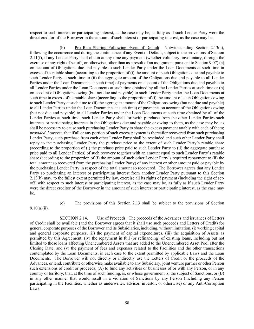 58 respect to such interest or participating interest, as the case may be, as fully as if such Lender Party were the direct creditor of the Borrower in the amount of such interest or participating interest, as the case may be. (b) Pro Rata Sharing Following Event of Default. Notwithstanding Section 2.13(a), following the occurrence and during the continuance of any Event of Default, subject to the provisions of Section 2.11(f), if any Lender Party shall obtain at any time any payment (whether voluntary, involuntary, through the exercise of any right of set off, or otherwise, other than as a result of an assignment pursuant to Section 9.07) (a) on account of Obligations due and payable to such Lender Party under the Loan Documents at such time in excess of its ratable share (according to the proportion of (i) the amount of such Obligations due and payable to such Lender Party at such time to (ii) the aggregate amount of the Obligations due and payable to all Lender Parties under the Loan Documents at such time) of payments on account of the Obligations due and payable to all Lender Parties under the Loan Documents at such time obtained by all the Lender Parties at such time or (b) on account of Obligations owing (but not due and payable) to such Lender Party under the Loan Documents at such time in excess of its ratable share (according to the proportion of (i) the amount of such Obligations owing to such Lender Party at such time to (ii) the aggregate amount of the Obligations owing (but not due and payable) to all Lender Parties under the Loan Documents at such time) of payments on account of the Obligations owing (but not due and payable) to all Lender Parties under the Loan Documents at such time obtained by all of the Lender Parties at such time, such Lender Party shall forthwith purchase from the other Lender Parties such interests or participating interests in the Obligations due and payable or owing to them, as the case may be, as shall be necessary to cause such purchasing Lender Party to share the excess payment ratably with each of them; provided, however, that if all or any portion of such excess payment is thereafter recovered from such purchasing Lender Party, such purchase from each other Lender Party shall be rescinded and such other Lender Party shall repay to the purchasing Lender Party the purchase price to the extent of such Lender Party’s ratable share (according to the proportion of (i) the purchase price paid to such Lender Party to (ii) the aggregate purchase price paid to all Lender Parties) of such recovery together with an amount equal to such Lender Party’s ratable share (according to the proportion of (i) the amount of such other Lender Party’s required repayment to (ii) the total amount so recovered from the purchasing Lender Party) of any interest or other amount paid or payable by the purchasing Lender Party in respect of the total amount so recovered. The Borrower agrees that any Lender Party so purchasing an interest or participating interest from another Lender Party pursuant to this Section 2.13(b) may, to the fullest extent permitted by law, exercise all its rights of payment (including the right of set- off) with respect to such interest or participating interest, as the case may be, as fully as if such Lender Party were the direct creditor of the Borrower in the amount of such interest or participating interest, as the case may be. (c) The provisions of this Section 2.13 shall be subject to the provisions of Section 9.10(a)(ii). SECTION 2.14. Use of Proceeds. The proceeds of the Advances and issuances of Letters of Credit shall be available (and the Borrower agrees that it shall use such proceeds and Letters of Credit) for general corporate purposes of the Borrower and its Subsidiaries, including, without limitation, (i) working capital and general corporate purposes, (ii) the payment of capital expenditures, (iii) the acquisition of Assets as permitted by this Agreement, (iv) the repayment in full (or refinancing) of existing loans, including but not limited to those loans affecting Unencumbered Assets that are added to the Unencumbered Asset Pool after the Closing Date, and (v) the payment of fees and expenses related to the Facilities and the other transactions contemplated by the Loan Documents, in each case to the extent permitted by applicable Laws and the Loan Documents. The Borrower will not directly or indirectly use the Letters of Credit or the proceeds of the Advances, or lend, contribute or otherwise make available to any Subsidiary, joint venture partner or other Person such extensions of credit or proceeds, (A) to fund any activities or businesses of or with any Person, or in any country or territory, that, at the time of such funding, is, or whose government is, the subject of Sanctions, or (B) in any other manner that would result in a violation of Sanctions by any Person (including any Person participating in the Facilities, whether as underwriter, advisor, investor, or otherwise) or any Anti-Corruption Laws.