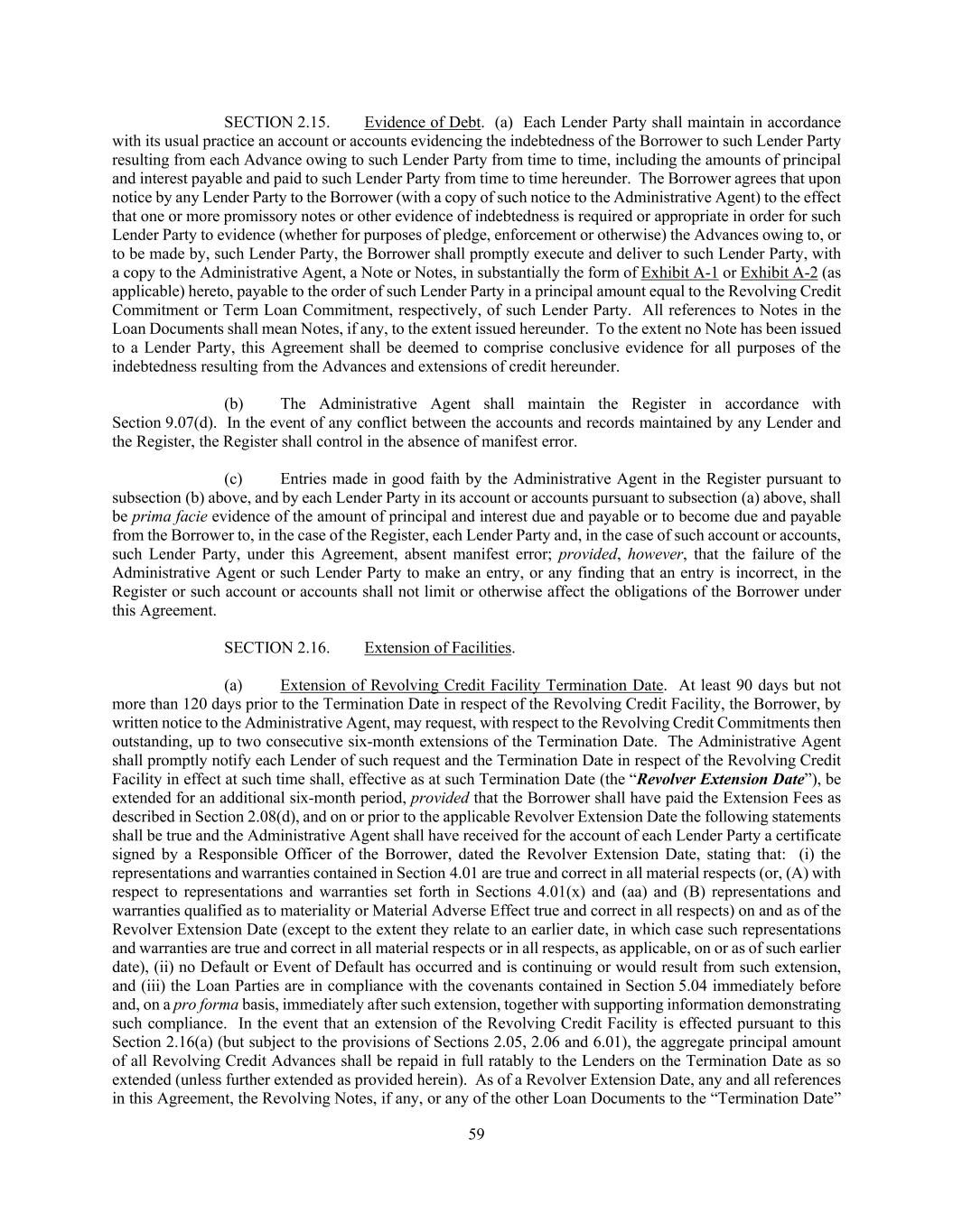59 SECTION 2.15. Evidence of Debt. (a) Each Lender Party shall maintain in accordance with its usual practice an account or accounts evidencing the indebtedness of the Borrower to such Lender Party resulting from each Advance owing to such Lender Party from time to time, including the amounts of principal and interest payable and paid to such Lender Party from time to time hereunder. The Borrower agrees that upon notice by any Lender Party to the Borrower (with a copy of such notice to the Administrative Agent) to the effect that one or more promissory notes or other evidence of indebtedness is required or appropriate in order for such Lender Party to evidence (whether for purposes of pledge, enforcement or otherwise) the Advances owing to, or to be made by, such Lender Party, the Borrower shall promptly execute and deliver to such Lender Party, with a copy to the Administrative Agent, a Note or Notes, in substantially the form of Exhibit A-1 or Exhibit A-2 (as applicable) hereto, payable to the order of such Lender Party in a principal amount equal to the Revolving Credit Commitment or Term Loan Commitment, respectively, of such Lender Party. All references to Notes in the Loan Documents shall mean Notes, if any, to the extent issued hereunder. To the extent no Note has been issued to a Lender Party, this Agreement shall be deemed to comprise conclusive evidence for all purposes of the indebtedness resulting from the Advances and extensions of credit hereunder. (b) The Administrative Agent shall maintain the Register in accordance with Section 9.07(d). In the event of any conflict between the accounts and records maintained by any Lender and the Register, the Register shall control in the absence of manifest error. (c) Entries made in good faith by the Administrative Agent in the Register pursuant to subsection (b) above, and by each Lender Party in its account or accounts pursuant to subsection (a) above, shall be prima facie evidence of the amount of principal and interest due and payable or to become due and payable from the Borrower to, in the case of the Register, each Lender Party and, in the case of such account or accounts, such Lender Party, under this Agreement, absent manifest error; provided, however, that the failure of the Administrative Agent or such Lender Party to make an entry, or any finding that an entry is incorrect, in the Register or such account or accounts shall not limit or otherwise affect the obligations of the Borrower under this Agreement. SECTION 2.16. Extension of Facilities. (a) Extension of Revolving Credit Facility Termination Date. At least 90 days but not more than 120 days prior to the Termination Date in respect of the Revolving Credit Facility, the Borrower, by written notice to the Administrative Agent, may request, with respect to the Revolving Credit Commitments then outstanding, up to two consecutive six-month extensions of the Termination Date. The Administrative Agent shall promptly notify each Lender of such request and the Termination Date in respect of the Revolving Credit Facility in effect at such time shall, effective as at such Termination Date (the “Revolver Extension Date”), be extended for an additional six-month period, provided that the Borrower shall have paid the Extension Fees as described in Section 2.08(d), and on or prior to the applicable Revolver Extension Date the following statements shall be true and the Administrative Agent shall have received for the account of each Lender Party a certificate signed by a Responsible Officer of the Borrower, dated the Revolver Extension Date, stating that: (i) the representations and warranties contained in Section 4.01 are true and correct in all material respects (or, (A) with respect to representations and warranties set forth in Sections 4.01(x) and (aa) and (B) representations and warranties qualified as to materiality or Material Adverse Effect true and correct in all respects) on and as of the Revolver Extension Date (except to the extent they relate to an earlier date, in which case such representations and warranties are true and correct in all material respects or in all respects, as applicable, on or as of such earlier date), (ii) no Default or Event of Default has occurred and is continuing or would result from such extension, and (iii) the Loan Parties are in compliance with the covenants contained in Section 5.04 immediately before and, on a pro forma basis, immediately after such extension, together with supporting information demonstrating such compliance. In the event that an extension of the Revolving Credit Facility is effected pursuant to this Section 2.16(a) (but subject to the provisions of Sections 2.05, 2.06 and 6.01), the aggregate principal amount of all Revolving Credit Advances shall be repaid in full ratably to the Lenders on the Termination Date as so extended (unless further extended as provided herein). As of a Revolver Extension Date, any and all references in this Agreement, the Revolving Notes, if any, or any of the other Loan Documents to the “Termination Date”