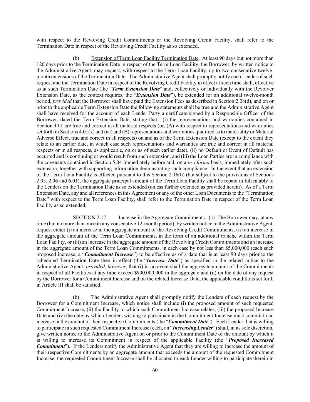 60 with respect to the Revolving Credit Commitments or the Revolving Credit Facility, shall refer to the Termination Date in respect of the Revolving Credit Facility as so extended. (b) Extension of Term Loan Facility Termination Date. At least 90 days but not more than 120 days prior to the Termination Date in respect of the Term Loan Facility, the Borrower, by written notice to the Administrative Agent, may request, with respect to the Term Loan Facility, up to two consecutive twelve- month extensions of the Termination Date. The Administrative Agent shall promptly notify each Lender of such request and the Termination Date in respect of the Revolving Credit Facility in effect at such time shall, effective as at such Termination Date (the “Term Extension Date” and, collectively or individually with the Revolver Extension Date, as the context requires, the “Extension Date”), be extended for an additional twelve-month period, provided that the Borrower shall have paid the Extension Fees as described in Section 2.08(d), and on or prior to the applicable Term Extension Date the following statements shall be true and the Administrative Agent shall have received for the account of each Lender Party a certificate signed by a Responsible Officer of the Borrower, dated the Term Extension Date, stating that: (i) the representations and warranties contained in Section 4.01 are true and correct in all material respects (or, (A) with respect to representations and warranties set forth in Sections 4.01(x) and (aa) and (B) representations and warranties qualified as to materiality or Material Adverse Effect, true and correct in all respects) on and as of the Term Extension Date (except to the extent they relate to an earlier date, in which case such representations and warranties are true and correct in all material respects or in all respects, as applicable, on or as of such earlier date), (ii) no Default or Event of Default has occurred and is continuing or would result from such extension, and (iii) the Loan Parties are in compliance with the covenants contained in Section 5.04 immediately before and, on a pro forma basis, immediately after such extension, together with supporting information demonstrating such compliance. In the event that an extension of the Term Loan Facility is effected pursuant to this Section 2.16(b) (but subject to the provisions of Sections 2.05, 2.06 and 6.01), the aggregate principal amount of the Term Loan Facility shall be repaid in full ratably to the Lenders on the Termination Date as so extended (unless further extended as provided herein). As of a Term Extension Date, any and all references in this Agreement or any of the other Loan Documents to the “Termination Date” with respect to the Term Loan Facility, shall refer to the Termination Date in respect of the Term Loan Facility as so extended. SECTION 2.17. Increase in the Aggregate Commitments. (a) The Borrower may, at any time (but no more than once in any consecutive 12-month period), by written notice to the Administrative Agent, request either (i) an increase in the aggregate amount of the Revolving Credit Commitments, (ii) an increase in the aggregate amount of the Term Loan Commitments, in the form of an additional tranche within the Term Loan Facility, or (iii) an increase in the aggregate amount of the Revolving Credit Commitments and an increase in the aggregate amount of the Term Loan Commitments, in each case by not less than $5,000,000 (each such proposed increase, a “Commitment Increase”) to be effective as of a date that is at least 90 days prior to the scheduled Termination Date then in effect (the “Increase Date”) as specified in the related notice to the Administrative Agent; provided, however, that (i) in no event shall the aggregate amount of the Commitments in respect of all Facilities at any time exceed $900,000,000 in the aggregate and (ii) on the date of any request by the Borrower for a Commitment Increase and on the related Increase Date, the applicable conditions set forth in Article III shall be satisfied. (b) The Administrative Agent shall promptly notify the Lenders of each request by the Borrower for a Commitment Increase, which notice shall include (i) the proposed amount of such requested Commitment Increase, (ii) the Facility to which such Commitment Increase relates, (iii) the proposed Increase Date and (iv) the date by which Lenders wishing to participate in the Commitment Increase must commit to an increase in the amount of their respective Commitments (the “Commitment Date”). Each Lender that is willing to participate in such requested Commitment Increase (each, an “Increasing Lender”) shall, in its sole discretion, give written notice to the Administrative Agent on or prior to the Commitment Date of the amount by which it is willing to increase its Commitment in respect of the applicable Facility (the “Proposed Increased Commitment”). If the Lenders notify the Administrative Agent that they are willing to increase the amount of their respective Commitments by an aggregate amount that exceeds the amount of the requested Commitment Increase, the requested Commitment Increase shall be allocated to each Lender willing to participate therein in