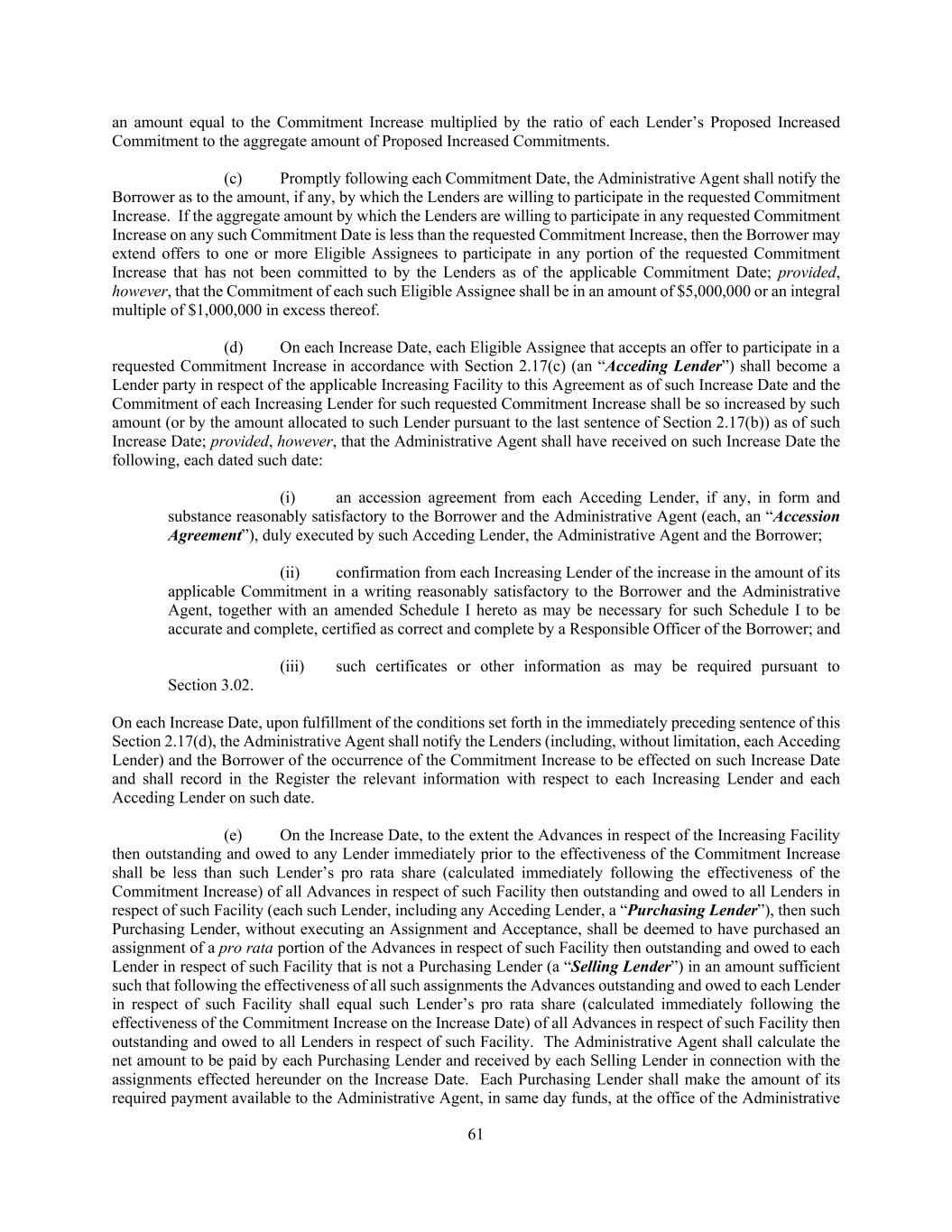 61 an amount equal to the Commitment Increase multiplied by the ratio of each Lender’s Proposed Increased Commitment to the aggregate amount of Proposed Increased Commitments. (c) Promptly following each Commitment Date, the Administrative Agent shall notify the Borrower as to the amount, if any, by which the Lenders are willing to participate in the requested Commitment Increase. If the aggregate amount by which the Lenders are willing to participate in any requested Commitment Increase on any such Commitment Date is less than the requested Commitment Increase, then the Borrower may extend offers to one or more Eligible Assignees to participate in any portion of the requested Commitment Increase that has not been committed to by the Lenders as of the applicable Commitment Date; provided, however, that the Commitment of each such Eligible Assignee shall be in an amount of $5,000,000 or an integral multiple of $1,000,000 in excess thereof. (d) On each Increase Date, each Eligible Assignee that accepts an offer to participate in a requested Commitment Increase in accordance with Section 2.17(c) (an “Acceding Lender”) shall become a Lender party in respect of the applicable Increasing Facility to this Agreement as of such Increase Date and the Commitment of each Increasing Lender for such requested Commitment Increase shall be so increased by such amount (or by the amount allocated to such Lender pursuant to the last sentence of Section 2.17(b)) as of such Increase Date; provided, however, that the Administrative Agent shall have received on such Increase Date the following, each dated such date: (i) an accession agreement from each Acceding Lender, if any, in form and substance reasonably satisfactory to the Borrower and the Administrative Agent (each, an “Accession Agreement”), duly executed by such Acceding Lender, the Administrative Agent and the Borrower; (ii) confirmation from each Increasing Lender of the increase in the amount of its applicable Commitment in a writing reasonably satisfactory to the Borrower and the Administrative Agent, together with an amended Schedule I hereto as may be necessary for such Schedule I to be accurate and complete, certified as correct and complete by a Responsible Officer of the Borrower; and (iii) such certificates or other information as may be required pursuant to Section 3.02. On each Increase Date, upon fulfillment of the conditions set forth in the immediately preceding sentence of this Section 2.17(d), the Administrative Agent shall notify the Lenders (including, without limitation, each Acceding Lender) and the Borrower of the occurrence of the Commitment Increase to be effected on such Increase Date and shall record in the Register the relevant information with respect to each Increasing Lender and each Acceding Lender on such date. (e) On the Increase Date, to the extent the Advances in respect of the Increasing Facility then outstanding and owed to any Lender immediately prior to the effectiveness of the Commitment Increase shall be less than such Lender’s pro rata share (calculated immediately following the effectiveness of the Commitment Increase) of all Advances in respect of such Facility then outstanding and owed to all Lenders in respect of such Facility (each such Lender, including any Acceding Lender, a “Purchasing Lender”), then such Purchasing Lender, without executing an Assignment and Acceptance, shall be deemed to have purchased an assignment of a pro rata portion of the Advances in respect of such Facility then outstanding and owed to each Lender in respect of such Facility that is not a Purchasing Lender (a “Selling Lender”) in an amount sufficient such that following the effectiveness of all such assignments the Advances outstanding and owed to each Lender in respect of such Facility shall equal such Lender’s pro rata share (calculated immediately following the effectiveness of the Commitment Increase on the Increase Date) of all Advances in respect of such Facility then outstanding and owed to all Lenders in respect of such Facility. The Administrative Agent shall calculate the net amount to be paid by each Purchasing Lender and received by each Selling Lender in connection with the assignments effected hereunder on the Increase Date. Each Purchasing Lender shall make the amount of its required payment available to the Administrative Agent, in same day funds, at the office of the Administrative