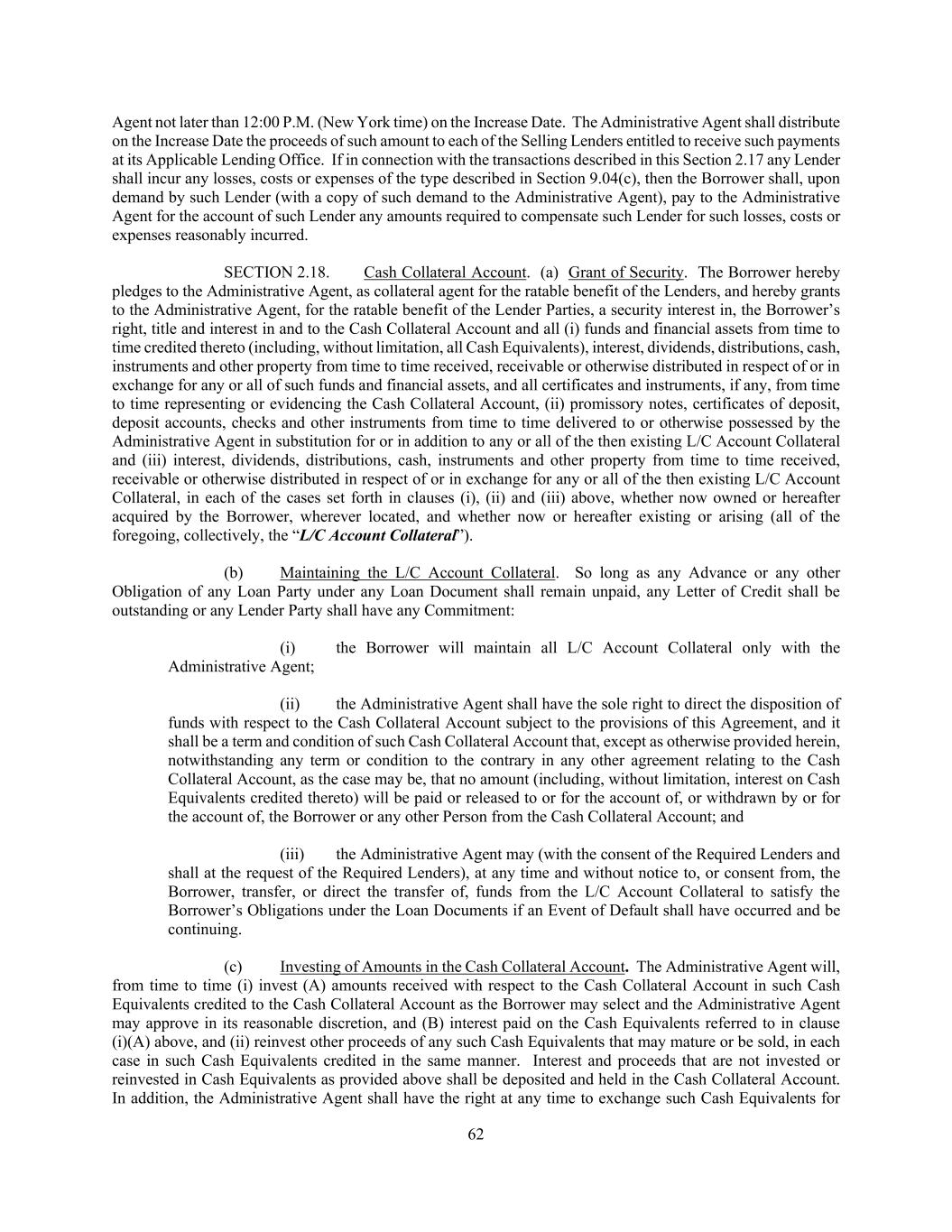 62 Agent not later than 12:00 P.M. (New York time) on the Increase Date. The Administrative Agent shall distribute on the Increase Date the proceeds of such amount to each of the Selling Lenders entitled to receive such payments at its Applicable Lending Office. If in connection with the transactions described in this Section 2.17 any Lender shall incur any losses, costs or expenses of the type described in Section 9.04(c), then the Borrower shall, upon demand by such Lender (with a copy of such demand to the Administrative Agent), pay to the Administrative Agent for the account of such Lender any amounts required to compensate such Lender for such losses, costs or expenses reasonably incurred. SECTION 2.18. Cash Collateral Account. (a) Grant of Security. The Borrower hereby pledges to the Administrative Agent, as collateral agent for the ratable benefit of the Lenders, and hereby grants to the Administrative Agent, for the ratable benefit of the Lender Parties, a security interest in, the Borrower’s right, title and interest in and to the Cash Collateral Account and all (i) funds and financial assets from time to time credited thereto (including, without limitation, all Cash Equivalents), interest, dividends, distributions, cash, instruments and other property from time to time received, receivable or otherwise distributed in respect of or in exchange for any or all of such funds and financial assets, and all certificates and instruments, if any, from time to time representing or evidencing the Cash Collateral Account, (ii) promissory notes, certificates of deposit, deposit accounts, checks and other instruments from time to time delivered to or otherwise possessed by the Administrative Agent in substitution for or in addition to any or all of the then existing L/C Account Collateral and (iii) interest, dividends, distributions, cash, instruments and other property from time to time received, receivable or otherwise distributed in respect of or in exchange for any or all of the then existing L/C Account Collateral, in each of the cases set forth in clauses (i), (ii) and (iii) above, whether now owned or hereafter acquired by the Borrower, wherever located, and whether now or hereafter existing or arising (all of the foregoing, collectively, the “L/C Account Collateral”). (b) Maintaining the L/C Account Collateral. So long as any Advance or any other Obligation of any Loan Party under any Loan Document shall remain unpaid, any Letter of Credit shall be outstanding or any Lender Party shall have any Commitment: (i) the Borrower will maintain all L/C Account Collateral only with the Administrative Agent; (ii) the Administrative Agent shall have the sole right to direct the disposition of funds with respect to the Cash Collateral Account subject to the provisions of this Agreement, and it shall be a term and condition of such Cash Collateral Account that, except as otherwise provided herein, notwithstanding any term or condition to the contrary in any other agreement relating to the Cash Collateral Account, as the case may be, that no amount (including, without limitation, interest on Cash Equivalents credited thereto) will be paid or released to or for the account of, or withdrawn by or for the account of, the Borrower or any other Person from the Cash Collateral Account; and (iii) the Administrative Agent may (with the consent of the Required Lenders and shall at the request of the Required Lenders), at any time and without notice to, or consent from, the Borrower, transfer, or direct the transfer of, funds from the L/C Account Collateral to satisfy the Borrower’s Obligations under the Loan Documents if an Event of Default shall have occurred and be continuing. (c) Investing of Amounts in the Cash Collateral Account. The Administrative Agent will, from time to time (i) invest (A) amounts received with respect to the Cash Collateral Account in such Cash Equivalents credited to the Cash Collateral Account as the Borrower may select and the Administrative Agent may approve in its reasonable discretion, and (B) interest paid on the Cash Equivalents referred to in clause (i)(A) above, and (ii) reinvest other proceeds of any such Cash Equivalents that may mature or be sold, in each case in such Cash Equivalents credited in the same manner. Interest and proceeds that are not invested or reinvested in Cash Equivalents as provided above shall be deposited and held in the Cash Collateral Account. In addition, the Administrative Agent shall have the right at any time to exchange such Cash Equivalents for