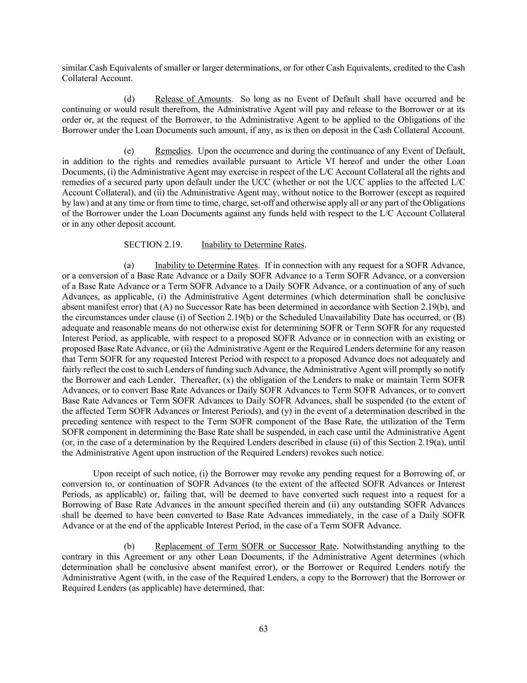 63 similar Cash Equivalents of smaller or larger determinations, or for other Cash Equivalents, credited to the Cash Collateral Account. (d) Release of Amounts. So long as no Event of Default shall have occurred and be continuing or would result therefrom, the Administrative Agent will pay and release to the Borrower or at its order or, at the request of the Borrower, to the Administrative Agent to be applied to the Obligations of the Borrower under the Loan Documents such amount, if any, as is then on deposit in the Cash Collateral Account. (e) Remedies. Upon the occurrence and during the continuance of any Event of Default, in addition to the rights and remedies available pursuant to Article VI hereof and under the other Loan Documents, (i) the Administrative Agent may exercise in respect of the L/C Account Collateral all the rights and remedies of a secured party upon default under the UCC (whether or not the UCC applies to the affected L/C Account Collateral), and (ii) the Administrative Agent may, without notice to the Borrower (except as required by law) and at any time or from time to time, charge, set-off and otherwise apply all or any part of the Obligations of the Borrower under the Loan Documents against any funds held with respect to the L/C Account Collateral or in any other deposit account. SECTION 2.19. Inability to Determine Rates. (a) Inability to Determine Rates. If in connection with any request for a SOFR Advance, or a conversion of a Base Rate Advance or a Daily SOFR Advance to a Term SOFR Advance, or a conversion of a Base Rate Advance or a Term SOFR Advance to a Daily SOFR Advance, or a continuation of any of such Advances, as applicable, (i) the Administrative Agent determines (which determination shall be conclusive absent manifest error) that (A) no Successor Rate has been determined in accordance with Section 2.19(b), and the circumstances under clause (i) of Section 2.19(b) or the Scheduled Unavailability Date has occurred, or (B) adequate and reasonable means do not otherwise exist for determining SOFR or Term SOFR for any requested Interest Period, as applicable, with respect to a proposed SOFR Advance or in connection with an existing or proposed Base Rate Advance, or (ii) the Administrative Agent or the Required Lenders determine for any reason that Term SOFR for any requested Interest Period with respect to a proposed Advance does not adequately and fairly reflect the cost to such Lenders of funding such Advance, the Administrative Agent will promptly so notify the Borrower and each Lender. Thereafter, (x) the obligation of the Lenders to make or maintain Term SOFR Advances, or to convert Base Rate Advances or Daily SOFR Advances to Term SOFR Advances, or to convert Base Rate Advances or Term SOFR Advances to Daily SOFR Advances, shall be suspended (to the extent of the affected Term SOFR Advances or Interest Periods), and (y) in the event of a determination described in the preceding sentence with respect to the Term SOFR component of the Base Rate, the utilization of the Term SOFR component in determining the Base Rate shall be suspended, in each case until the Administrative Agent (or, in the case of a determination by the Required Lenders described in clause (ii) of this Section 2.19(a), until the Administrative Agent upon instruction of the Required Lenders) revokes such notice. Upon receipt of such notice, (i) the Borrower may revoke any pending request for a Borrowing of, or conversion to, or continuation of SOFR Advances (to the extent of the affected SOFR Advances or Interest Periods, as applicable) or, failing that, will be deemed to have converted such request into a request for a Borrowing of Base Rate Advances in the amount specified therein and (ii) any outstanding SOFR Advances shall be deemed to have been converted to Base Rate Advances immediately, in the case of a Daily SOFR Advance or at the end of the applicable Interest Period, in the case of a Term SOFR Advance. (b) Replacement of Term SOFR or Successor Rate. Notwithstanding anything to the contrary in this Agreement or any other Loan Documents, if the Administrative Agent determines (which determination shall be conclusive absent manifest error), or the Borrower or Required Lenders notify the Administrative Agent (with, in the case of the Required Lenders, a copy to the Borrower) that the Borrower or Required Lenders (as applicable) have determined, that: