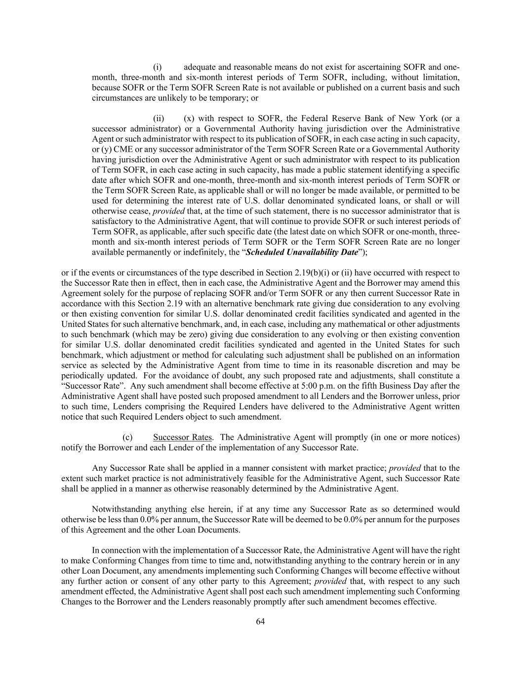64 (i) adequate and reasonable means do not exist for ascertaining SOFR and one- month, three-month and six-month interest periods of Term SOFR, including, without limitation, because SOFR or the Term SOFR Screen Rate is not available or published on a current basis and such circumstances are unlikely to be temporary; or (ii) (x) with respect to SOFR, the Federal Reserve Bank of New York (or a successor administrator) or a Governmental Authority having jurisdiction over the Administrative Agent or such administrator with respect to its publication of SOFR, in each case acting in such capacity, or (y) CME or any successor administrator of the Term SOFR Screen Rate or a Governmental Authority having jurisdiction over the Administrative Agent or such administrator with respect to its publication of Term SOFR, in each case acting in such capacity, has made a public statement identifying a specific date after which SOFR and one-month, three-month and six-month interest periods of Term SOFR or the Term SOFR Screen Rate, as applicable shall or will no longer be made available, or permitted to be used for determining the interest rate of U.S. dollar denominated syndicated loans, or shall or will otherwise cease, provided that, at the time of such statement, there is no successor administrator that is satisfactory to the Administrative Agent, that will continue to provide SOFR or such interest periods of Term SOFR, as applicable, after such specific date (the latest date on which SOFR or one-month, three- month and six-month interest periods of Term SOFR or the Term SOFR Screen Rate are no longer available permanently or indefinitely, the “Scheduled Unavailability Date”); or if the events or circumstances of the type described in Section 2.19(b)(i) or (ii) have occurred with respect to the Successor Rate then in effect, then in each case, the Administrative Agent and the Borrower may amend this Agreement solely for the purpose of replacing SOFR and/or Term SOFR or any then current Successor Rate in accordance with this Section 2.19 with an alternative benchmark rate giving due consideration to any evolving or then existing convention for similar U.S. dollar denominated credit facilities syndicated and agented in the United States for such alternative benchmark, and, in each case, including any mathematical or other adjustments to such benchmark (which may be zero) giving due consideration to any evolving or then existing convention for similar U.S. dollar denominated credit facilities syndicated and agented in the United States for such benchmark, which adjustment or method for calculating such adjustment shall be published on an information service as selected by the Administrative Agent from time to time in its reasonable discretion and may be periodically updated. For the avoidance of doubt, any such proposed rate and adjustments, shall constitute a “Successor Rate”. Any such amendment shall become effective at 5:00 p.m. on the fifth Business Day after the Administrative Agent shall have posted such proposed amendment to all Lenders and the Borrower unless, prior to such time, Lenders comprising the Required Lenders have delivered to the Administrative Agent written notice that such Required Lenders object to such amendment. (c) Successor Rates. The Administrative Agent will promptly (in one or more notices) notify the Borrower and each Lender of the implementation of any Successor Rate. Any Successor Rate shall be applied in a manner consistent with market practice; provided that to the extent such market practice is not administratively feasible for the Administrative Agent, such Successor Rate shall be applied in a manner as otherwise reasonably determined by the Administrative Agent. Notwithstanding anything else herein, if at any time any Successor Rate as so determined would otherwise be less than 0.0% per annum, the Successor Rate will be deemed to be 0.0% per annum for the purposes of this Agreement and the other Loan Documents. In connection with the implementation of a Successor Rate, the Administrative Agent will have the right to make Conforming Changes from time to time and, notwithstanding anything to the contrary herein or in any other Loan Document, any amendments implementing such Conforming Changes will become effective without any further action or consent of any other party to this Agreement; provided that, with respect to any such amendment effected, the Administrative Agent shall post each such amendment implementing such Conforming Changes to the Borrower and the Lenders reasonably promptly after such amendment becomes effective.