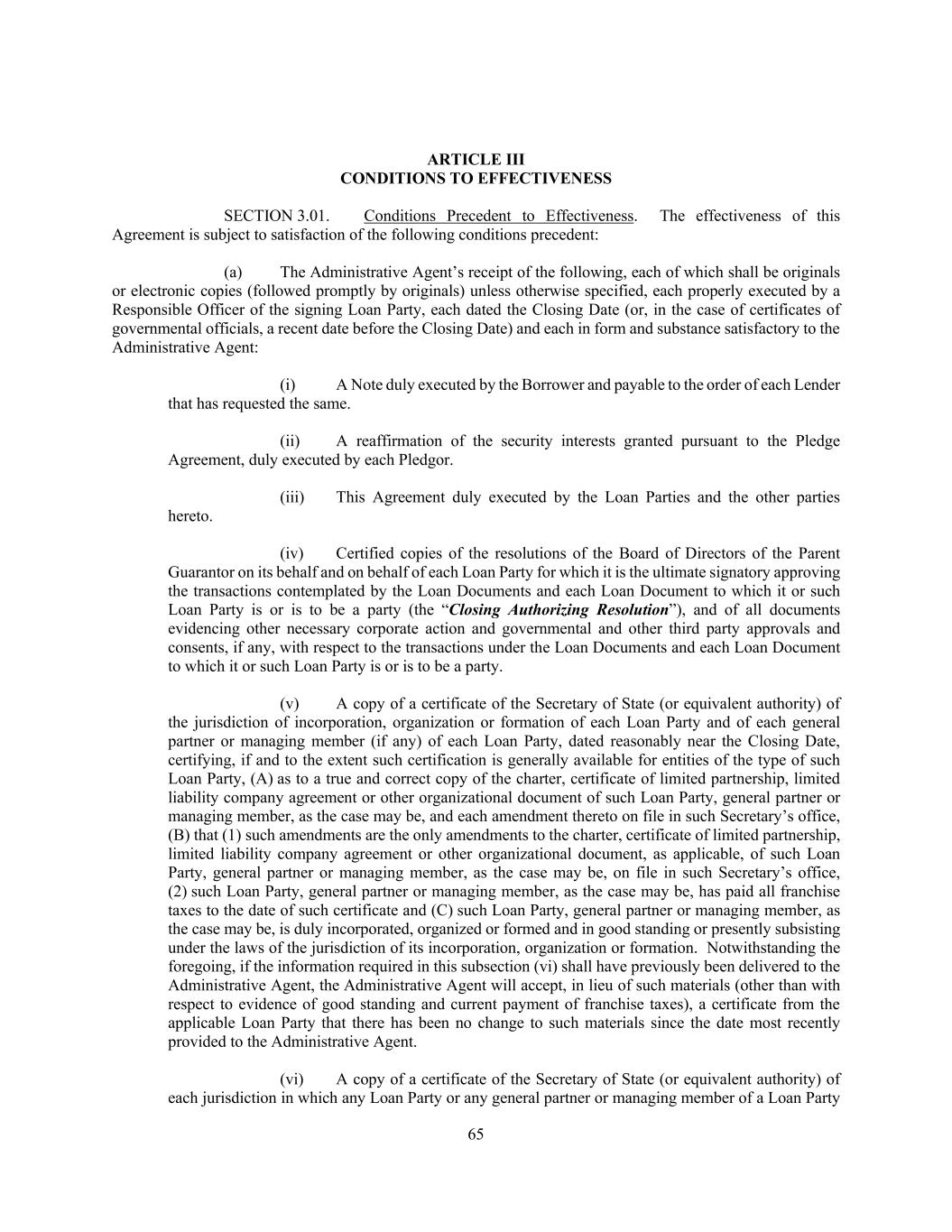 65 ARTICLE III CONDITIONS TO EFFECTIVENESS SECTION 3.01. Conditions Precedent to Effectiveness. The effectiveness of this Agreement is subject to satisfaction of the following conditions precedent: (a) The Administrative Agent’s receipt of the following, each of which shall be originals or electronic copies (followed promptly by originals) unless otherwise specified, each properly executed by a Responsible Officer of the signing Loan Party, each dated the Closing Date (or, in the case of certificates of governmental officials, a recent date before the Closing Date) and each in form and substance satisfactory to the Administrative Agent: (i) A Note duly executed by the Borrower and payable to the order of each Lender that has requested the same. (ii) A reaffirmation of the security interests granted pursuant to the Pledge Agreement, duly executed by each Pledgor. (iii) This Agreement duly executed by the Loan Parties and the other parties hereto. (iv) Certified copies of the resolutions of the Board of Directors of the Parent Guarantor on its behalf and on behalf of each Loan Party for which it is the ultimate signatory approving the transactions contemplated by the Loan Documents and each Loan Document to which it or such Loan Party is or is to be a party (the “Closing Authorizing Resolution”), and of all documents evidencing other necessary corporate action and governmental and other third party approvals and consents, if any, with respect to the transactions under the Loan Documents and each Loan Document to which it or such Loan Party is or is to be a party. (v) A copy of a certificate of the Secretary of State (or equivalent authority) of the jurisdiction of incorporation, organization or formation of each Loan Party and of each general partner or managing member (if any) of each Loan Party, dated reasonably near the Closing Date, certifying, if and to the extent such certification is generally available for entities of the type of such Loan Party, (A) as to a true and correct copy of the charter, certificate of limited partnership, limited liability company agreement or other organizational document of such Loan Party, general partner or managing member, as the case may be, and each amendment thereto on file in such Secretary’s office, (B) that (1) such amendments are the only amendments to the charter, certificate of limited partnership, limited liability company agreement or other organizational document, as applicable, of such Loan Party, general partner or managing member, as the case may be, on file in such Secretary’s office, (2) such Loan Party, general partner or managing member, as the case may be, has paid all franchise taxes to the date of such certificate and (C) such Loan Party, general partner or managing member, as the case may be, is duly incorporated, organized or formed and in good standing or presently subsisting under the laws of the jurisdiction of its incorporation, organization or formation. Notwithstanding the foregoing, if the information required in this subsection (vi) shall have previously been delivered to the Administrative Agent, the Administrative Agent will accept, in lieu of such materials (other than with respect to evidence of good standing and current payment of franchise taxes), a certificate from the applicable Loan Party that there has been no change to such materials since the date most recently provided to the Administrative Agent. (vi) A copy of a certificate of the Secretary of State (or equivalent authority) of each jurisdiction in which any Loan Party or any general partner or managing member of a Loan Party