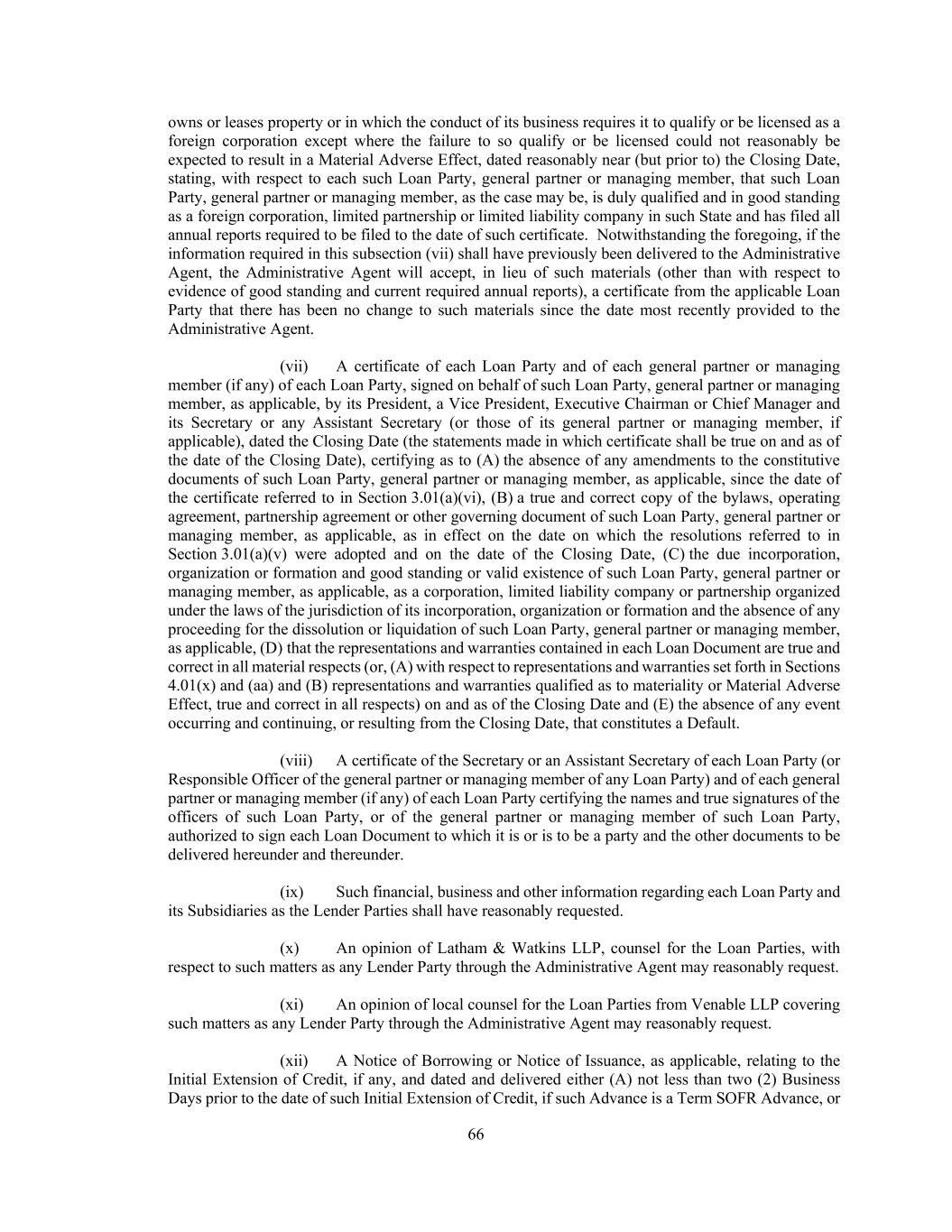 66 owns or leases property or in which the conduct of its business requires it to qualify or be licensed as a foreign corporation except where the failure to so qualify or be licensed could not reasonably be expected to result in a Material Adverse Effect, dated reasonably near (but prior to) the Closing Date, stating, with respect to each such Loan Party, general partner or managing member, that such Loan Party, general partner or managing member, as the case may be, is duly qualified and in good standing as a foreign corporation, limited partnership or limited liability company in such State and has filed all annual reports required to be filed to the date of such certificate. Notwithstanding the foregoing, if the information required in this subsection (vii) shall have previously been delivered to the Administrative Agent, the Administrative Agent will accept, in lieu of such materials (other than with respect to evidence of good standing and current required annual reports), a certificate from the applicable Loan Party that there has been no change to such materials since the date most recently provided to the Administrative Agent. (vii) A certificate of each Loan Party and of each general partner or managing member (if any) of each Loan Party, signed on behalf of such Loan Party, general partner or managing member, as applicable, by its President, a Vice President, Executive Chairman or Chief Manager and its Secretary or any Assistant Secretary (or those of its general partner or managing member, if applicable), dated the Closing Date (the statements made in which certificate shall be true on and as of the date of the Closing Date), certifying as to (A) the absence of any amendments to the constitutive documents of such Loan Party, general partner or managing member, as applicable, since the date of the certificate referred to in Section 3.01(a)(vi), (B) a true and correct copy of the bylaws, operating agreement, partnership agreement or other governing document of such Loan Party, general partner or managing member, as applicable, as in effect on the date on which the resolutions referred to in Section 3.01(a)(v) were adopted and on the date of the Closing Date, (C) the due incorporation, organization or formation and good standing or valid existence of such Loan Party, general partner or managing member, as applicable, as a corporation, limited liability company or partnership organized under the laws of the jurisdiction of its incorporation, organization or formation and the absence of any proceeding for the dissolution or liquidation of such Loan Party, general partner or managing member, as applicable, (D) that the representations and warranties contained in each Loan Document are true and correct in all material respects (or, (A) with respect to representations and warranties set forth in Sections 4.01(x) and (aa) and (B) representations and warranties qualified as to materiality or Material Adverse Effect, true and correct in all respects) on and as of the Closing Date and (E) the absence of any event occurring and continuing, or resulting from the Closing Date, that constitutes a Default. (viii) A certificate of the Secretary or an Assistant Secretary of each Loan Party (or Responsible Officer of the general partner or managing member of any Loan Party) and of each general partner or managing member (if any) of each Loan Party certifying the names and true signatures of the officers of such Loan Party, or of the general partner or managing member of such Loan Party, authorized to sign each Loan Document to which it is or is to be a party and the other documents to be delivered hereunder and thereunder. (ix) Such financial, business and other information regarding each Loan Party and its Subsidiaries as the Lender Parties shall have reasonably requested. (x) An opinion of Latham & Watkins LLP, counsel for the Loan Parties, with respect to such matters as any Lender Party through the Administrative Agent may reasonably request. (xi) An opinion of local counsel for the Loan Parties from Venable LLP covering such matters as any Lender Party through the Administrative Agent may reasonably request. (xii) A Notice of Borrowing or Notice of Issuance, as applicable, relating to the Initial Extension of Credit, if any, and dated and delivered either (A) not less than two (2) Business Days prior to the date of such Initial Extension of Credit, if such Advance is a Term SOFR Advance, or