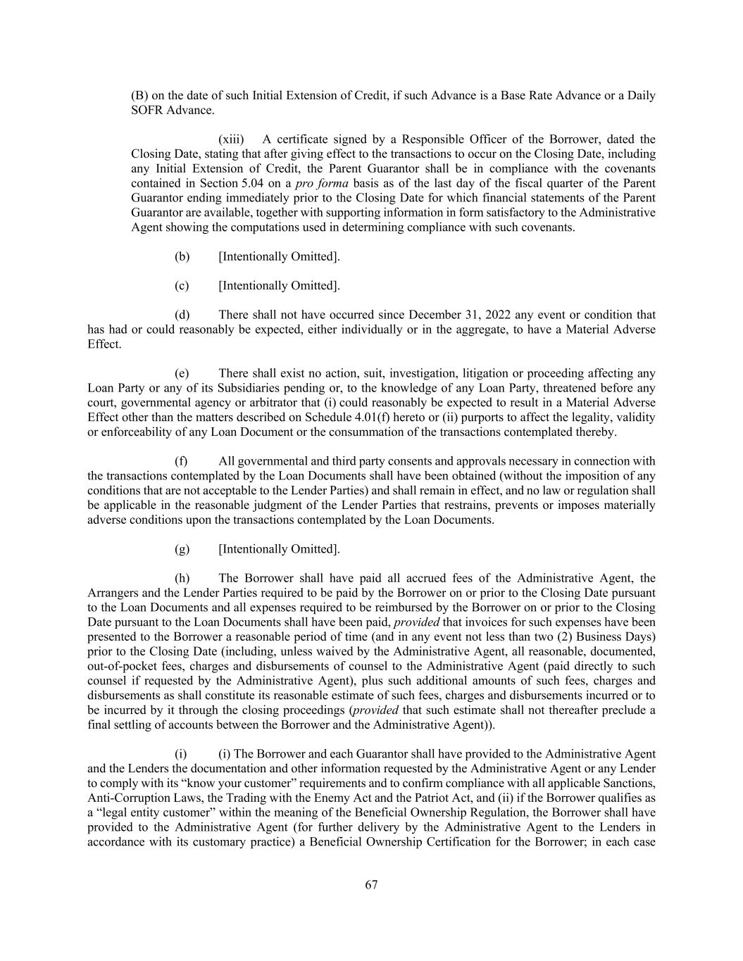 67 (B) on the date of such Initial Extension of Credit, if such Advance is a Base Rate Advance or a Daily SOFR Advance. (xiii) A certificate signed by a Responsible Officer of the Borrower, dated the Closing Date, stating that after giving effect to the transactions to occur on the Closing Date, including any Initial Extension of Credit, the Parent Guarantor shall be in compliance with the covenants contained in Section 5.04 on a pro forma basis as of the last day of the fiscal quarter of the Parent Guarantor ending immediately prior to the Closing Date for which financial statements of the Parent Guarantor are available, together with supporting information in form satisfactory to the Administrative Agent showing the computations used in determining compliance with such covenants. (b) [Intentionally Omitted]. (c) [Intentionally Omitted]. (d) There shall not have occurred since December 31, 2022 any event or condition that has had or could reasonably be expected, either individually or in the aggregate, to have a Material Adverse Effect. (e) There shall exist no action, suit, investigation, litigation or proceeding affecting any Loan Party or any of its Subsidiaries pending or, to the knowledge of any Loan Party, threatened before any court, governmental agency or arbitrator that (i) could reasonably be expected to result in a Material Adverse Effect other than the matters described on Schedule 4.01(f) hereto or (ii) purports to affect the legality, validity or enforceability of any Loan Document or the consummation of the transactions contemplated thereby. (f) All governmental and third party consents and approvals necessary in connection with the transactions contemplated by the Loan Documents shall have been obtained (without the imposition of any conditions that are not acceptable to the Lender Parties) and shall remain in effect, and no law or regulation shall be applicable in the reasonable judgment of the Lender Parties that restrains, prevents or imposes materially adverse conditions upon the transactions contemplated by the Loan Documents. (g) [Intentionally Omitted]. (h) The Borrower shall have paid all accrued fees of the Administrative Agent, the Arrangers and the Lender Parties required to be paid by the Borrower on or prior to the Closing Date pursuant to the Loan Documents and all expenses required to be reimbursed by the Borrower on or prior to the Closing Date pursuant to the Loan Documents shall have been paid, provided that invoices for such expenses have been presented to the Borrower a reasonable period of time (and in any event not less than two (2) Business Days) prior to the Closing Date (including, unless waived by the Administrative Agent, all reasonable, documented, out-of-pocket fees, charges and disbursements of counsel to the Administrative Agent (paid directly to such counsel if requested by the Administrative Agent), plus such additional amounts of such fees, charges and disbursements as shall constitute its reasonable estimate of such fees, charges and disbursements incurred or to be incurred by it through the closing proceedings (provided that such estimate shall not thereafter preclude a final settling of accounts between the Borrower and the Administrative Agent)). (i) (i) The Borrower and each Guarantor shall have provided to the Administrative Agent and the Lenders the documentation and other information requested by the Administrative Agent or any Lender to comply with its “know your customer” requirements and to confirm compliance with all applicable Sanctions, Anti-Corruption Laws, the Trading with the Enemy Act and the Patriot Act, and (ii) if the Borrower qualifies as a “legal entity customer” within the meaning of the Beneficial Ownership Regulation, the Borrower shall have provided to the Administrative Agent (for further delivery by the Administrative Agent to the Lenders in accordance with its customary practice) a Beneficial Ownership Certification for the Borrower; in each case