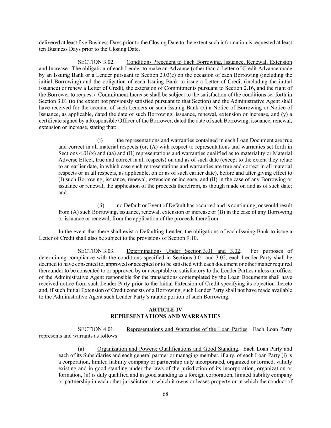 68 delivered at least five Business Days prior to the Closing Date to the extent such information is requested at least ten Business Days prior to the Closing Date. SECTION 3.02. Conditions Precedent to Each Borrowing, Issuance, Renewal, Extension and Increase. The obligation of each Lender to make an Advance (other than a Letter of Credit Advance made by an Issuing Bank or a Lender pursuant to Section 2.03(c) on the occasion of each Borrowing (including the initial Borrowing) and the obligation of each Issuing Bank to issue a Letter of Credit (including the initial issuance) or renew a Letter of Credit, the extension of Commitments pursuant to Section 2.16, and the right of the Borrower to request a Commitment Increase shall be subject to the satisfaction of the conditions set forth in Section 3.01 (to the extent not previously satisfied pursuant to that Section) and the Administrative Agent shall have received for the account of such Lenders or such Issuing Bank (x) a Notice of Borrowing or Notice of Issuance, as applicable, dated the date of such Borrowing, issuance, renewal, extension or increase, and (y) a certificate signed by a Responsible Officer of the Borrower, dated the date of such Borrowing, issuance, renewal, extension or increase, stating that: (i) the representations and warranties contained in each Loan Document are true and correct in all material respects (or, (A) with respect to representations and warranties set forth in Sections 4.01(x) and (aa) and (B) representations and warranties qualified as to materiality or Material Adverse Effect, true and correct in all respects) on and as of such date (except to the extent they relate to an earlier date, in which case such representations and warranties are true and correct in all material respects or in all respects, as applicable, on or as of such earlier date), before and after giving effect to (I) such Borrowing, issuance, renewal, extension or increase, and (II) in the case of any Borrowing or issuance or renewal, the application of the proceeds therefrom, as though made on and as of such date; and (ii) no Default or Event of Default has occurred and is continuing, or would result from (A) such Borrowing, issuance, renewal, extension or increase or (B) in the case of any Borrowing or issuance or renewal, from the application of the proceeds therefrom. In the event that there shall exist a Defaulting Lender, the obligations of each Issuing Bank to issue a Letter of Credit shall also be subject to the provisions of Section 9.10. SECTION 3.03. Determinations Under Section 3.01 and 3.02. For purposes of determining compliance with the conditions specified in Sections 3.01 and 3.02, each Lender Party shall be deemed to have consented to, approved or accepted or to be satisfied with each document or other matter required thereunder to be consented to or approved by or acceptable or satisfactory to the Lender Parties unless an officer of the Administrative Agent responsible for the transactions contemplated by the Loan Documents shall have received notice from such Lender Party prior to the Initial Extension of Credit specifying its objection thereto and, if such Initial Extension of Credit consists of a Borrowing, such Lender Party shall not have made available to the Administrative Agent such Lender Party’s ratable portion of such Borrowing. ARTICLE IV REPRESENTATIONS AND WARRANTIES SECTION 4.01. Representations and Warranties of the Loan Parties. Each Loan Party represents and warrants as follows: (a) Organization and Powers; Qualifications and Good Standing. Each Loan Party and each of its Subsidiaries and each general partner or managing member, if any, of each Loan Party (i) is a corporation, limited liability company or partnership duly incorporated, organized or formed, validly existing and in good standing under the laws of the jurisdiction of its incorporation, organization or formation, (ii) is duly qualified and in good standing as a foreign corporation, limited liability company or partnership in each other jurisdiction in which it owns or leases property or in which the conduct of