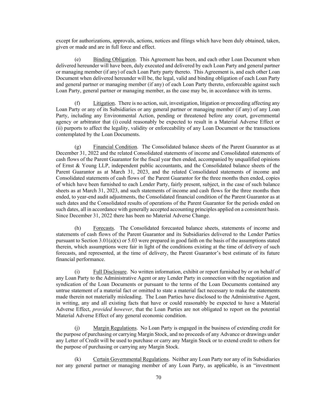 70 except for authorizations, approvals, actions, notices and filings which have been duly obtained, taken, given or made and are in full force and effect. (e) Binding Obligation. This Agreement has been, and each other Loan Document when delivered hereunder will have been, duly executed and delivered by each Loan Party and general partner or managing member (if any) of each Loan Party party thereto. This Agreement is, and each other Loan Document when delivered hereunder will be, the legal, valid and binding obligation of each Loan Party and general partner or managing member (if any) of each Loan Party thereto, enforceable against such Loan Party, general partner or managing member, as the case may be, in accordance with its terms. (f) Litigation. There is no action, suit, investigation, litigation or proceeding affecting any Loan Party or any of its Subsidiaries or any general partner or managing member (if any) of any Loan Party, including any Environmental Action, pending or threatened before any court, governmental agency or arbitrator that (i) could reasonably be expected to result in a Material Adverse Effect or (ii) purports to affect the legality, validity or enforceability of any Loan Document or the transactions contemplated by the Loan Documents. (g) Financial Condition. The Consolidated balance sheets of the Parent Guarantor as at December 31, 2022 and the related Consolidated statements of income and Consolidated statements of cash flows of the Parent Guarantor for the fiscal year then ended, accompanied by unqualified opinions of Ernst & Young LLP, independent public accountants, and the Consolidated balance sheets of the Parent Guarantor as at March 31, 2023, and the related Consolidated statements of income and Consolidated statements of cash flows of the Parent Guarantor for the three months then ended, copies of which have been furnished to each Lender Party, fairly present, subject, in the case of such balance sheets as at March 31, 2023, and such statements of income and cash flows for the three months then ended, to year-end audit adjustments, the Consolidated financial condition of the Parent Guarantor as at such dates and the Consolidated results of operations of the Parent Guarantor for the periods ended on such dates, all in accordance with generally accepted accounting principles applied on a consistent basis. Since December 31, 2022 there has been no Material Adverse Change. (h) Forecasts. The Consolidated forecasted balance sheets, statements of income and statements of cash flows of the Parent Guarantor and its Subsidiaries delivered to the Lender Parties pursuant to Section 3.01(a)(x) or 5.03 were prepared in good faith on the basis of the assumptions stated therein, which assumptions were fair in light of the conditions existing at the time of delivery of such forecasts, and represented, at the time of delivery, the Parent Guarantor’s best estimate of its future financial performance. (i) Full Disclosure. No written information, exhibit or report furnished by or on behalf of any Loan Party to the Administrative Agent or any Lender Party in connection with the negotiation and syndication of the Loan Documents or pursuant to the terms of the Loan Documents contained any untrue statement of a material fact or omitted to state a material fact necessary to make the statements made therein not materially misleading. The Loan Parties have disclosed to the Administrative Agent, in writing, any and all existing facts that have or could reasonably be expected to have a Material Adverse Effect, provided however, that the Loan Parties are not obligated to report on the potential Material Adverse Effect of any general economic condition. (j) Margin Regulations. No Loan Party is engaged in the business of extending credit for the purpose of purchasing or carrying Margin Stock, and no proceeds of any Advance or drawings under any Letter of Credit will be used to purchase or carry any Margin Stock or to extend credit to others for the purpose of purchasing or carrying any Margin Stock. (k) Certain Governmental Regulations. Neither any Loan Party nor any of its Subsidiaries nor any general partner or managing member of any Loan Party, as applicable, is an “investment