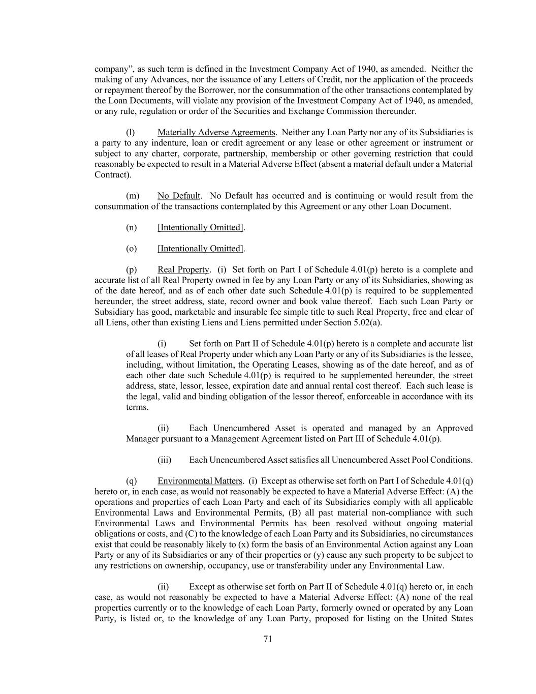 71 company”, as such term is defined in the Investment Company Act of 1940, as amended. Neither the making of any Advances, nor the issuance of any Letters of Credit, nor the application of the proceeds or repayment thereof by the Borrower, nor the consummation of the other transactions contemplated by the Loan Documents, will violate any provision of the Investment Company Act of 1940, as amended, or any rule, regulation or order of the Securities and Exchange Commission thereunder. (l) Materially Adverse Agreements. Neither any Loan Party nor any of its Subsidiaries is a party to any indenture, loan or credit agreement or any lease or other agreement or instrument or subject to any charter, corporate, partnership, membership or other governing restriction that could reasonably be expected to result in a Material Adverse Effect (absent a material default under a Material Contract). (m) No Default. No Default has occurred and is continuing or would result from the consummation of the transactions contemplated by this Agreement or any other Loan Document. (n) [Intentionally Omitted]. (o) [Intentionally Omitted]. (p) Real Property. (i) Set forth on Part I of Schedule 4.01(p) hereto is a complete and accurate list of all Real Property owned in fee by any Loan Party or any of its Subsidiaries, showing as of the date hereof, and as of each other date such Schedule 4.01(p) is required to be supplemented hereunder, the street address, state, record owner and book value thereof. Each such Loan Party or Subsidiary has good, marketable and insurable fee simple title to such Real Property, free and clear of all Liens, other than existing Liens and Liens permitted under Section 5.02(a). (i) Set forth on Part II of Schedule 4.01(p) hereto is a complete and accurate list of all leases of Real Property under which any Loan Party or any of its Subsidiaries is the lessee, including, without limitation, the Operating Leases, showing as of the date hereof, and as of each other date such Schedule 4.01(p) is required to be supplemented hereunder, the street address, state, lessor, lessee, expiration date and annual rental cost thereof. Each such lease is the legal, valid and binding obligation of the lessor thereof, enforceable in accordance with its terms. (ii) Each Unencumbered Asset is operated and managed by an Approved Manager pursuant to a Management Agreement listed on Part III of Schedule 4.01(p). (iii) Each Unencumbered Asset satisfies all Unencumbered Asset Pool Conditions. (q) Environmental Matters. (i) Except as otherwise set forth on Part I of Schedule 4.01(q) hereto or, in each case, as would not reasonably be expected to have a Material Adverse Effect: (A) the operations and properties of each Loan Party and each of its Subsidiaries comply with all applicable Environmental Laws and Environmental Permits, (B) all past material non-compliance with such Environmental Laws and Environmental Permits has been resolved without ongoing material obligations or costs, and (C) to the knowledge of each Loan Party and its Subsidiaries, no circumstances exist that could be reasonably likely to (x) form the basis of an Environmental Action against any Loan Party or any of its Subsidiaries or any of their properties or (y) cause any such property to be subject to any restrictions on ownership, occupancy, use or transferability under any Environmental Law. (ii) Except as otherwise set forth on Part II of Schedule 4.01(q) hereto or, in each case, as would not reasonably be expected to have a Material Adverse Effect: (A) none of the real properties currently or to the knowledge of each Loan Party, formerly owned or operated by any Loan Party, is listed or, to the knowledge of any Loan Party, proposed for listing on the United States