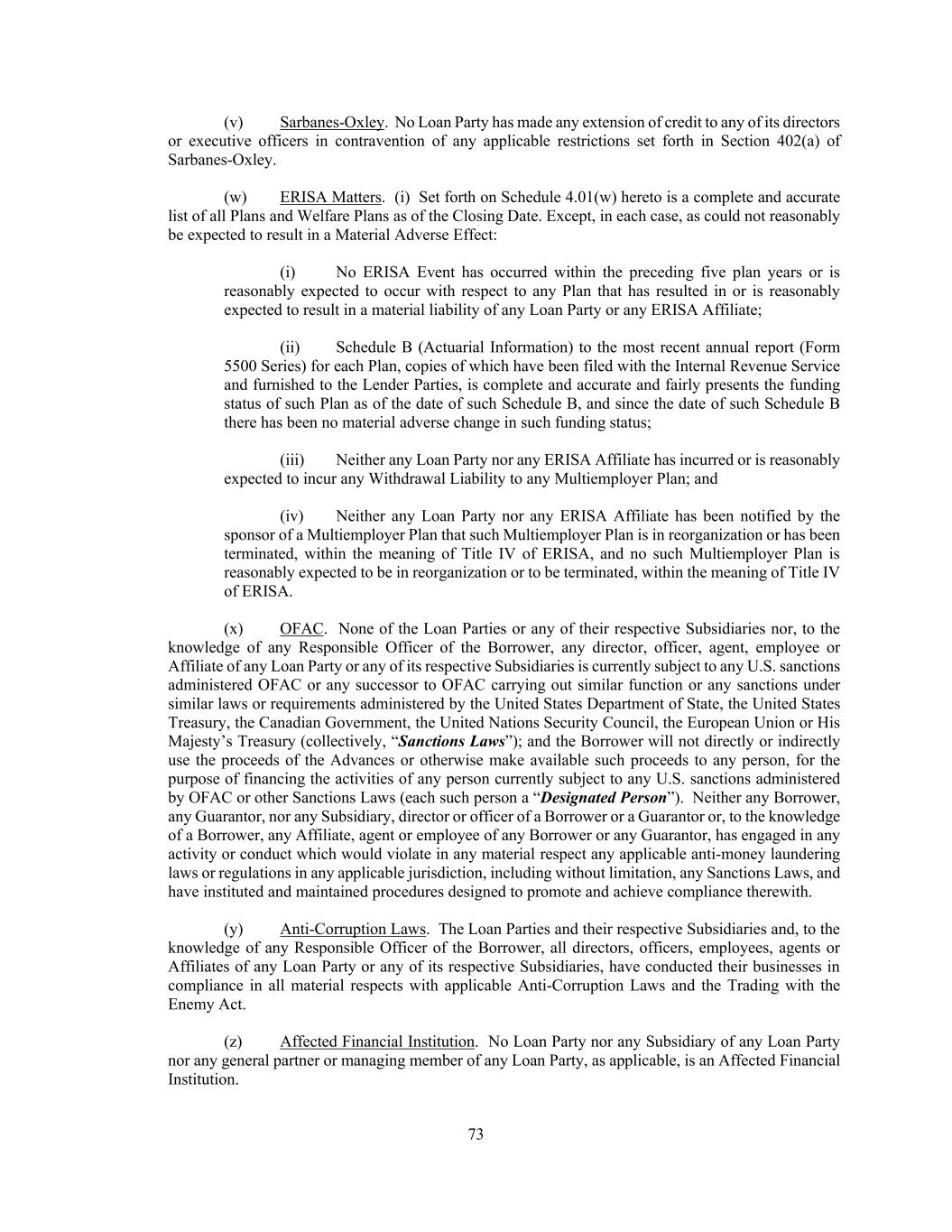 73 (v) Sarbanes-Oxley. No Loan Party has made any extension of credit to any of its directors or executive officers in contravention of any applicable restrictions set forth in Section 402(a) of Sarbanes-Oxley. (w) ERISA Matters. (i) Set forth on Schedule 4.01(w) hereto is a complete and accurate list of all Plans and Welfare Plans as of the Closing Date. Except, in each case, as could not reasonably be expected to result in a Material Adverse Effect: (i) No ERISA Event has occurred within the preceding five plan years or is reasonably expected to occur with respect to any Plan that has resulted in or is reasonably expected to result in a material liability of any Loan Party or any ERISA Affiliate; (ii) Schedule B (Actuarial Information) to the most recent annual report (Form 5500 Series) for each Plan, copies of which have been filed with the Internal Revenue Service and furnished to the Lender Parties, is complete and accurate and fairly presents the funding status of such Plan as of the date of such Schedule B, and since the date of such Schedule B there has been no material adverse change in such funding status; (iii) Neither any Loan Party nor any ERISA Affiliate has incurred or is reasonably expected to incur any Withdrawal Liability to any Multiemployer Plan; and (iv) Neither any Loan Party nor any ERISA Affiliate has been notified by the sponsor of a Multiemployer Plan that such Multiemployer Plan is in reorganization or has been terminated, within the meaning of Title IV of ERISA, and no such Multiemployer Plan is reasonably expected to be in reorganization or to be terminated, within the meaning of Title IV of ERISA. (x) OFAC. None of the Loan Parties or any of their respective Subsidiaries nor, to the knowledge of any Responsible Officer of the Borrower, any director, officer, agent, employee or Affiliate of any Loan Party or any of its respective Subsidiaries is currently subject to any U.S. sanctions administered OFAC or any successor to OFAC carrying out similar function or any sanctions under similar laws or requirements administered by the United States Department of State, the United States Treasury, the Canadian Government, the United Nations Security Council, the European Union or His Majesty’s Treasury (collectively, “Sanctions Laws”); and the Borrower will not directly or indirectly use the proceeds of the Advances or otherwise make available such proceeds to any person, for the purpose of financing the activities of any person currently subject to any U.S. sanctions administered by OFAC or other Sanctions Laws (each such person a “Designated Person”). Neither any Borrower, any Guarantor, nor any Subsidiary, director or officer of a Borrower or a Guarantor or, to the knowledge of a Borrower, any Affiliate, agent or employee of any Borrower or any Guarantor, has engaged in any activity or conduct which would violate in any material respect any applicable anti-money laundering laws or regulations in any applicable jurisdiction, including without limitation, any Sanctions Laws, and have instituted and maintained procedures designed to promote and achieve compliance therewith. (y) Anti-Corruption Laws. The Loan Parties and their respective Subsidiaries and, to the knowledge of any Responsible Officer of the Borrower, all directors, officers, employees, agents or Affiliates of any Loan Party or any of its respective Subsidiaries, have conducted their businesses in compliance in all material respects with applicable Anti-Corruption Laws and the Trading with the Enemy Act. (z) Affected Financial Institution. No Loan Party nor any Subsidiary of any Loan Party nor any general partner or managing member of any Loan Party, as applicable, is an Affected Financial Institution.