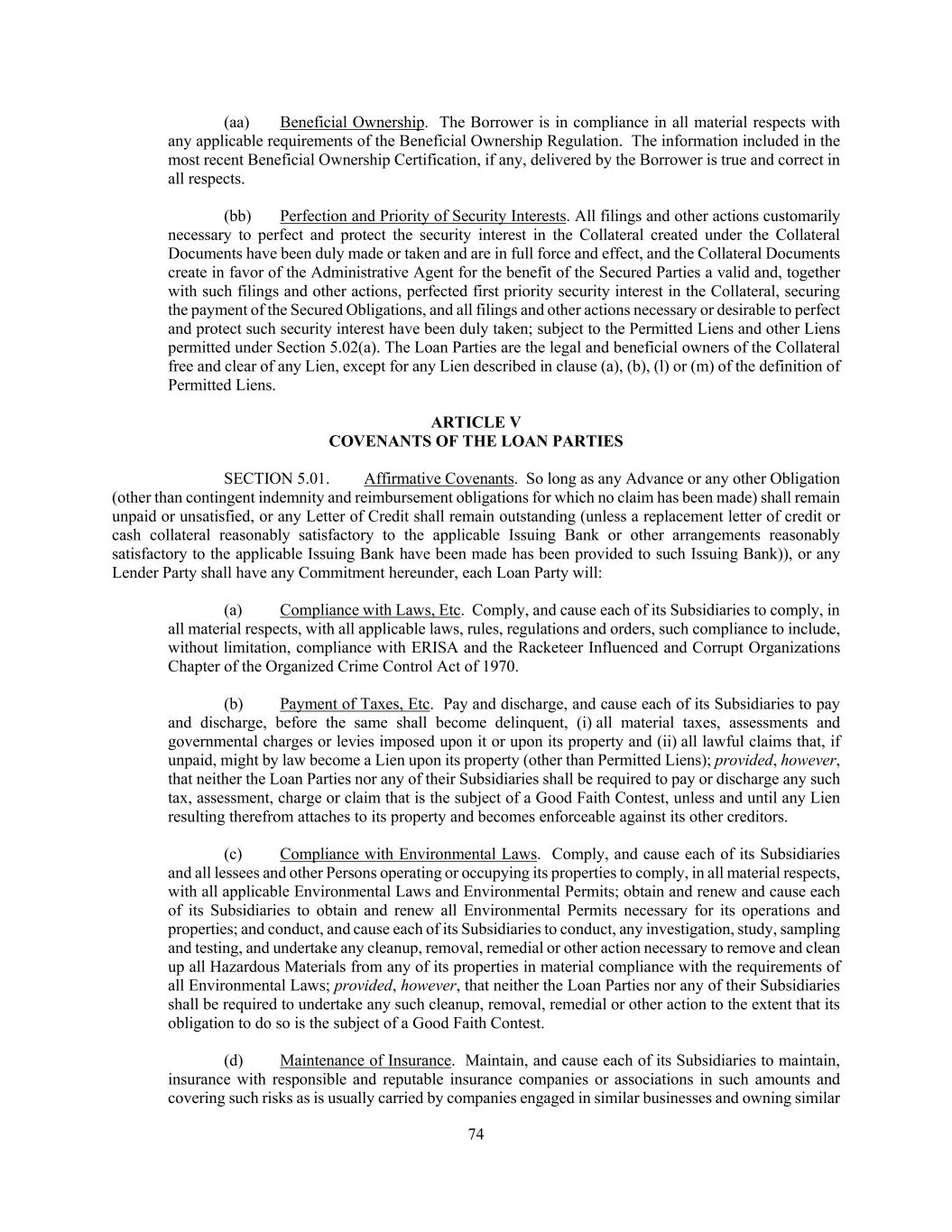 74 (aa) Beneficial Ownership. The Borrower is in compliance in all material respects with any applicable requirements of the Beneficial Ownership Regulation. The information included in the most recent Beneficial Ownership Certification, if any, delivered by the Borrower is true and correct in all respects. (bb) Perfection and Priority of Security Interests. All filings and other actions customarily necessary to perfect and protect the security interest in the Collateral created under the Collateral Documents have been duly made or taken and are in full force and effect, and the Collateral Documents create in favor of the Administrative Agent for the benefit of the Secured Parties a valid and, together with such filings and other actions, perfected first priority security interest in the Collateral, securing the payment of the Secured Obligations, and all filings and other actions necessary or desirable to perfect and protect such security interest have been duly taken; subject to the Permitted Liens and other Liens permitted under Section 5.02(a). The Loan Parties are the legal and beneficial owners of the Collateral free and clear of any Lien, except for any Lien described in clause (a), (b), (l) or (m) of the definition of Permitted Liens. ARTICLE V COVENANTS OF THE LOAN PARTIES SECTION 5.01. Affirmative Covenants. So long as any Advance or any other Obligation (other than contingent indemnity and reimbursement obligations for which no claim has been made) shall remain unpaid or unsatisfied, or any Letter of Credit shall remain outstanding (unless a replacement letter of credit or cash collateral reasonably satisfactory to the applicable Issuing Bank or other arrangements reasonably satisfactory to the applicable Issuing Bank have been made has been provided to such Issuing Bank)), or any Lender Party shall have any Commitment hereunder, each Loan Party will: (a) Compliance with Laws, Etc. Comply, and cause each of its Subsidiaries to comply, in all material respects, with all applicable laws, rules, regulations and orders, such compliance to include, without limitation, compliance with ERISA and the Racketeer Influenced and Corrupt Organizations Chapter of the Organized Crime Control Act of 1970. (b) Payment of Taxes, Etc. Pay and discharge, and cause each of its Subsidiaries to pay and discharge, before the same shall become delinquent, (i) all material taxes, assessments and governmental charges or levies imposed upon it or upon its property and (ii) all lawful claims that, if unpaid, might by law become a Lien upon its property (other than Permitted Liens); provided, however, that neither the Loan Parties nor any of their Subsidiaries shall be required to pay or discharge any such tax, assessment, charge or claim that is the subject of a Good Faith Contest, unless and until any Lien resulting therefrom attaches to its property and becomes enforceable against its other creditors. (c) Compliance with Environmental Laws. Comply, and cause each of its Subsidiaries and all lessees and other Persons operating or occupying its properties to comply, in all material respects, with all applicable Environmental Laws and Environmental Permits; obtain and renew and cause each of its Subsidiaries to obtain and renew all Environmental Permits necessary for its operations and properties; and conduct, and cause each of its Subsidiaries to conduct, any investigation, study, sampling and testing, and undertake any cleanup, removal, remedial or other action necessary to remove and clean up all Hazardous Materials from any of its properties in material compliance with the requirements of all Environmental Laws; provided, however, that neither the Loan Parties nor any of their Subsidiaries shall be required to undertake any such cleanup, removal, remedial or other action to the extent that its obligation to do so is the subject of a Good Faith Contest. (d) Maintenance of Insurance. Maintain, and cause each of its Subsidiaries to maintain, insurance with responsible and reputable insurance companies or associations in such amounts and covering such risks as is usually carried by companies engaged in similar businesses and owning similar