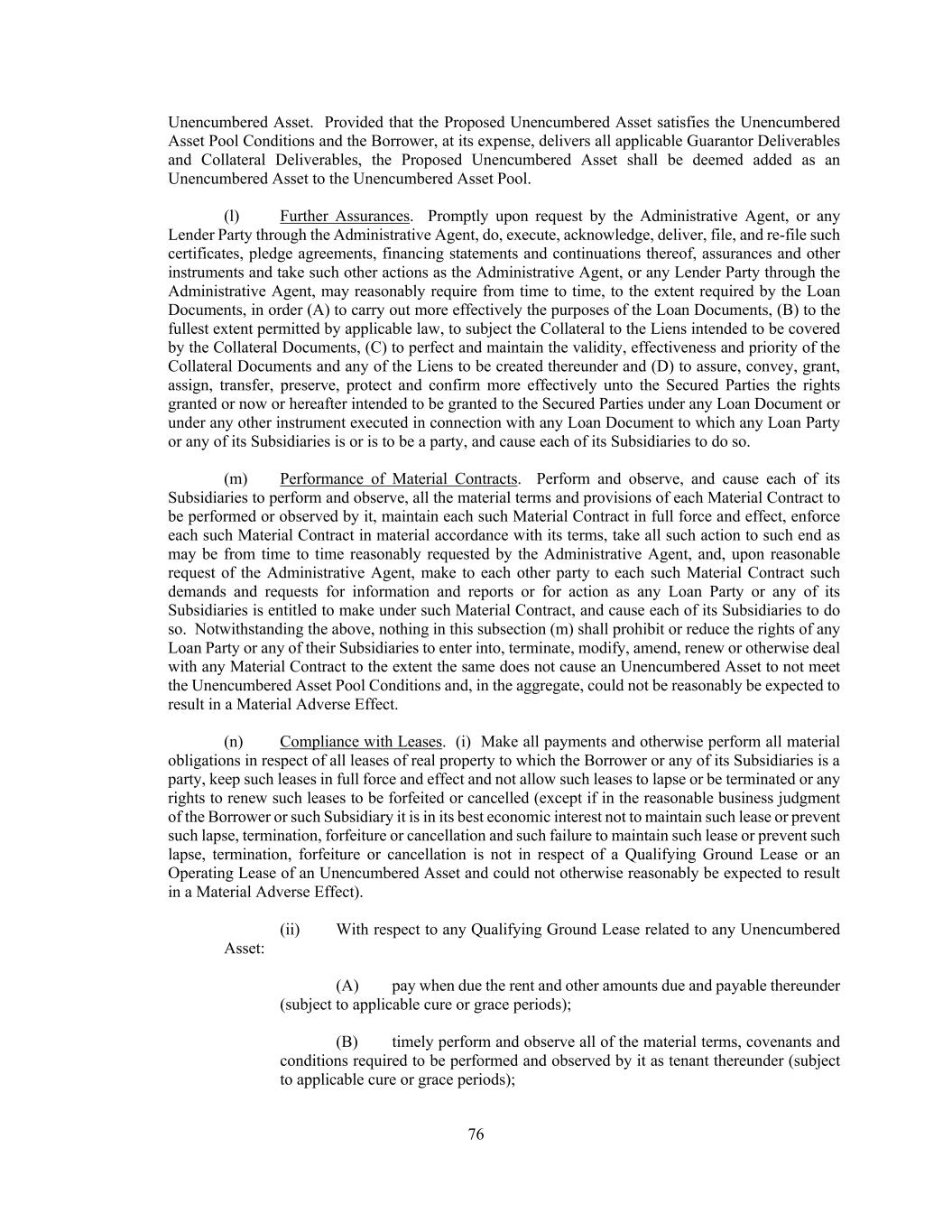 76 Unencumbered Asset. Provided that the Proposed Unencumbered Asset satisfies the Unencumbered Asset Pool Conditions and the Borrower, at its expense, delivers all applicable Guarantor Deliverables and Collateral Deliverables, the Proposed Unencumbered Asset shall be deemed added as an Unencumbered Asset to the Unencumbered Asset Pool. (l) Further Assurances. Promptly upon request by the Administrative Agent, or any Lender Party through the Administrative Agent, do, execute, acknowledge, deliver, file, and re-file such certificates, pledge agreements, financing statements and continuations thereof, assurances and other instruments and take such other actions as the Administrative Agent, or any Lender Party through the Administrative Agent, may reasonably require from time to time, to the extent required by the Loan Documents, in order (A) to carry out more effectively the purposes of the Loan Documents, (B) to the fullest extent permitted by applicable law, to subject the Collateral to the Liens intended to be covered by the Collateral Documents, (C) to perfect and maintain the validity, effectiveness and priority of the Collateral Documents and any of the Liens to be created thereunder and (D) to assure, convey, grant, assign, transfer, preserve, protect and confirm more effectively unto the Secured Parties the rights granted or now or hereafter intended to be granted to the Secured Parties under any Loan Document or under any other instrument executed in connection with any Loan Document to which any Loan Party or any of its Subsidiaries is or is to be a party, and cause each of its Subsidiaries to do so. (m) Performance of Material Contracts. Perform and observe, and cause each of its Subsidiaries to perform and observe, all the material terms and provisions of each Material Contract to be performed or observed by it, maintain each such Material Contract in full force and effect, enforce each such Material Contract in material accordance with its terms, take all such action to such end as may be from time to time reasonably requested by the Administrative Agent, and, upon reasonable request of the Administrative Agent, make to each other party to each such Material Contract such demands and requests for information and reports or for action as any Loan Party or any of its Subsidiaries is entitled to make under such Material Contract, and cause each of its Subsidiaries to do so. Notwithstanding the above, nothing in this subsection (m) shall prohibit or reduce the rights of any Loan Party or any of their Subsidiaries to enter into, terminate, modify, amend, renew or otherwise deal with any Material Contract to the extent the same does not cause an Unencumbered Asset to not meet the Unencumbered Asset Pool Conditions and, in the aggregate, could not be reasonably be expected to result in a Material Adverse Effect. (n) Compliance with Leases. (i) Make all payments and otherwise perform all material obligations in respect of all leases of real property to which the Borrower or any of its Subsidiaries is a party, keep such leases in full force and effect and not allow such leases to lapse or be terminated or any rights to renew such leases to be forfeited or cancelled (except if in the reasonable business judgment of the Borrower or such Subsidiary it is in its best economic interest not to maintain such lease or prevent such lapse, termination, forfeiture or cancellation and such failure to maintain such lease or prevent such lapse, termination, forfeiture or cancellation is not in respect of a Qualifying Ground Lease or an Operating Lease of an Unencumbered Asset and could not otherwise reasonably be expected to result in a Material Adverse Effect). (ii) With respect to any Qualifying Ground Lease related to any Unencumbered Asset: (A) pay when due the rent and other amounts due and payable thereunder (subject to applicable cure or grace periods); (B) timely perform and observe all of the material terms, covenants and conditions required to be performed and observed by it as tenant thereunder (subject to applicable cure or grace periods);
