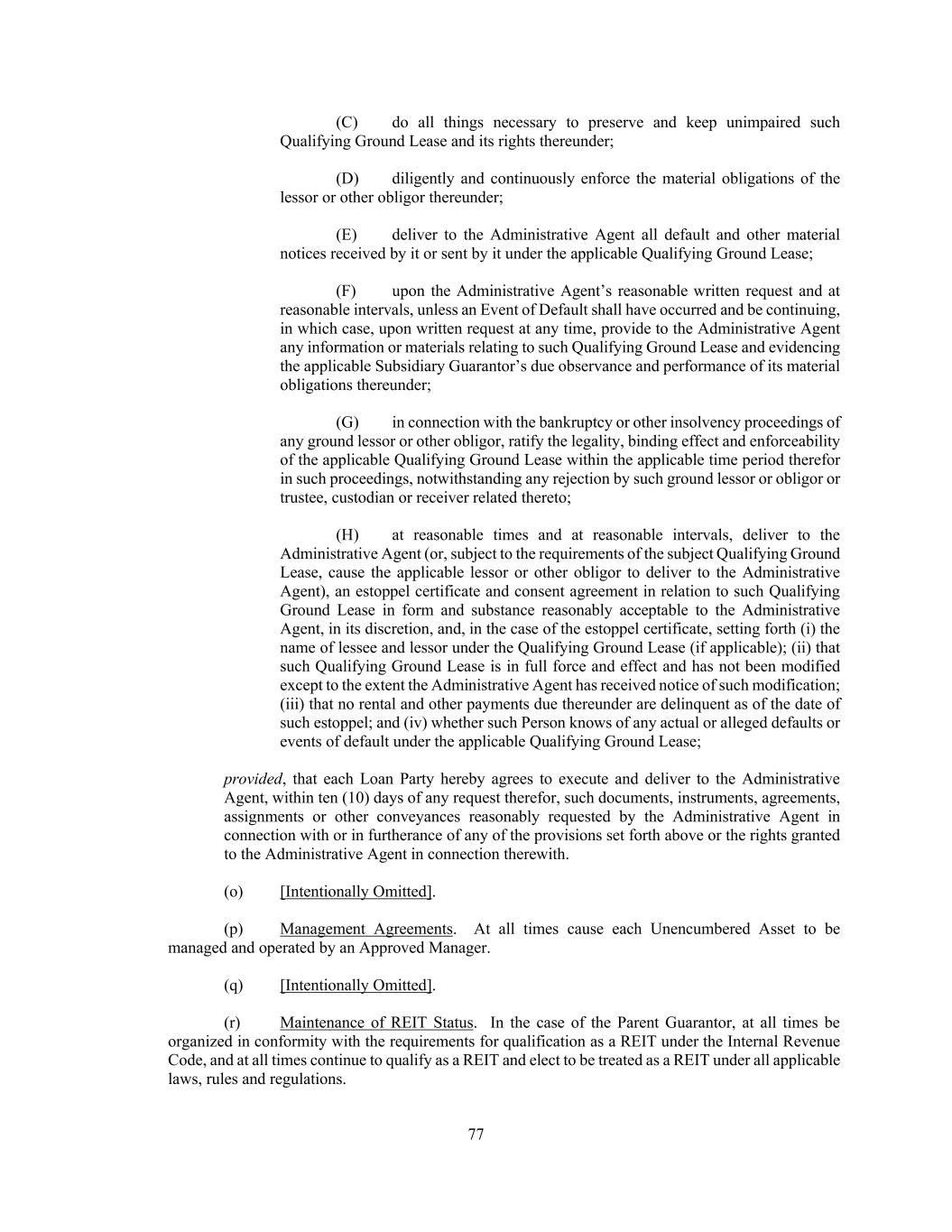 77 (C) do all things necessary to preserve and keep unimpaired such Qualifying Ground Lease and its rights thereunder; (D) diligently and continuously enforce the material obligations of the lessor or other obligor thereunder; (E) deliver to the Administrative Agent all default and other material notices received by it or sent by it under the applicable Qualifying Ground Lease; (F) upon the Administrative Agent’s reasonable written request and at reasonable intervals, unless an Event of Default shall have occurred and be continuing, in which case, upon written request at any time, provide to the Administrative Agent any information or materials relating to such Qualifying Ground Lease and evidencing the applicable Subsidiary Guarantor’s due observance and performance of its material obligations thereunder; (G) in connection with the bankruptcy or other insolvency proceedings of any ground lessor or other obligor, ratify the legality, binding effect and enforceability of the applicable Qualifying Ground Lease within the applicable time period therefor in such proceedings, notwithstanding any rejection by such ground lessor or obligor or trustee, custodian or receiver related thereto; (H) at reasonable times and at reasonable intervals, deliver to the Administrative Agent (or, subject to the requirements of the subject Qualifying Ground Lease, cause the applicable lessor or other obligor to deliver to the Administrative Agent), an estoppel certificate and consent agreement in relation to such Qualifying Ground Lease in form and substance reasonably acceptable to the Administrative Agent, in its discretion, and, in the case of the estoppel certificate, setting forth (i) the name of lessee and lessor under the Qualifying Ground Lease (if applicable); (ii) that such Qualifying Ground Lease is in full force and effect and has not been modified except to the extent the Administrative Agent has received notice of such modification; (iii) that no rental and other payments due thereunder are delinquent as of the date of such estoppel; and (iv) whether such Person knows of any actual or alleged defaults or events of default under the applicable Qualifying Ground Lease; provided, that each Loan Party hereby agrees to execute and deliver to the Administrative Agent, within ten (10) days of any request therefor, such documents, instruments, agreements, assignments or other conveyances reasonably requested by the Administrative Agent in connection with or in furtherance of any of the provisions set forth above or the rights granted to the Administrative Agent in connection therewith. (o) [Intentionally Omitted]. (p) Management Agreements. At all times cause each Unencumbered Asset to be managed and operated by an Approved Manager. (q) [Intentionally Omitted]. (r) Maintenance of REIT Status. In the case of the Parent Guarantor, at all times be organized in conformity with the requirements for qualification as a REIT under the Internal Revenue Code, and at all times continue to qualify as a REIT and elect to be treated as a REIT under all applicable laws, rules and regulations.