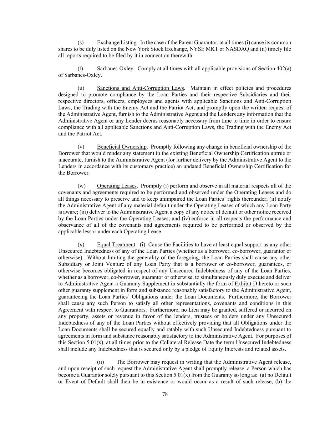 78 (s) Exchange Listing. In the case of the Parent Guarantor, at all times (i) cause its common shares to be duly listed on the New York Stock Exchange, NYSE MKT or NASDAQ and (ii) timely file all reports required to be filed by it in connection therewith. (t) Sarbanes-Oxley. Comply at all times with all applicable provisions of Section 402(a) of Sarbanes-Oxley. (u) Sanctions and Anti-Corruption Laws. Maintain in effect policies and procedures designed to promote compliance by the Loan Parties and their respective Subsidiaries and their respective directors, officers, employees and agents with applicable Sanctions and Anti-Corruption Laws, the Trading with the Enemy Act and the Patriot Act, and promptly upon the written request of the Administrative Agent, furnish to the Administrative Agent and the Lenders any information that the Administrative Agent or any Lender deems reasonably necessary from time to time in order to ensure compliance with all applicable Sanctions and Anti-Corruption Laws, the Trading with the Enemy Act and the Patriot Act. (v) Beneficial Ownership. Promptly following any change in beneficial ownership of the Borrower that would render any statement in the existing Beneficial Ownership Certification untrue or inaccurate, furnish to the Administrative Agent (for further delivery by the Administrative Agent to the Lenders in accordance with its customary practice) an updated Beneficial Ownership Certification for the Borrower. (w) Operating Leases. Promptly (i) perform and observe in all material respects all of the covenants and agreements required to be performed and observed under the Operating Leases and do all things necessary to preserve and to keep unimpaired the Loan Parties’ rights thereunder; (ii) notify the Administrative Agent of any material default under the Operating Leases of which any Loan Party is aware; (iii) deliver to the Administrative Agent a copy of any notice of default or other notice received by the Loan Parties under the Operating Leases; and (iv) enforce in all respects the performance and observance of all of the covenants and agreements required to be performed or observed by the applicable lessor under each Operating Lease. (x) Equal Treatment. (i) Cause the Facilities to have at least equal support as any other Unsecured Indebtedness of any of the Loan Parties (whether as a borrower, co-borrower, guarantor or otherwise). Without limiting the generality of the foregoing, the Loan Parties shall cause any other Subsidiary or Joint Venture of any Loan Party that is a borrower or co-borrower, guarantees, or otherwise becomes obligated in respect of any Unsecured Indebtedness of any of the Loan Parties, whether as a borrower, co-borrower, guarantor or otherwise, to simultaneously duly execute and deliver to Administrative Agent a Guaranty Supplement in substantially the form of Exhibit D hereto or such other guaranty supplement in form and substance reasonably satisfactory to the Administrative Agent, guaranteeing the Loan Parties’ Obligations under the Loan Documents. Furthermore, the Borrower shall cause any such Person to satisfy all other representations, covenants and conditions in this Agreement with respect to Guarantors. Furthermore, no Lien may be granted, suffered or incurred on any property, assets or revenue in favor of the lenders, trustees or holders under any Unsecured Indebtedness of any of the Loan Parties without effectively providing that all Obligations under the Loan Documents shall be secured equally and ratably with such Unsecured Indebtedness pursuant to agreements in form and substance reasonably satisfactory to the Administrative Agent. For purposes of this Section 5.01(x), at all times prior to the Collateral Release Date the term Unsecured Indebtedness shall include any Indebtedness that is secured only by a pledge of Equity Interests and related assets. (ii) The Borrower may request in writing that the Administrative Agent release, and upon receipt of such request the Administrative Agent shall promptly release, a Person which has become a Guarantor solely pursuant to this Section 5.01(x) from the Guaranty so long as: (a) no Default or Event of Default shall then be in existence or would occur as a result of such release, (b) the