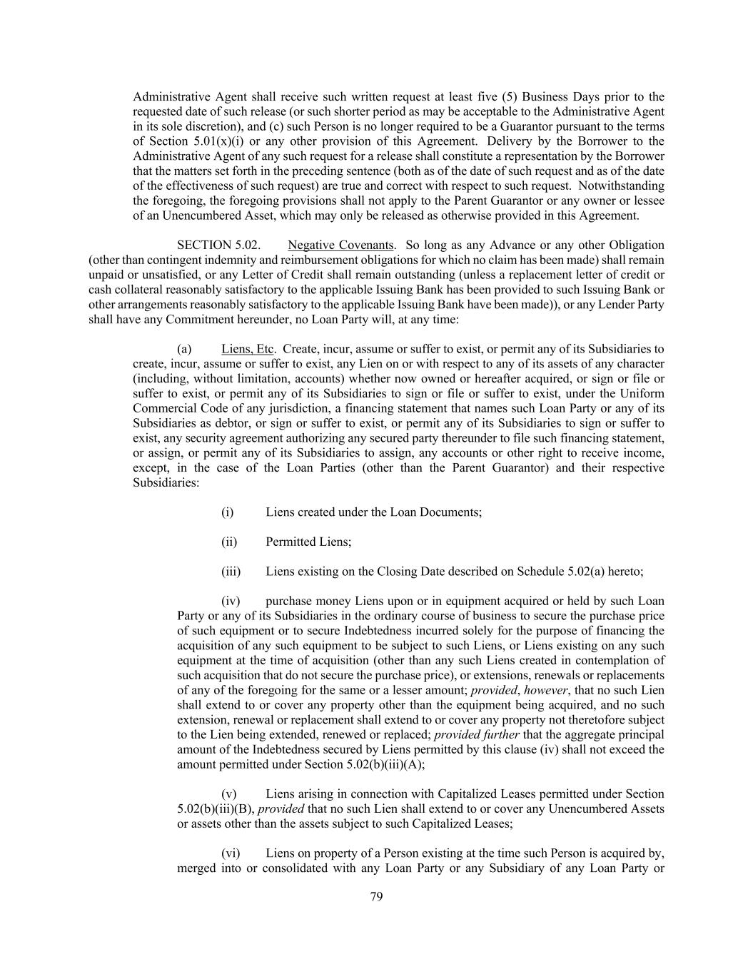 79 Administrative Agent shall receive such written request at least five (5) Business Days prior to the requested date of such release (or such shorter period as may be acceptable to the Administrative Agent in its sole discretion), and (c) such Person is no longer required to be a Guarantor pursuant to the terms of Section 5.01(x)(i) or any other provision of this Agreement. Delivery by the Borrower to the Administrative Agent of any such request for a release shall constitute a representation by the Borrower that the matters set forth in the preceding sentence (both as of the date of such request and as of the date of the effectiveness of such request) are true and correct with respect to such request. Notwithstanding the foregoing, the foregoing provisions shall not apply to the Parent Guarantor or any owner or lessee of an Unencumbered Asset, which may only be released as otherwise provided in this Agreement. SECTION 5.02. Negative Covenants. So long as any Advance or any other Obligation (other than contingent indemnity and reimbursement obligations for which no claim has been made) shall remain unpaid or unsatisfied, or any Letter of Credit shall remain outstanding (unless a replacement letter of credit or cash collateral reasonably satisfactory to the applicable Issuing Bank has been provided to such Issuing Bank or other arrangements reasonably satisfactory to the applicable Issuing Bank have been made)), or any Lender Party shall have any Commitment hereunder, no Loan Party will, at any time: (a) Liens, Etc. Create, incur, assume or suffer to exist, or permit any of its Subsidiaries to create, incur, assume or suffer to exist, any Lien on or with respect to any of its assets of any character (including, without limitation, accounts) whether now owned or hereafter acquired, or sign or file or suffer to exist, or permit any of its Subsidiaries to sign or file or suffer to exist, under the Uniform Commercial Code of any jurisdiction, a financing statement that names such Loan Party or any of its Subsidiaries as debtor, or sign or suffer to exist, or permit any of its Subsidiaries to sign or suffer to exist, any security agreement authorizing any secured party thereunder to file such financing statement, or assign, or permit any of its Subsidiaries to assign, any accounts or other right to receive income, except, in the case of the Loan Parties (other than the Parent Guarantor) and their respective Subsidiaries: (i) Liens created under the Loan Documents; (ii) Permitted Liens; (iii) Liens existing on the Closing Date described on Schedule 5.02(a) hereto; (iv) purchase money Liens upon or in equipment acquired or held by such Loan Party or any of its Subsidiaries in the ordinary course of business to secure the purchase price of such equipment or to secure Indebtedness incurred solely for the purpose of financing the acquisition of any such equipment to be subject to such Liens, or Liens existing on any such equipment at the time of acquisition (other than any such Liens created in contemplation of such acquisition that do not secure the purchase price), or extensions, renewals or replacements of any of the foregoing for the same or a lesser amount; provided, however, that no such Lien shall extend to or cover any property other than the equipment being acquired, and no such extension, renewal or replacement shall extend to or cover any property not theretofore subject to the Lien being extended, renewed or replaced; provided further that the aggregate principal amount of the Indebtedness secured by Liens permitted by this clause (iv) shall not exceed the amount permitted under Section 5.02(b)(iii)(A); (v) Liens arising in connection with Capitalized Leases permitted under Section 5.02(b)(iii)(B), provided that no such Lien shall extend to or cover any Unencumbered Assets or assets other than the assets subject to such Capitalized Leases; (vi) Liens on property of a Person existing at the time such Person is acquired by, merged into or consolidated with any Loan Party or any Subsidiary of any Loan Party or
