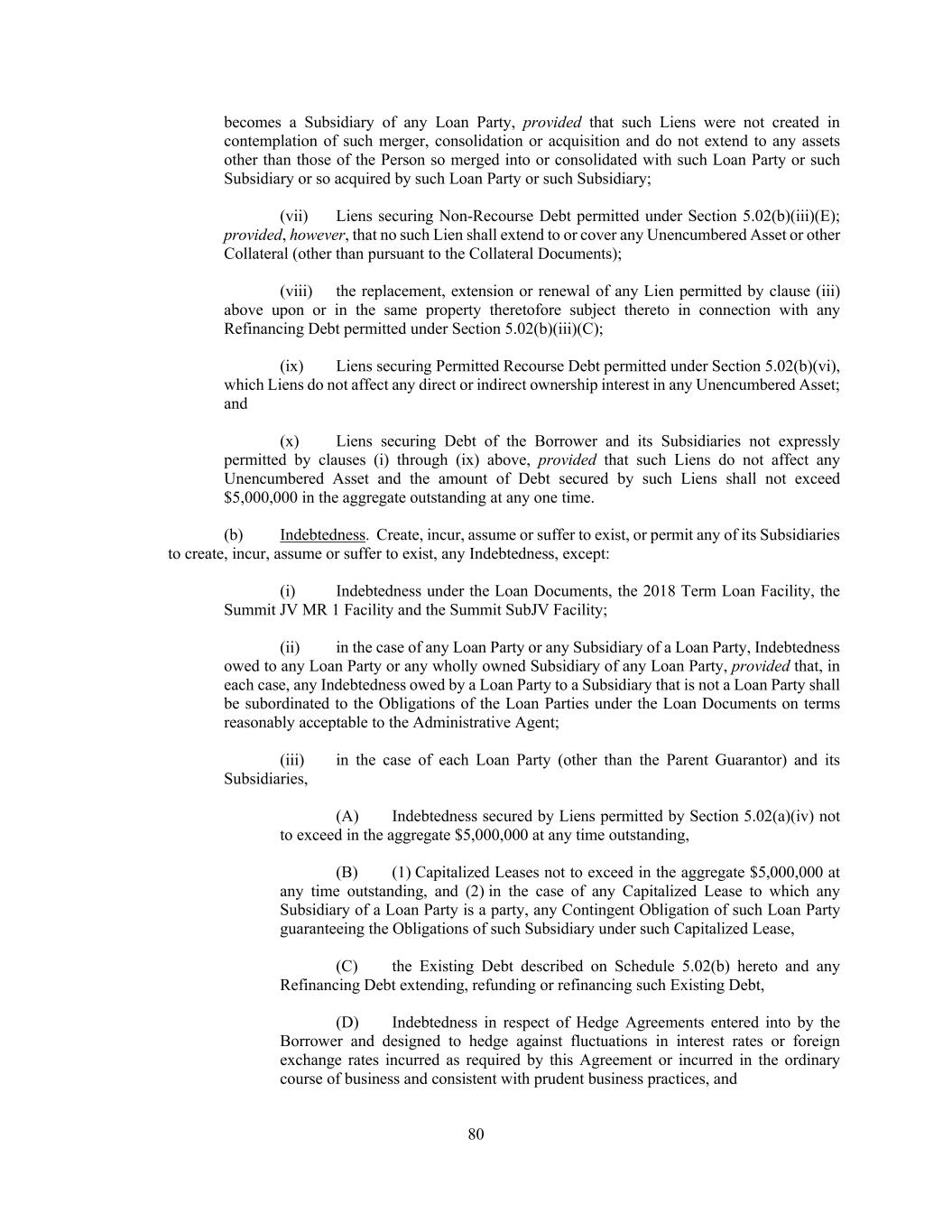 80 becomes a Subsidiary of any Loan Party, provided that such Liens were not created in contemplation of such merger, consolidation or acquisition and do not extend to any assets other than those of the Person so merged into or consolidated with such Loan Party or such Subsidiary or so acquired by such Loan Party or such Subsidiary; (vii) Liens securing Non-Recourse Debt permitted under Section 5.02(b)(iii)(E); provided, however, that no such Lien shall extend to or cover any Unencumbered Asset or other Collateral (other than pursuant to the Collateral Documents); (viii) the replacement, extension or renewal of any Lien permitted by clause (iii) above upon or in the same property theretofore subject thereto in connection with any Refinancing Debt permitted under Section 5.02(b)(iii)(C); (ix) Liens securing Permitted Recourse Debt permitted under Section 5.02(b)(vi), which Liens do not affect any direct or indirect ownership interest in any Unencumbered Asset; and (x) Liens securing Debt of the Borrower and its Subsidiaries not expressly permitted by clauses (i) through (ix) above, provided that such Liens do not affect any Unencumbered Asset and the amount of Debt secured by such Liens shall not exceed $5,000,000 in the aggregate outstanding at any one time. (b) Indebtedness. Create, incur, assume or suffer to exist, or permit any of its Subsidiaries to create, incur, assume or suffer to exist, any Indebtedness, except: (i) Indebtedness under the Loan Documents, the 2018 Term Loan Facility, the Summit JV MR 1 Facility and the Summit SubJV Facility; (ii) in the case of any Loan Party or any Subsidiary of a Loan Party, Indebtedness owed to any Loan Party or any wholly owned Subsidiary of any Loan Party, provided that, in each case, any Indebtedness owed by a Loan Party to a Subsidiary that is not a Loan Party shall be subordinated to the Obligations of the Loan Parties under the Loan Documents on terms reasonably acceptable to the Administrative Agent; (iii) in the case of each Loan Party (other than the Parent Guarantor) and its Subsidiaries, (A) Indebtedness secured by Liens permitted by Section 5.02(a)(iv) not to exceed in the aggregate $5,000,000 at any time outstanding, (B) (1) Capitalized Leases not to exceed in the aggregate $5,000,000 at any time outstanding, and (2) in the case of any Capitalized Lease to which any Subsidiary of a Loan Party is a party, any Contingent Obligation of such Loan Party guaranteeing the Obligations of such Subsidiary under such Capitalized Lease, (C) the Existing Debt described on Schedule 5.02(b) hereto and any Refinancing Debt extending, refunding or refinancing such Existing Debt, (D) Indebtedness in respect of Hedge Agreements entered into by the Borrower and designed to hedge against fluctuations in interest rates or foreign exchange rates incurred as required by this Agreement or incurred in the ordinary course of business and consistent with prudent business practices, and