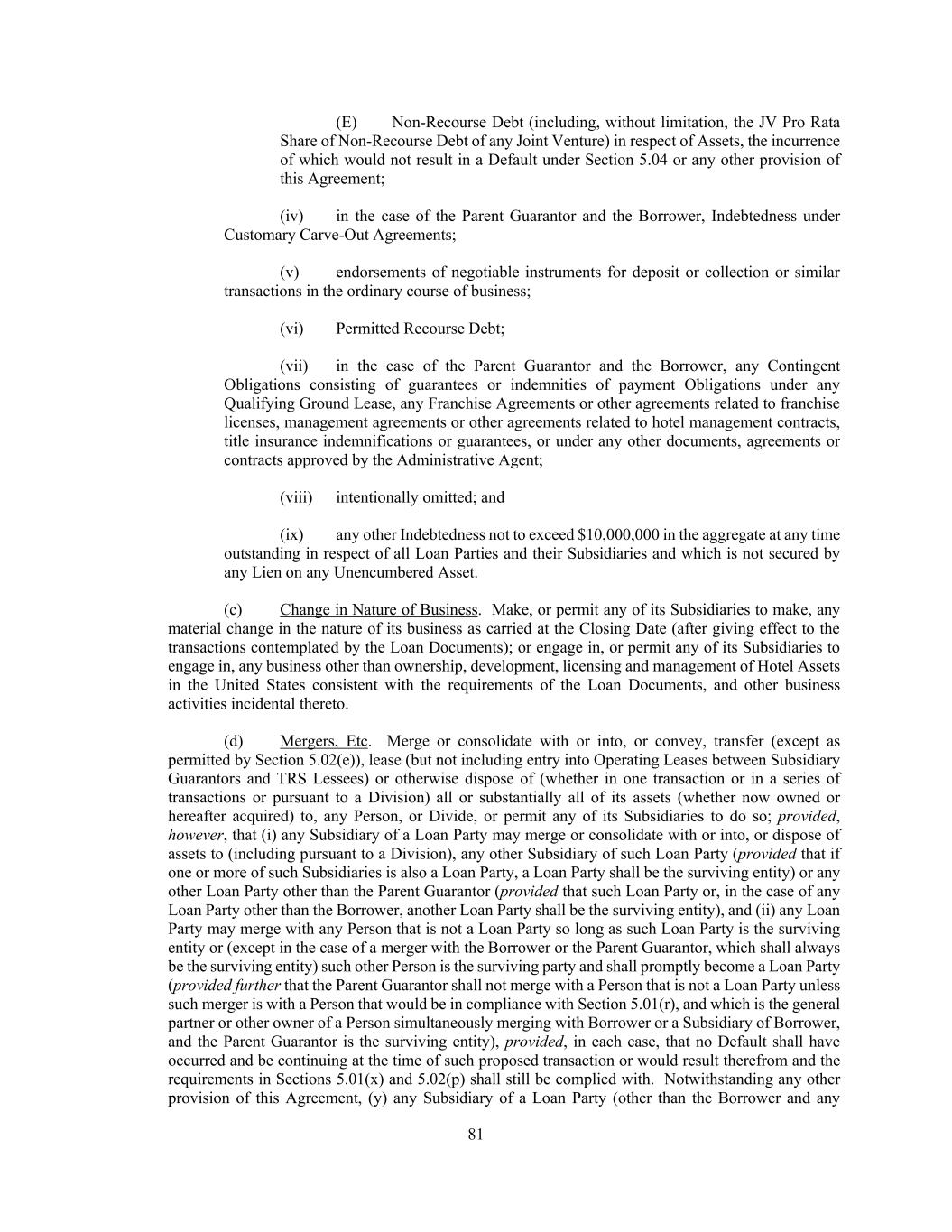 81 (E) Non-Recourse Debt (including, without limitation, the JV Pro Rata Share of Non-Recourse Debt of any Joint Venture) in respect of Assets, the incurrence of which would not result in a Default under Section 5.04 or any other provision of this Agreement; (iv) in the case of the Parent Guarantor and the Borrower, Indebtedness under Customary Carve-Out Agreements; (v) endorsements of negotiable instruments for deposit or collection or similar transactions in the ordinary course of business; (vi) Permitted Recourse Debt; (vii) in the case of the Parent Guarantor and the Borrower, any Contingent Obligations consisting of guarantees or indemnities of payment Obligations under any Qualifying Ground Lease, any Franchise Agreements or other agreements related to franchise licenses, management agreements or other agreements related to hotel management contracts, title insurance indemnifications or guarantees, or under any other documents, agreements or contracts approved by the Administrative Agent; (viii) intentionally omitted; and (ix) any other Indebtedness not to exceed $10,000,000 in the aggregate at any time outstanding in respect of all Loan Parties and their Subsidiaries and which is not secured by any Lien on any Unencumbered Asset. (c) Change in Nature of Business. Make, or permit any of its Subsidiaries to make, any material change in the nature of its business as carried at the Closing Date (after giving effect to the transactions contemplated by the Loan Documents); or engage in, or permit any of its Subsidiaries to engage in, any business other than ownership, development, licensing and management of Hotel Assets in the United States consistent with the requirements of the Loan Documents, and other business activities incidental thereto. (d) Mergers, Etc. Merge or consolidate with or into, or convey, transfer (except as permitted by Section 5.02(e)), lease (but not including entry into Operating Leases between Subsidiary Guarantors and TRS Lessees) or otherwise dispose of (whether in one transaction or in a series of transactions or pursuant to a Division) all or substantially all of its assets (whether now owned or hereafter acquired) to, any Person, or Divide, or permit any of its Subsidiaries to do so; provided, however, that (i) any Subsidiary of a Loan Party may merge or consolidate with or into, or dispose of assets to (including pursuant to a Division), any other Subsidiary of such Loan Party (provided that if one or more of such Subsidiaries is also a Loan Party, a Loan Party shall be the surviving entity) or any other Loan Party other than the Parent Guarantor (provided that such Loan Party or, in the case of any Loan Party other than the Borrower, another Loan Party shall be the surviving entity), and (ii) any Loan Party may merge with any Person that is not a Loan Party so long as such Loan Party is the surviving entity or (except in the case of a merger with the Borrower or the Parent Guarantor, which shall always be the surviving entity) such other Person is the surviving party and shall promptly become a Loan Party (provided further that the Parent Guarantor shall not merge with a Person that is not a Loan Party unless such merger is with a Person that would be in compliance with Section 5.01(r), and which is the general partner or other owner of a Person simultaneously merging with Borrower or a Subsidiary of Borrower, and the Parent Guarantor is the surviving entity), provided, in each case, that no Default shall have occurred and be continuing at the time of such proposed transaction or would result therefrom and the requirements in Sections 5.01(x) and 5.02(p) shall still be complied with. Notwithstanding any other provision of this Agreement, (y) any Subsidiary of a Loan Party (other than the Borrower and any