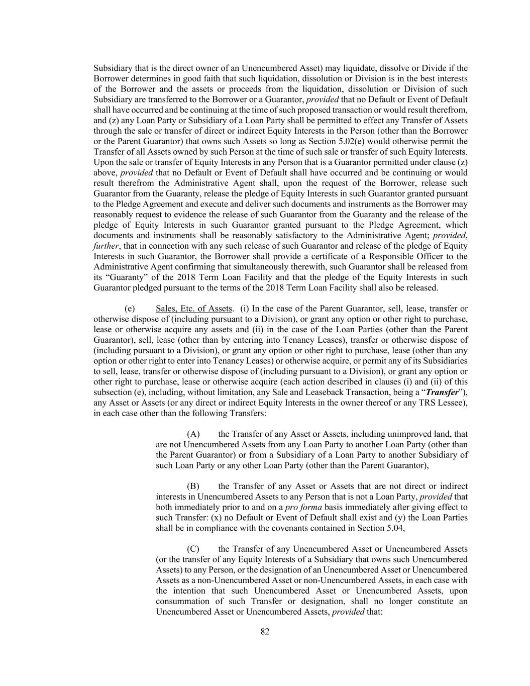 82 Subsidiary that is the direct owner of an Unencumbered Asset) may liquidate, dissolve or Divide if the Borrower determines in good faith that such liquidation, dissolution or Division is in the best interests of the Borrower and the assets or proceeds from the liquidation, dissolution or Division of such Subsidiary are transferred to the Borrower or a Guarantor, provided that no Default or Event of Default shall have occurred and be continuing at the time of such proposed transaction or would result therefrom, and (z) any Loan Party or Subsidiary of a Loan Party shall be permitted to effect any Transfer of Assets through the sale or transfer of direct or indirect Equity Interests in the Person (other than the Borrower or the Parent Guarantor) that owns such Assets so long as Section 5.02(e) would otherwise permit the Transfer of all Assets owned by such Person at the time of such sale or transfer of such Equity Interests. Upon the sale or transfer of Equity Interests in any Person that is a Guarantor permitted under clause (z) above, provided that no Default or Event of Default shall have occurred and be continuing or would result therefrom the Administrative Agent shall, upon the request of the Borrower, release such Guarantor from the Guaranty, release the pledge of Equity Interests in such Guarantor granted pursuant to the Pledge Agreement and execute and deliver such documents and instruments as the Borrower may reasonably request to evidence the release of such Guarantor from the Guaranty and the release of the pledge of Equity Interests in such Guarantor granted pursuant to the Pledge Agreement, which documents and instruments shall be reasonably satisfactory to the Administrative Agent; provided, further, that in connection with any such release of such Guarantor and release of the pledge of Equity Interests in such Guarantor, the Borrower shall provide a certificate of a Responsible Officer to the Administrative Agent confirming that simultaneously therewith, such Guarantor shall be released from its “Guaranty” of the 2018 Term Loan Facility and that the pledge of the Equity Interests in such Guarantor pledged pursuant to the terms of the 2018 Term Loan Facility shall also be released. (e) Sales, Etc. of Assets. (i) In the case of the Parent Guarantor, sell, lease, transfer or otherwise dispose of (including pursuant to a Division), or grant any option or other right to purchase, lease or otherwise acquire any assets and (ii) in the case of the Loan Parties (other than the Parent Guarantor), sell, lease (other than by entering into Tenancy Leases), transfer or otherwise dispose of (including pursuant to a Division), or grant any option or other right to purchase, lease (other than any option or other right to enter into Tenancy Leases) or otherwise acquire, or permit any of its Subsidiaries to sell, lease, transfer or otherwise dispose of (including pursuant to a Division), or grant any option or other right to purchase, lease or otherwise acquire (each action described in clauses (i) and (ii) of this subsection (e), including, without limitation, any Sale and Leaseback Transaction, being a “Transfer”), any Asset or Assets (or any direct or indirect Equity Interests in the owner thereof or any TRS Lessee), in each case other than the following Transfers: (A) the Transfer of any Asset or Assets, including unimproved land, that are not Unencumbered Assets from any Loan Party to another Loan Party (other than the Parent Guarantor) or from a Subsidiary of a Loan Party to another Subsidiary of such Loan Party or any other Loan Party (other than the Parent Guarantor), (B) the Transfer of any Asset or Assets that are not direct or indirect interests in Unencumbered Assets to any Person that is not a Loan Party, provided that both immediately prior to and on a pro forma basis immediately after giving effect to such Transfer: (x) no Default or Event of Default shall exist and (y) the Loan Parties shall be in compliance with the covenants contained in Section 5.04, (C) the Transfer of any Unencumbered Asset or Unencumbered Assets (or the transfer of any Equity Interests of a Subsidiary that owns such Unencumbered Assets) to any Person, or the designation of an Unencumbered Asset or Unencumbered Assets as a non-Unencumbered Asset or non-Unencumbered Assets, in each case with the intention that such Unencumbered Asset or Unencumbered Assets, upon consummation of such Transfer or designation, shall no longer constitute an Unencumbered Asset or Unencumbered Assets, provided that:
