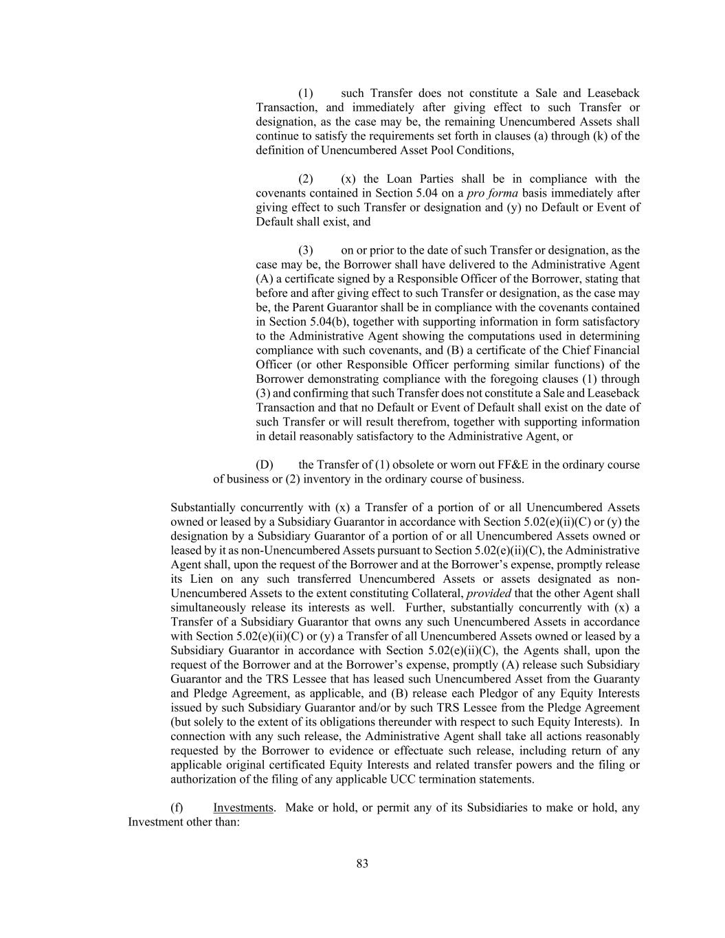 83 (1) such Transfer does not constitute a Sale and Leaseback Transaction, and immediately after giving effect to such Transfer or designation, as the case may be, the remaining Unencumbered Assets shall continue to satisfy the requirements set forth in clauses (a) through (k) of the definition of Unencumbered Asset Pool Conditions, (2) (x) the Loan Parties shall be in compliance with the covenants contained in Section 5.04 on a pro forma basis immediately after giving effect to such Transfer or designation and (y) no Default or Event of Default shall exist, and (3) on or prior to the date of such Transfer or designation, as the case may be, the Borrower shall have delivered to the Administrative Agent (A) a certificate signed by a Responsible Officer of the Borrower, stating that before and after giving effect to such Transfer or designation, as the case may be, the Parent Guarantor shall be in compliance with the covenants contained in Section 5.04(b), together with supporting information in form satisfactory to the Administrative Agent showing the computations used in determining compliance with such covenants, and (B) a certificate of the Chief Financial Officer (or other Responsible Officer performing similar functions) of the Borrower demonstrating compliance with the foregoing clauses (1) through (3) and confirming that such Transfer does not constitute a Sale and Leaseback Transaction and that no Default or Event of Default shall exist on the date of such Transfer or will result therefrom, together with supporting information in detail reasonably satisfactory to the Administrative Agent, or (D) the Transfer of (1) obsolete or worn out FF&E in the ordinary course of business or (2) inventory in the ordinary course of business. Substantially concurrently with (x) a Transfer of a portion of or all Unencumbered Assets owned or leased by a Subsidiary Guarantor in accordance with Section 5.02(e)(ii)(C) or (y) the designation by a Subsidiary Guarantor of a portion of or all Unencumbered Assets owned or leased by it as non-Unencumbered Assets pursuant to Section 5.02(e)(ii)(C), the Administrative Agent shall, upon the request of the Borrower and at the Borrower’s expense, promptly release its Lien on any such transferred Unencumbered Assets or assets designated as non- Unencumbered Assets to the extent constituting Collateral, provided that the other Agent shall simultaneously release its interests as well. Further, substantially concurrently with (x) a Transfer of a Subsidiary Guarantor that owns any such Unencumbered Assets in accordance with Section 5.02(e)(ii)(C) or (y) a Transfer of all Unencumbered Assets owned or leased by a Subsidiary Guarantor in accordance with Section 5.02(e)(ii)(C), the Agents shall, upon the request of the Borrower and at the Borrower’s expense, promptly (A) release such Subsidiary Guarantor and the TRS Lessee that has leased such Unencumbered Asset from the Guaranty and Pledge Agreement, as applicable, and (B) release each Pledgor of any Equity Interests issued by such Subsidiary Guarantor and/or by such TRS Lessee from the Pledge Agreement (but solely to the extent of its obligations thereunder with respect to such Equity Interests). In connection with any such release, the Administrative Agent shall take all actions reasonably requested by the Borrower to evidence or effectuate such release, including return of any applicable original certificated Equity Interests and related transfer powers and the filing or authorization of the filing of any applicable UCC termination statements. (f) Investments. Make or hold, or permit any of its Subsidiaries to make or hold, any Investment other than: