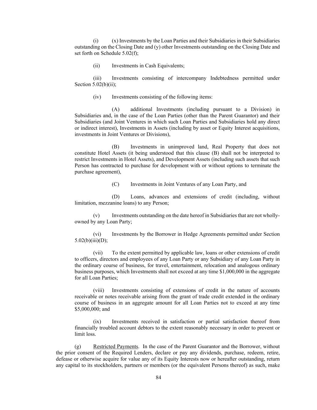 84 (i) (x) Investments by the Loan Parties and their Subsidiaries in their Subsidiaries outstanding on the Closing Date and (y) other Investments outstanding on the Closing Date and set forth on Schedule 5.02(f); (ii) Investments in Cash Equivalents; (iii) Investments consisting of intercompany Indebtedness permitted under Section 5.02(b)(ii); (iv) Investments consisting of the following items: (A) additional Investments (including pursuant to a Division) in Subsidiaries and, in the case of the Loan Parties (other than the Parent Guarantor) and their Subsidiaries (and Joint Ventures in which such Loan Parties and Subsidiaries hold any direct or indirect interest), Investments in Assets (including by asset or Equity Interest acquisitions, investments in Joint Ventures or Divisions), (B) Investments in unimproved land, Real Property that does not constitute Hotel Assets (it being understood that this clause (B) shall not be interpreted to restrict Investments in Hotel Assets), and Development Assets (including such assets that such Person has contracted to purchase for development with or without options to terminate the purchase agreement), (C) Investments in Joint Ventures of any Loan Party, and (D) Loans, advances and extensions of credit (including, without limitation, mezzanine loans) to any Person; (v) Investments outstanding on the date hereof in Subsidiaries that are not wholly- owned by any Loan Party; (vi) Investments by the Borrower in Hedge Agreements permitted under Section 5.02(b)(iii)(D); (vii) To the extent permitted by applicable law, loans or other extensions of credit to officers, directors and employees of any Loan Party or any Subsidiary of any Loan Party in the ordinary course of business, for travel, entertainment, relocation and analogous ordinary business purposes, which Investments shall not exceed at any time $1,000,000 in the aggregate for all Loan Parties; (viii) Investments consisting of extensions of credit in the nature of accounts receivable or notes receivable arising from the grant of trade credit extended in the ordinary course of business in an aggregate amount for all Loan Parties not to exceed at any time $5,000,000; and (ix) Investments received in satisfaction or partial satisfaction thereof from financially troubled account debtors to the extent reasonably necessary in order to prevent or limit loss. (g) Restricted Payments. In the case of the Parent Guarantor and the Borrower, without the prior consent of the Required Lenders, declare or pay any dividends, purchase, redeem, retire, defease or otherwise acquire for value any of its Equity Interests now or hereafter outstanding, return any capital to its stockholders, partners or members (or the equivalent Persons thereof) as such, make