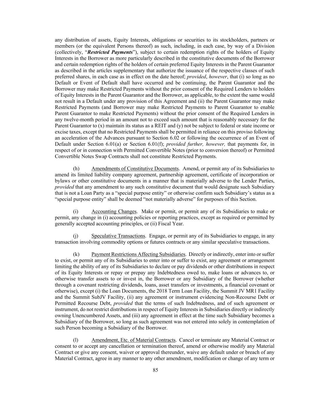 85 any distribution of assets, Equity Interests, obligations or securities to its stockholders, partners or members (or the equivalent Persons thereof) as such, including, in each case, by way of a Division (collectively, “Restricted Payments”), subject to certain redemption rights of the holders of Equity Interests in the Borrower as more particularly described in the constitutive documents of the Borrower and certain redemption rights of the holders of certain preferred Equity Interests in the Parent Guarantor as described in the articles supplementary that authorize the issuance of the respective classes of such preferred shares, in each case as in effect on the date hereof; provided, however, that (i) so long as no Default or Event of Default shall have occurred and be continuing, the Parent Guarantor and the Borrower may make Restricted Payments without the prior consent of the Required Lenders to holders of Equity Interests in the Parent Guarantor and the Borrower, as applicable, to the extent the same would not result in a Default under any provision of this Agreement and (ii) the Parent Guarantor may make Restricted Payments (and Borrower may make Restricted Payments to Parent Guarantor to enable Parent Guarantor to make Restricted Payments) without the prior consent of the Required Lenders in any twelve-month period in an amount not to exceed such amount that is reasonably necessary for the Parent Guarantor to (x) maintain its status as a REIT and (y) not be subject to federal or state income or excise taxes, except that no Restricted Payments shall be permitted in reliance on this proviso following an acceleration of the Advances pursuant to Section 6.02 or following the occurrence of an Event of Default under Section 6.01(a) or Section 6.01(f); provided further, however, that payments for, in respect of or in connection with Permitted Convertible Notes (prior to conversion thereof) or Permitted Convertible Notes Swap Contracts shall not constitute Restricted Payments. (h) Amendments of Constitutive Documents. Amend, or permit any of its Subsidiaries to amend its limited liability company agreement, partnership agreement, certificate of incorporation or bylaws or other constitutive documents in a manner that is materially adverse to the Lender Parties, provided that any amendment to any such constitutive document that would designate such Subsidiary that is not a Loan Party as a “special purpose entity” or otherwise confirm such Subsidiary’s status as a “special purpose entity” shall be deemed “not materially adverse” for purposes of this Section. (i) Accounting Changes. Make or permit, or permit any of its Subsidiaries to make or permit, any change in (i) accounting policies or reporting practices, except as required or permitted by generally accepted accounting principles, or (ii) Fiscal Year. (j) Speculative Transactions. Engage, or permit any of its Subsidiaries to engage, in any transaction involving commodity options or futures contracts or any similar speculative transactions. (k) Payment Restrictions Affecting Subsidiaries. Directly or indirectly, enter into or suffer to exist, or permit any of its Subsidiaries to enter into or suffer to exist, any agreement or arrangement limiting the ability of any of its Subsidiaries to declare or pay dividends or other distributions in respect of its Equity Interests or repay or prepay any Indebtedness owed to, make loans or advances to, or otherwise transfer assets to or invest in, the Borrower or any Subsidiary of the Borrower (whether through a covenant restricting dividends, loans, asset transfers or investments, a financial covenant or otherwise), except (i) the Loan Documents, the 2018 Term Loan Facility, the Summit JV MR1 Facility and the Summit SubJV Facility, (ii) any agreement or instrument evidencing Non-Recourse Debt or Permitted Recourse Debt, provided that the terms of such Indebtedness, and of such agreement or instrument, do not restrict distributions in respect of Equity Interests in Subsidiaries directly or indirectly owning Unencumbered Assets, and (iii) any agreement in effect at the time such Subsidiary becomes a Subsidiary of the Borrower, so long as such agreement was not entered into solely in contemplation of such Person becoming a Subsidiary of the Borrower. (l) Amendment, Etc. of Material Contracts. Cancel or terminate any Material Contract or consent to or accept any cancellation or termination thereof, amend or otherwise modify any Material Contract or give any consent, waiver or approval thereunder, waive any default under or breach of any Material Contract, agree in any manner to any other amendment, modification or change of any term or