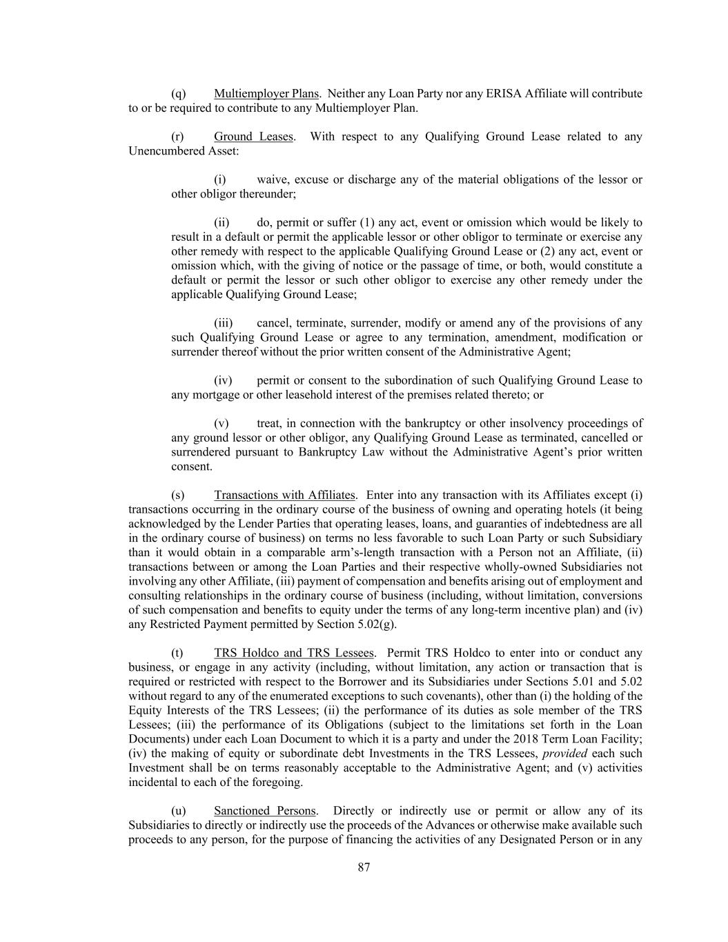 87 (q) Multiemployer Plans. Neither any Loan Party nor any ERISA Affiliate will contribute to or be required to contribute to any Multiemployer Plan. (r) Ground Leases. With respect to any Qualifying Ground Lease related to any Unencumbered Asset: (i) waive, excuse or discharge any of the material obligations of the lessor or other obligor thereunder; (ii) do, permit or suffer (1) any act, event or omission which would be likely to result in a default or permit the applicable lessor or other obligor to terminate or exercise any other remedy with respect to the applicable Qualifying Ground Lease or (2) any act, event or omission which, with the giving of notice or the passage of time, or both, would constitute a default or permit the lessor or such other obligor to exercise any other remedy under the applicable Qualifying Ground Lease; (iii) cancel, terminate, surrender, modify or amend any of the provisions of any such Qualifying Ground Lease or agree to any termination, amendment, modification or surrender thereof without the prior written consent of the Administrative Agent; (iv) permit or consent to the subordination of such Qualifying Ground Lease to any mortgage or other leasehold interest of the premises related thereto; or (v) treat, in connection with the bankruptcy or other insolvency proceedings of any ground lessor or other obligor, any Qualifying Ground Lease as terminated, cancelled or surrendered pursuant to Bankruptcy Law without the Administrative Agent’s prior written consent. (s) Transactions with Affiliates. Enter into any transaction with its Affiliates except (i) transactions occurring in the ordinary course of the business of owning and operating hotels (it being acknowledged by the Lender Parties that operating leases, loans, and guaranties of indebtedness are all in the ordinary course of business) on terms no less favorable to such Loan Party or such Subsidiary than it would obtain in a comparable arm’s-length transaction with a Person not an Affiliate, (ii) transactions between or among the Loan Parties and their respective wholly-owned Subsidiaries not involving any other Affiliate, (iii) payment of compensation and benefits arising out of employment and consulting relationships in the ordinary course of business (including, without limitation, conversions of such compensation and benefits to equity under the terms of any long-term incentive plan) and (iv) any Restricted Payment permitted by Section 5.02(g). (t) TRS Holdco and TRS Lessees. Permit TRS Holdco to enter into or conduct any business, or engage in any activity (including, without limitation, any action or transaction that is required or restricted with respect to the Borrower and its Subsidiaries under Sections 5.01 and 5.02 without regard to any of the enumerated exceptions to such covenants), other than (i) the holding of the Equity Interests of the TRS Lessees; (ii) the performance of its duties as sole member of the TRS Lessees; (iii) the performance of its Obligations (subject to the limitations set forth in the Loan Documents) under each Loan Document to which it is a party and under the 2018 Term Loan Facility; (iv) the making of equity or subordinate debt Investments in the TRS Lessees, provided each such Investment shall be on terms reasonably acceptable to the Administrative Agent; and (v) activities incidental to each of the foregoing. (u) Sanctioned Persons. Directly or indirectly use or permit or allow any of its Subsidiaries to directly or indirectly use the proceeds of the Advances or otherwise make available such proceeds to any person, for the purpose of financing the activities of any Designated Person or in any