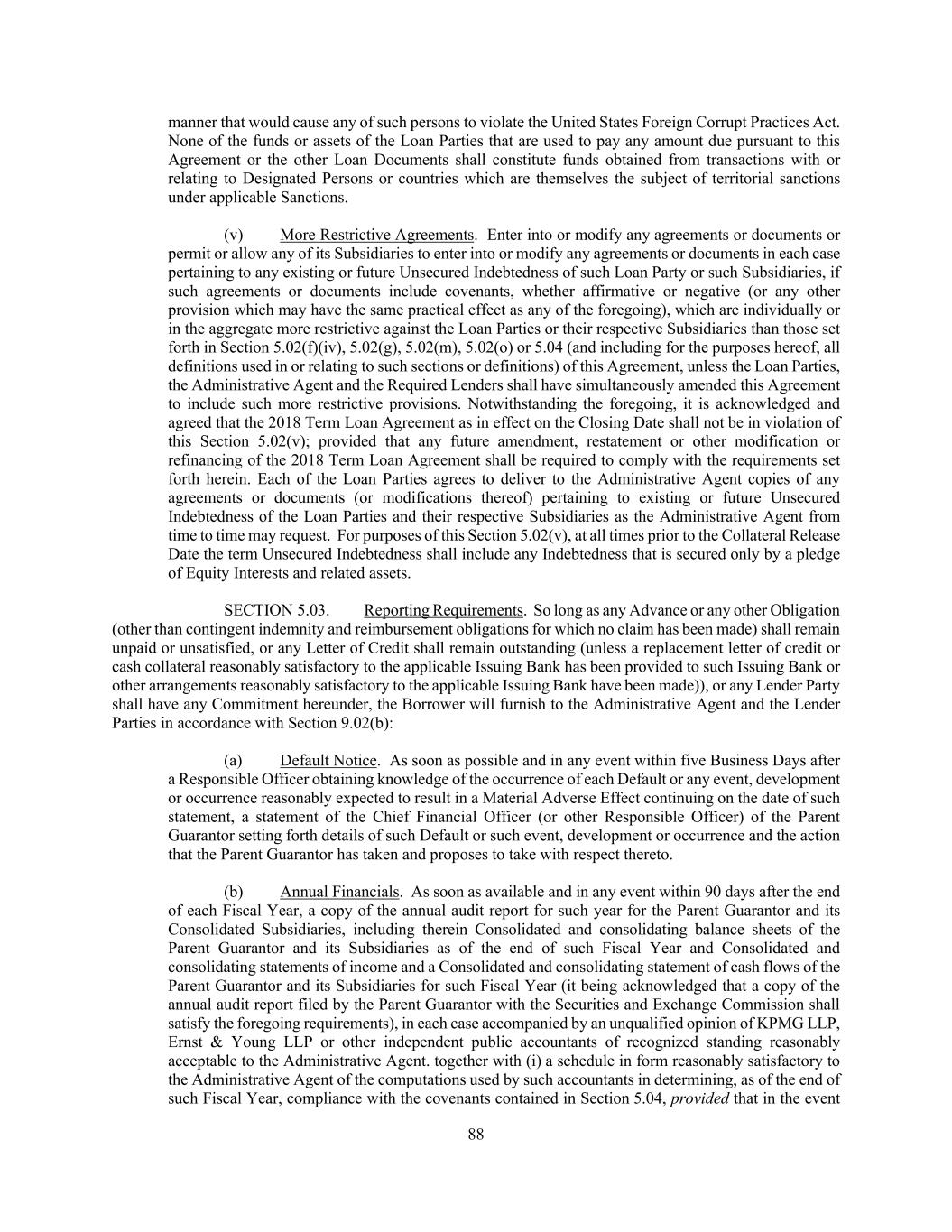 88 manner that would cause any of such persons to violate the United States Foreign Corrupt Practices Act. None of the funds or assets of the Loan Parties that are used to pay any amount due pursuant to this Agreement or the other Loan Documents shall constitute funds obtained from transactions with or relating to Designated Persons or countries which are themselves the subject of territorial sanctions under applicable Sanctions. (v) More Restrictive Agreements. Enter into or modify any agreements or documents or permit or allow any of its Subsidiaries to enter into or modify any agreements or documents in each case pertaining to any existing or future Unsecured Indebtedness of such Loan Party or such Subsidiaries, if such agreements or documents include covenants, whether affirmative or negative (or any other provision which may have the same practical effect as any of the foregoing), which are individually or in the aggregate more restrictive against the Loan Parties or their respective Subsidiaries than those set forth in Section 5.02(f)(iv), 5.02(g), 5.02(m), 5.02(o) or 5.04 (and including for the purposes hereof, all definitions used in or relating to such sections or definitions) of this Agreement, unless the Loan Parties, the Administrative Agent and the Required Lenders shall have simultaneously amended this Agreement to include such more restrictive provisions. Notwithstanding the foregoing, it is acknowledged and agreed that the 2018 Term Loan Agreement as in effect on the Closing Date shall not be in violation of this Section 5.02(v); provided that any future amendment, restatement or other modification or refinancing of the 2018 Term Loan Agreement shall be required to comply with the requirements set forth herein. Each of the Loan Parties agrees to deliver to the Administrative Agent copies of any agreements or documents (or modifications thereof) pertaining to existing or future Unsecured Indebtedness of the Loan Parties and their respective Subsidiaries as the Administrative Agent from time to time may request. For purposes of this Section 5.02(v), at all times prior to the Collateral Release Date the term Unsecured Indebtedness shall include any Indebtedness that is secured only by a pledge of Equity Interests and related assets. SECTION 5.03. Reporting Requirements. So long as any Advance or any other Obligation (other than contingent indemnity and reimbursement obligations for which no claim has been made) shall remain unpaid or unsatisfied, or any Letter of Credit shall remain outstanding (unless a replacement letter of credit or cash collateral reasonably satisfactory to the applicable Issuing Bank has been provided to such Issuing Bank or other arrangements reasonably satisfactory to the applicable Issuing Bank have been made)), or any Lender Party shall have any Commitment hereunder, the Borrower will furnish to the Administrative Agent and the Lender Parties in accordance with Section 9.02(b): (a) Default Notice. As soon as possible and in any event within five Business Days after a Responsible Officer obtaining knowledge of the occurrence of each Default or any event, development or occurrence reasonably expected to result in a Material Adverse Effect continuing on the date of such statement, a statement of the Chief Financial Officer (or other Responsible Officer) of the Parent Guarantor setting forth details of such Default or such event, development or occurrence and the action that the Parent Guarantor has taken and proposes to take with respect thereto. (b) Annual Financials. As soon as available and in any event within 90 days after the end of each Fiscal Year, a copy of the annual audit report for such year for the Parent Guarantor and its Consolidated Subsidiaries, including therein Consolidated and consolidating balance sheets of the Parent Guarantor and its Subsidiaries as of the end of such Fiscal Year and Consolidated and consolidating statements of income and a Consolidated and consolidating statement of cash flows of the Parent Guarantor and its Subsidiaries for such Fiscal Year (it being acknowledged that a copy of the annual audit report filed by the Parent Guarantor with the Securities and Exchange Commission shall satisfy the foregoing requirements), in each case accompanied by an unqualified opinion of KPMG LLP, Ernst & Young LLP or other independent public accountants of recognized standing reasonably acceptable to the Administrative Agent. together with (i) a schedule in form reasonably satisfactory to the Administrative Agent of the computations used by such accountants in determining, as of the end of such Fiscal Year, compliance with the covenants contained in Section 5.04, provided that in the event