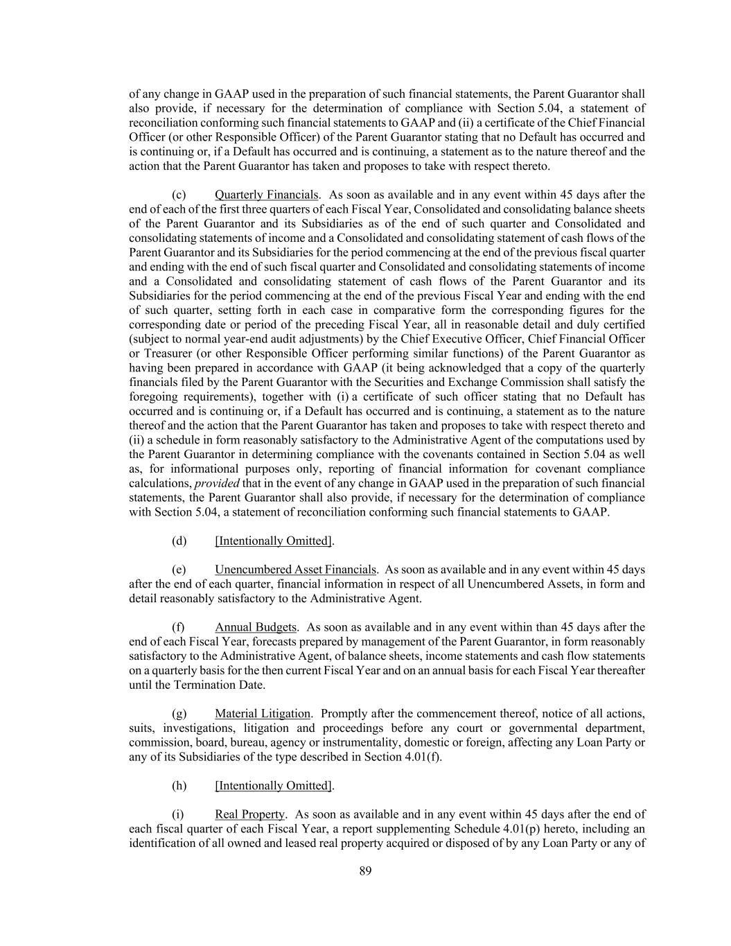 89 of any change in GAAP used in the preparation of such financial statements, the Parent Guarantor shall also provide, if necessary for the determination of compliance with Section 5.04, a statement of reconciliation conforming such financial statements to GAAP and (ii) a certificate of the Chief Financial Officer (or other Responsible Officer) of the Parent Guarantor stating that no Default has occurred and is continuing or, if a Default has occurred and is continuing, a statement as to the nature thereof and the action that the Parent Guarantor has taken and proposes to take with respect thereto. (c) Quarterly Financials. As soon as available and in any event within 45 days after the end of each of the first three quarters of each Fiscal Year, Consolidated and consolidating balance sheets of the Parent Guarantor and its Subsidiaries as of the end of such quarter and Consolidated and consolidating statements of income and a Consolidated and consolidating statement of cash flows of the Parent Guarantor and its Subsidiaries for the period commencing at the end of the previous fiscal quarter and ending with the end of such fiscal quarter and Consolidated and consolidating statements of income and a Consolidated and consolidating statement of cash flows of the Parent Guarantor and its Subsidiaries for the period commencing at the end of the previous Fiscal Year and ending with the end of such quarter, setting forth in each case in comparative form the corresponding figures for the corresponding date or period of the preceding Fiscal Year, all in reasonable detail and duly certified (subject to normal year-end audit adjustments) by the Chief Executive Officer, Chief Financial Officer or Treasurer (or other Responsible Officer performing similar functions) of the Parent Guarantor as having been prepared in accordance with GAAP (it being acknowledged that a copy of the quarterly financials filed by the Parent Guarantor with the Securities and Exchange Commission shall satisfy the foregoing requirements), together with (i) a certificate of such officer stating that no Default has occurred and is continuing or, if a Default has occurred and is continuing, a statement as to the nature thereof and the action that the Parent Guarantor has taken and proposes to take with respect thereto and (ii) a schedule in form reasonably satisfactory to the Administrative Agent of the computations used by the Parent Guarantor in determining compliance with the covenants contained in Section 5.04 as well as, for informational purposes only, reporting of financial information for covenant compliance calculations, provided that in the event of any change in GAAP used in the preparation of such financial statements, the Parent Guarantor shall also provide, if necessary for the determination of compliance with Section 5.04, a statement of reconciliation conforming such financial statements to GAAP. (d) [Intentionally Omitted]. (e) Unencumbered Asset Financials. As soon as available and in any event within 45 days after the end of each quarter, financial information in respect of all Unencumbered Assets, in form and detail reasonably satisfactory to the Administrative Agent. (f) Annual Budgets. As soon as available and in any event within than 45 days after the end of each Fiscal Year, forecasts prepared by management of the Parent Guarantor, in form reasonably satisfactory to the Administrative Agent, of balance sheets, income statements and cash flow statements on a quarterly basis for the then current Fiscal Year and on an annual basis for each Fiscal Year thereafter until the Termination Date. (g) Material Litigation. Promptly after the commencement thereof, notice of all actions, suits, investigations, litigation and proceedings before any court or governmental department, commission, board, bureau, agency or instrumentality, domestic or foreign, affecting any Loan Party or any of its Subsidiaries of the type described in Section 4.01(f). (h) [Intentionally Omitted]. (i) Real Property. As soon as available and in any event within 45 days after the end of each fiscal quarter of each Fiscal Year, a report supplementing Schedule 4.01(p) hereto, including an identification of all owned and leased real property acquired or disposed of by any Loan Party or any of