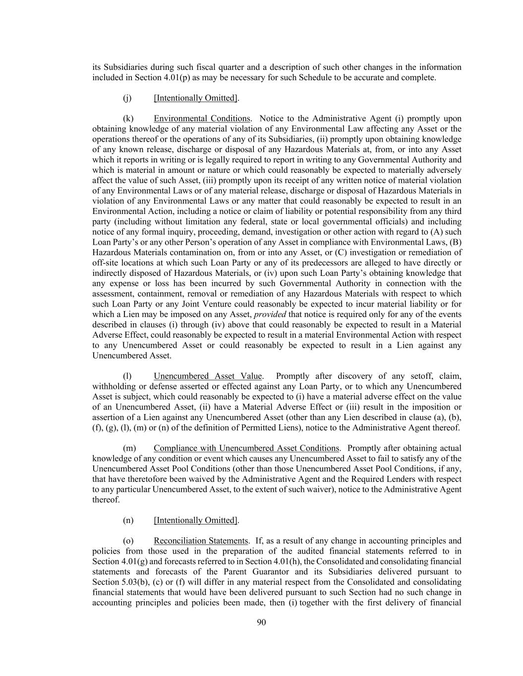 90 its Subsidiaries during such fiscal quarter and a description of such other changes in the information included in Section 4.01(p) as may be necessary for such Schedule to be accurate and complete. (j) [Intentionally Omitted]. (k) Environmental Conditions. Notice to the Administrative Agent (i) promptly upon obtaining knowledge of any material violation of any Environmental Law affecting any Asset or the operations thereof or the operations of any of its Subsidiaries, (ii) promptly upon obtaining knowledge of any known release, discharge or disposal of any Hazardous Materials at, from, or into any Asset which it reports in writing or is legally required to report in writing to any Governmental Authority and which is material in amount or nature or which could reasonably be expected to materially adversely affect the value of such Asset, (iii) promptly upon its receipt of any written notice of material violation of any Environmental Laws or of any material release, discharge or disposal of Hazardous Materials in violation of any Environmental Laws or any matter that could reasonably be expected to result in an Environmental Action, including a notice or claim of liability or potential responsibility from any third party (including without limitation any federal, state or local governmental officials) and including notice of any formal inquiry, proceeding, demand, investigation or other action with regard to (A) such Loan Party’s or any other Person’s operation of any Asset in compliance with Environmental Laws, (B) Hazardous Materials contamination on, from or into any Asset, or (C) investigation or remediation of off-site locations at which such Loan Party or any of its predecessors are alleged to have directly or indirectly disposed of Hazardous Materials, or (iv) upon such Loan Party’s obtaining knowledge that any expense or loss has been incurred by such Governmental Authority in connection with the assessment, containment, removal or remediation of any Hazardous Materials with respect to which such Loan Party or any Joint Venture could reasonably be expected to incur material liability or for which a Lien may be imposed on any Asset, provided that notice is required only for any of the events described in clauses (i) through (iv) above that could reasonably be expected to result in a Material Adverse Effect, could reasonably be expected to result in a material Environmental Action with respect to any Unencumbered Asset or could reasonably be expected to result in a Lien against any Unencumbered Asset. (l) Unencumbered Asset Value. Promptly after discovery of any setoff, claim, withholding or defense asserted or effected against any Loan Party, or to which any Unencumbered Asset is subject, which could reasonably be expected to (i) have a material adverse effect on the value of an Unencumbered Asset, (ii) have a Material Adverse Effect or (iii) result in the imposition or assertion of a Lien against any Unencumbered Asset (other than any Lien described in clause (a), (b), (f), (g), (l), (m) or (n) of the definition of Permitted Liens), notice to the Administrative Agent thereof. (m) Compliance with Unencumbered Asset Conditions. Promptly after obtaining actual knowledge of any condition or event which causes any Unencumbered Asset to fail to satisfy any of the Unencumbered Asset Pool Conditions (other than those Unencumbered Asset Pool Conditions, if any, that have theretofore been waived by the Administrative Agent and the Required Lenders with respect to any particular Unencumbered Asset, to the extent of such waiver), notice to the Administrative Agent thereof. (n) [Intentionally Omitted]. (o) Reconciliation Statements. If, as a result of any change in accounting principles and policies from those used in the preparation of the audited financial statements referred to in Section 4.01(g) and forecasts referred to in Section 4.01(h), the Consolidated and consolidating financial statements and forecasts of the Parent Guarantor and its Subsidiaries delivered pursuant to Section 5.03(b), (c) or (f) will differ in any material respect from the Consolidated and consolidating financial statements that would have been delivered pursuant to such Section had no such change in accounting principles and policies been made, then (i) together with the first delivery of financial
