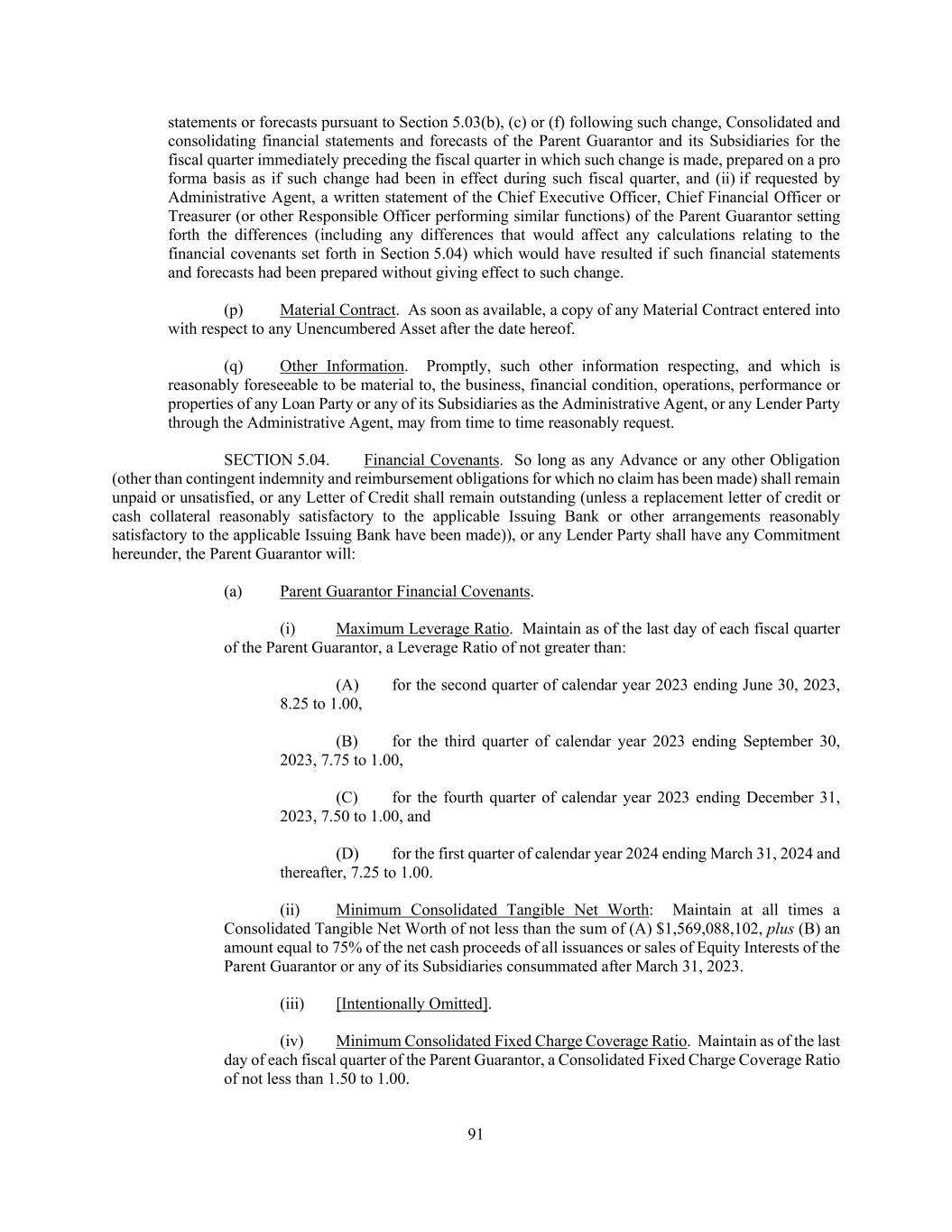 91 statements or forecasts pursuant to Section 5.03(b), (c) or (f) following such change, Consolidated and consolidating financial statements and forecasts of the Parent Guarantor and its Subsidiaries for the fiscal quarter immediately preceding the fiscal quarter in which such change is made, prepared on a pro forma basis as if such change had been in effect during such fiscal quarter, and (ii) if requested by Administrative Agent, a written statement of the Chief Executive Officer, Chief Financial Officer or Treasurer (or other Responsible Officer performing similar functions) of the Parent Guarantor setting forth the differences (including any differences that would affect any calculations relating to the financial covenants set forth in Section 5.04) which would have resulted if such financial statements and forecasts had been prepared without giving effect to such change. (p) Material Contract. As soon as available, a copy of any Material Contract entered into with respect to any Unencumbered Asset after the date hereof. (q) Other Information. Promptly, such other information respecting, and which is reasonably foreseeable to be material to, the business, financial condition, operations, performance or properties of any Loan Party or any of its Subsidiaries as the Administrative Agent, or any Lender Party through the Administrative Agent, may from time to time reasonably request. SECTION 5.04. Financial Covenants. So long as any Advance or any other Obligation (other than contingent indemnity and reimbursement obligations for which no claim has been made) shall remain unpaid or unsatisfied, or any Letter of Credit shall remain outstanding (unless a replacement letter of credit or cash collateral reasonably satisfactory to the applicable Issuing Bank or other arrangements reasonably satisfactory to the applicable Issuing Bank have been made)), or any Lender Party shall have any Commitment hereunder, the Parent Guarantor will: (a) Parent Guarantor Financial Covenants. (i) Maximum Leverage Ratio. Maintain as of the last day of each fiscal quarter of the Parent Guarantor, a Leverage Ratio of not greater than: (A) for the second quarter of calendar year 2023 ending June 30, 2023, 8.25 to 1.00, (B) for the third quarter of calendar year 2023 ending September 30, 2023, 7.75 to 1.00, (C) for the fourth quarter of calendar year 2023 ending December 31, 2023, 7.50 to 1.00, and (D) for the first quarter of calendar year 2024 ending March 31, 2024 and thereafter, 7.25 to 1.00. (ii) Minimum Consolidated Tangible Net Worth: Maintain at all times a Consolidated Tangible Net Worth of not less than the sum of (A) $1,569,088,102, plus (B) an amount equal to 75% of the net cash proceeds of all issuances or sales of Equity Interests of the Parent Guarantor or any of its Subsidiaries consummated after March 31, 2023. (iii) [Intentionally Omitted]. (iv) Minimum Consolidated Fixed Charge Coverage Ratio. Maintain as of the last day of each fiscal quarter of the Parent Guarantor, a Consolidated Fixed Charge Coverage Ratio of not less than 1.50 to 1.00.