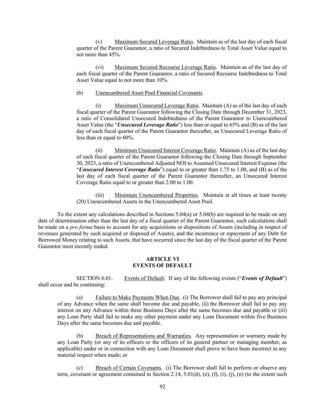 92 (v) Maximum Secured Leverage Ratio. Maintain as of the last day of each fiscal quarter of the Parent Guarantor, a ratio of Secured Indebtedness to Total Asset Value equal to not more than 45%. (vi) Maximum Secured Recourse Leverage Ratio. Maintain as of the last day of each fiscal quarter of the Parent Guarantor, a ratio of Secured Recourse Indebtedness to Total Asset Value equal to not more than 10%. (b) Unencumbered Asset Pool Financial Covenants. (i) Maximum Unsecured Leverage Ratio. Maintain (A) as of the last day of each fiscal quarter of the Parent Guarantor following the Closing Date through December 31, 2023, a ratio of Consolidated Unsecured Indebtedness of the Parent Guarantor to Unencumbered Asset Value (the “Unsecured Leverage Ratio”) less than or equal to 65% and (B) as of the last day of each fiscal quarter of the Parent Guarantor thereafter, an Unsecured Leverage Ratio of less than or equal to 60%. (ii) Minimum Unsecured Interest Coverage Ratio. Maintain (A) as of the last day of each fiscal quarter of the Parent Guarantor following the Closing Date through September 30, 2023, a ratio of Unencumbered Adjusted NOI to Assumed Unsecured Interest Expense (the “Unsecured Interest Coverage Ratio”) equal to or greater than 1.75 to 1.00, and (B) as of the last day of each fiscal quarter of the Parent Guarantor thereafter, an Unsecured Interest Coverage Ratio equal to or greater than 2.00 to 1.00. (iii) Minimum Unencumbered Properties. Maintain at all times at least twenty (20) Unencumbered Assets in the Unencumbered Asset Pool. To the extent any calculations described in Sections 5.04(a) or 5.04(b) are required to be made on any date of determination other than the last day of a fiscal quarter of the Parent Guarantor, such calculations shall be made on a pro forma basis to account for any acquisitions or dispositions of Assets (including in respect of revenues generated by such acquired or disposed of Assets), and the incurrence or repayment of any Debt for Borrowed Money relating to such Assets, that have occurred since the last day of the fiscal quarter of the Parent Guarantor most recently ended. ARTICLE VI EVENTS OF DEFAULT SECTION 6.01. Events of Default. If any of the following events (“Events of Default”) shall occur and be continuing: (a) Failure to Make Payments When Due. (i) The Borrower shall fail to pay any principal of any Advance when the same shall become due and payable, (ii) the Borrower shall fail to pay any interest on any Advance within three Business Days after the same becomes due and payable or (iii) any Loan Party shall fail to make any other payment under any Loan Document within five Business Days after the same becomes due and payable. (b) Breach of Representations and Warranties. Any representation or warranty made by any Loan Party (or any of its officers or the officers of its general partner or managing member, as applicable) under or in connection with any Loan Document shall prove to have been incorrect in any material respect when made; or (c) Breach of Certain Covenants. (i) The Borrower shall fail to perform or observe any term, covenant or agreement contained in Section 2.14, 5.01(d), (e), (f), (i), (j), (n) (to the extent such