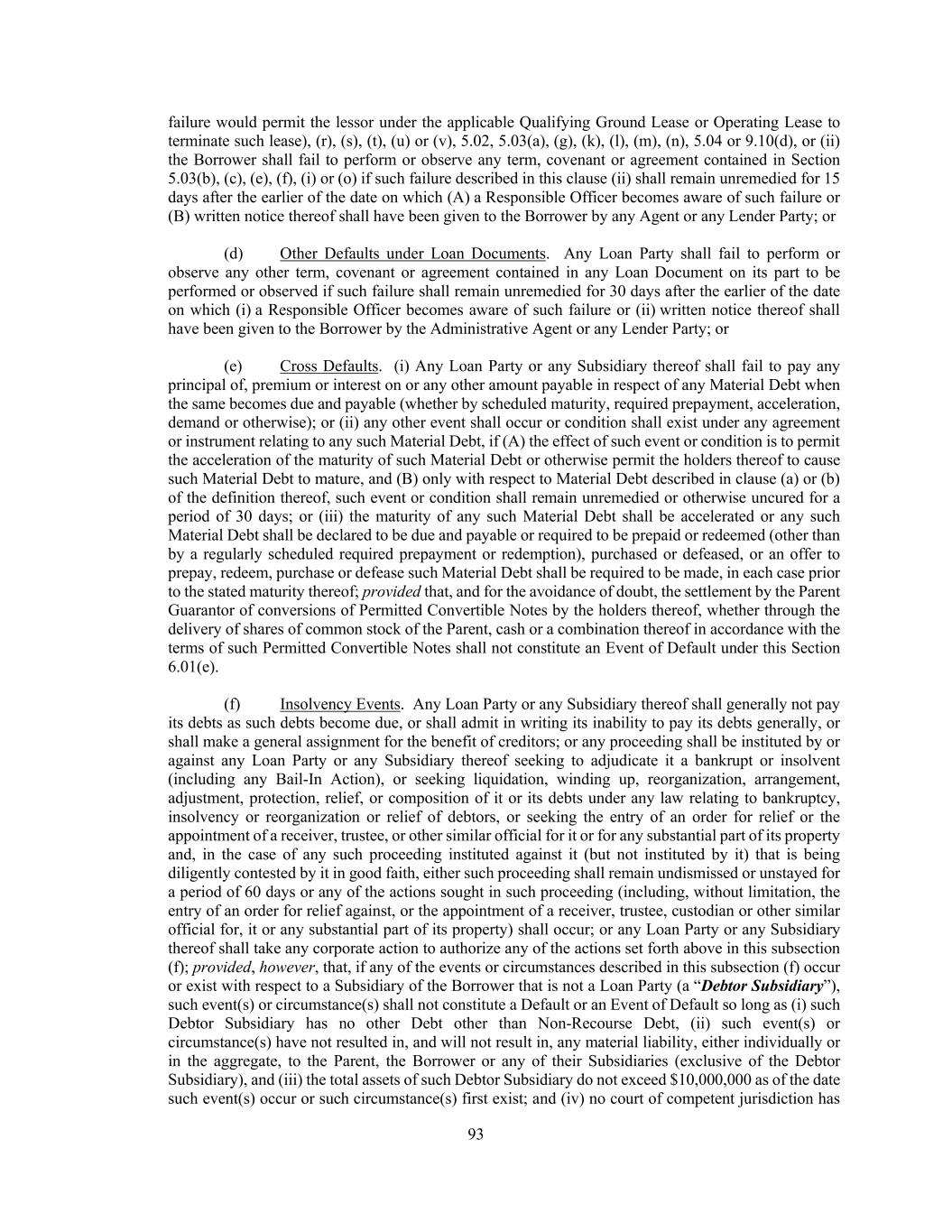 93 failure would permit the lessor under the applicable Qualifying Ground Lease or Operating Lease to terminate such lease), (r), (s), (t), (u) or (v), 5.02, 5.03(a), (g), (k), (l), (m), (n), 5.04 or 9.10(d), or (ii) the Borrower shall fail to perform or observe any term, covenant or agreement contained in Section 5.03(b), (c), (e), (f), (i) or (o) if such failure described in this clause (ii) shall remain unremedied for 15 days after the earlier of the date on which (A) a Responsible Officer becomes aware of such failure or (B) written notice thereof shall have been given to the Borrower by any Agent or any Lender Party; or (d) Other Defaults under Loan Documents. Any Loan Party shall fail to perform or observe any other term, covenant or agreement contained in any Loan Document on its part to be performed or observed if such failure shall remain unremedied for 30 days after the earlier of the date on which (i) a Responsible Officer becomes aware of such failure or (ii) written notice thereof shall have been given to the Borrower by the Administrative Agent or any Lender Party; or (e) Cross Defaults. (i) Any Loan Party or any Subsidiary thereof shall fail to pay any principal of, premium or interest on or any other amount payable in respect of any Material Debt when the same becomes due and payable (whether by scheduled maturity, required prepayment, acceleration, demand or otherwise); or (ii) any other event shall occur or condition shall exist under any agreement or instrument relating to any such Material Debt, if (A) the effect of such event or condition is to permit the acceleration of the maturity of such Material Debt or otherwise permit the holders thereof to cause such Material Debt to mature, and (B) only with respect to Material Debt described in clause (a) or (b) of the definition thereof, such event or condition shall remain unremedied or otherwise uncured for a period of 30 days; or (iii) the maturity of any such Material Debt shall be accelerated or any such Material Debt shall be declared to be due and payable or required to be prepaid or redeemed (other than by a regularly scheduled required prepayment or redemption), purchased or defeased, or an offer to prepay, redeem, purchase or defease such Material Debt shall be required to be made, in each case prior to the stated maturity thereof; provided that, and for the avoidance of doubt, the settlement by the Parent Guarantor of conversions of Permitted Convertible Notes by the holders thereof, whether through the delivery of shares of common stock of the Parent, cash or a combination thereof in accordance with the terms of such Permitted Convertible Notes shall not constitute an Event of Default under this Section 6.01(e). (f) Insolvency Events. Any Loan Party or any Subsidiary thereof shall generally not pay its debts as such debts become due, or shall admit in writing its inability to pay its debts generally, or shall make a general assignment for the benefit of creditors; or any proceeding shall be instituted by or against any Loan Party or any Subsidiary thereof seeking to adjudicate it a bankrupt or insolvent (including any Bail-In Action), or seeking liquidation, winding up, reorganization, arrangement, adjustment, protection, relief, or composition of it or its debts under any law relating to bankruptcy, insolvency or reorganization or relief of debtors, or seeking the entry of an order for relief or the appointment of a receiver, trustee, or other similar official for it or for any substantial part of its property and, in the case of any such proceeding instituted against it (but not instituted by it) that is being diligently contested by it in good faith, either such proceeding shall remain undismissed or unstayed for a period of 60 days or any of the actions sought in such proceeding (including, without limitation, the entry of an order for relief against, or the appointment of a receiver, trustee, custodian or other similar official for, it or any substantial part of its property) shall occur; or any Loan Party or any Subsidiary thereof shall take any corporate action to authorize any of the actions set forth above in this subsection (f); provided, however, that, if any of the events or circumstances described in this subsection (f) occur or exist with respect to a Subsidiary of the Borrower that is not a Loan Party (a “Debtor Subsidiary”), such event(s) or circumstance(s) shall not constitute a Default or an Event of Default so long as (i) such Debtor Subsidiary has no other Debt other than Non-Recourse Debt, (ii) such event(s) or circumstance(s) have not resulted in, and will not result in, any material liability, either individually or in the aggregate, to the Parent, the Borrower or any of their Subsidiaries (exclusive of the Debtor Subsidiary), and (iii) the total assets of such Debtor Subsidiary do not exceed $10,000,000 as of the date such event(s) occur or such circumstance(s) first exist; and (iv) no court of competent jurisdiction has