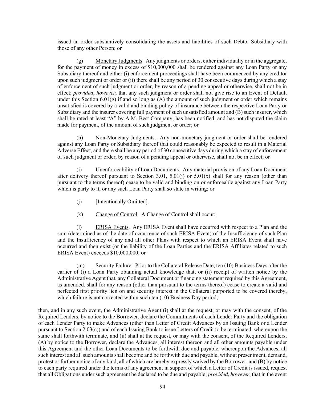 94 issued an order substantively consolidating the assets and liabilities of such Debtor Subsidiary with those of any other Person; or (g) Monetary Judgments. Any judgments or orders, either individually or in the aggregate, for the payment of money in excess of $10,000,000 shall be rendered against any Loan Party or any Subsidiary thereof and either (i) enforcement proceedings shall have been commenced by any creditor upon such judgment or order or (ii) there shall be any period of 30 consecutive days during which a stay of enforcement of such judgment or order, by reason of a pending appeal or otherwise, shall not be in effect; provided, however, that any such judgment or order shall not give rise to an Event of Default under this Section 6.01(g) if and so long as (A) the amount of such judgment or order which remains unsatisfied is covered by a valid and binding policy of insurance between the respective Loan Party or Subsidiary and the insurer covering full payment of such unsatisfied amount and (B) such insurer, which shall be rated at least “A” by A.M. Best Company, has been notified, and has not disputed the claim made for payment, of the amount of such judgment or order; or (h) Non-Monetary Judgments. Any non-monetary judgment or order shall be rendered against any Loan Party or Subsidiary thereof that could reasonably be expected to result in a Material Adverse Effect, and there shall be any period of 30 consecutive days during which a stay of enforcement of such judgment or order, by reason of a pending appeal or otherwise, shall not be in effect; or (i) Unenforceability of Loan Documents. Any material provision of any Loan Document after delivery thereof pursuant to Section 3.01, 5.01(j) or 5.01(x) shall for any reason (other than pursuant to the terms thereof) cease to be valid and binding on or enforceable against any Loan Party which is party to it, or any such Loan Party shall so state in writing; or (j) [Intentionally Omitted]. (k) Change of Control. A Change of Control shall occur; (l) ERISA Events. Any ERISA Event shall have occurred with respect to a Plan and the sum (determined as of the date of occurrence of such ERISA Event) of the Insufficiency of such Plan and the Insufficiency of any and all other Plans with respect to which an ERISA Event shall have occurred and then exist (or the liability of the Loan Parties and the ERISA Affiliates related to such ERISA Event) exceeds $10,000,000; or (m) Security Failure. Prior to the Collateral Release Date, ten (10) Business Days after the earlier of (i) a Loan Party obtaining actual knowledge that, or (ii) receipt of written notice by the Administrative Agent that, any Collateral Document or financing statement required by this Agreement, as amended, shall for any reason (other than pursuant to the terms thereof) cease to create a valid and perfected first priority lien on and security interest in the Collateral purported to be covered thereby, which failure is not corrected within such ten (10) Business Day period; then, and in any such event, the Administrative Agent (i) shall at the request, or may with the consent, of the Required Lenders, by notice to the Borrower, declare the Commitments of each Lender Party and the obligation of each Lender Party to make Advances (other than Letter of Credit Advances by an Issuing Bank or a Lender pursuant to Section 2.03(c)) and of each Issuing Bank to issue Letters of Credit to be terminated, whereupon the same shall forthwith terminate, and (ii) shall at the request, or may with the consent, of the Required Lenders, (A) by notice to the Borrower, declare the Advances, all interest thereon and all other amounts payable under this Agreement and the other Loan Documents to be forthwith due and payable, whereupon the Advances, all such interest and all such amounts shall become and be forthwith due and payable, without presentment, demand, protest or further notice of any kind, all of which are hereby expressly waived by the Borrower, and (B) by notice to each party required under the terms of any agreement in support of which a Letter of Credit is issued, request that all Obligations under such agreement be declared to be due and payable; provided, however, that in the event