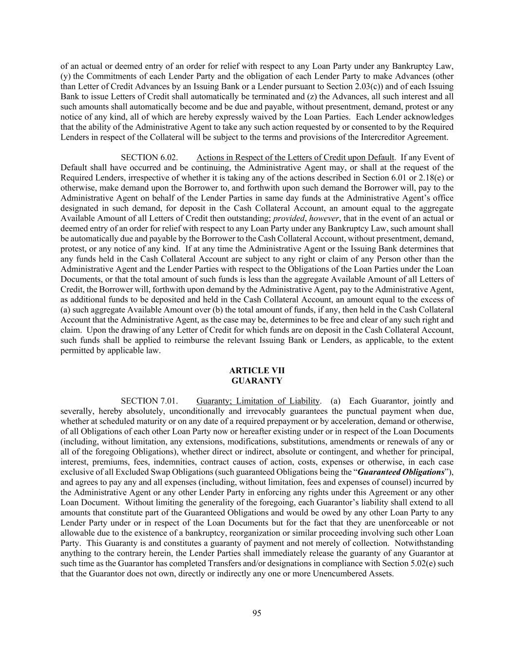 95 of an actual or deemed entry of an order for relief with respect to any Loan Party under any Bankruptcy Law, (y) the Commitments of each Lender Party and the obligation of each Lender Party to make Advances (other than Letter of Credit Advances by an Issuing Bank or a Lender pursuant to Section 2.03(c)) and of each Issuing Bank to issue Letters of Credit shall automatically be terminated and (z) the Advances, all such interest and all such amounts shall automatically become and be due and payable, without presentment, demand, protest or any notice of any kind, all of which are hereby expressly waived by the Loan Parties. Each Lender acknowledges that the ability of the Administrative Agent to take any such action requested by or consented to by the Required Lenders in respect of the Collateral will be subject to the terms and provisions of the Intercreditor Agreement. SECTION 6.02. Actions in Respect of the Letters of Credit upon Default. If any Event of Default shall have occurred and be continuing, the Administrative Agent may, or shall at the request of the Required Lenders, irrespective of whether it is taking any of the actions described in Section 6.01 or 2.18(e) or otherwise, make demand upon the Borrower to, and forthwith upon such demand the Borrower will, pay to the Administrative Agent on behalf of the Lender Parties in same day funds at the Administrative Agent’s office designated in such demand, for deposit in the Cash Collateral Account, an amount equal to the aggregate Available Amount of all Letters of Credit then outstanding; provided, however, that in the event of an actual or deemed entry of an order for relief with respect to any Loan Party under any Bankruptcy Law, such amount shall be automatically due and payable by the Borrower to the Cash Collateral Account, without presentment, demand, protest, or any notice of any kind. If at any time the Administrative Agent or the Issuing Bank determines that any funds held in the Cash Collateral Account are subject to any right or claim of any Person other than the Administrative Agent and the Lender Parties with respect to the Obligations of the Loan Parties under the Loan Documents, or that the total amount of such funds is less than the aggregate Available Amount of all Letters of Credit, the Borrower will, forthwith upon demand by the Administrative Agent, pay to the Administrative Agent, as additional funds to be deposited and held in the Cash Collateral Account, an amount equal to the excess of (a) such aggregate Available Amount over (b) the total amount of funds, if any, then held in the Cash Collateral Account that the Administrative Agent, as the case may be, determines to be free and clear of any such right and claim. Upon the drawing of any Letter of Credit for which funds are on deposit in the Cash Collateral Account, such funds shall be applied to reimburse the relevant Issuing Bank or Lenders, as applicable, to the extent permitted by applicable law. ARTICLE VII GUARANTY SECTION 7.01. Guaranty; Limitation of Liability. (a) Each Guarantor, jointly and severally, hereby absolutely, unconditionally and irrevocably guarantees the punctual payment when due, whether at scheduled maturity or on any date of a required prepayment or by acceleration, demand or otherwise, of all Obligations of each other Loan Party now or hereafter existing under or in respect of the Loan Documents (including, without limitation, any extensions, modifications, substitutions, amendments or renewals of any or all of the foregoing Obligations), whether direct or indirect, absolute or contingent, and whether for principal, interest, premiums, fees, indemnities, contract causes of action, costs, expenses or otherwise, in each case exclusive of all Excluded Swap Obligations (such guaranteed Obligations being the “Guaranteed Obligations”), and agrees to pay any and all expenses (including, without limitation, fees and expenses of counsel) incurred by the Administrative Agent or any other Lender Party in enforcing any rights under this Agreement or any other Loan Document. Without limiting the generality of the foregoing, each Guarantor’s liability shall extend to all amounts that constitute part of the Guaranteed Obligations and would be owed by any other Loan Party to any Lender Party under or in respect of the Loan Documents but for the fact that they are unenforceable or not allowable due to the existence of a bankruptcy, reorganization or similar proceeding involving such other Loan Party. This Guaranty is and constitutes a guaranty of payment and not merely of collection. Notwithstanding anything to the contrary herein, the Lender Parties shall immediately release the guaranty of any Guarantor at such time as the Guarantor has completed Transfers and/or designations in compliance with Section 5.02(e) such that the Guarantor does not own, directly or indirectly any one or more Unencumbered Assets.