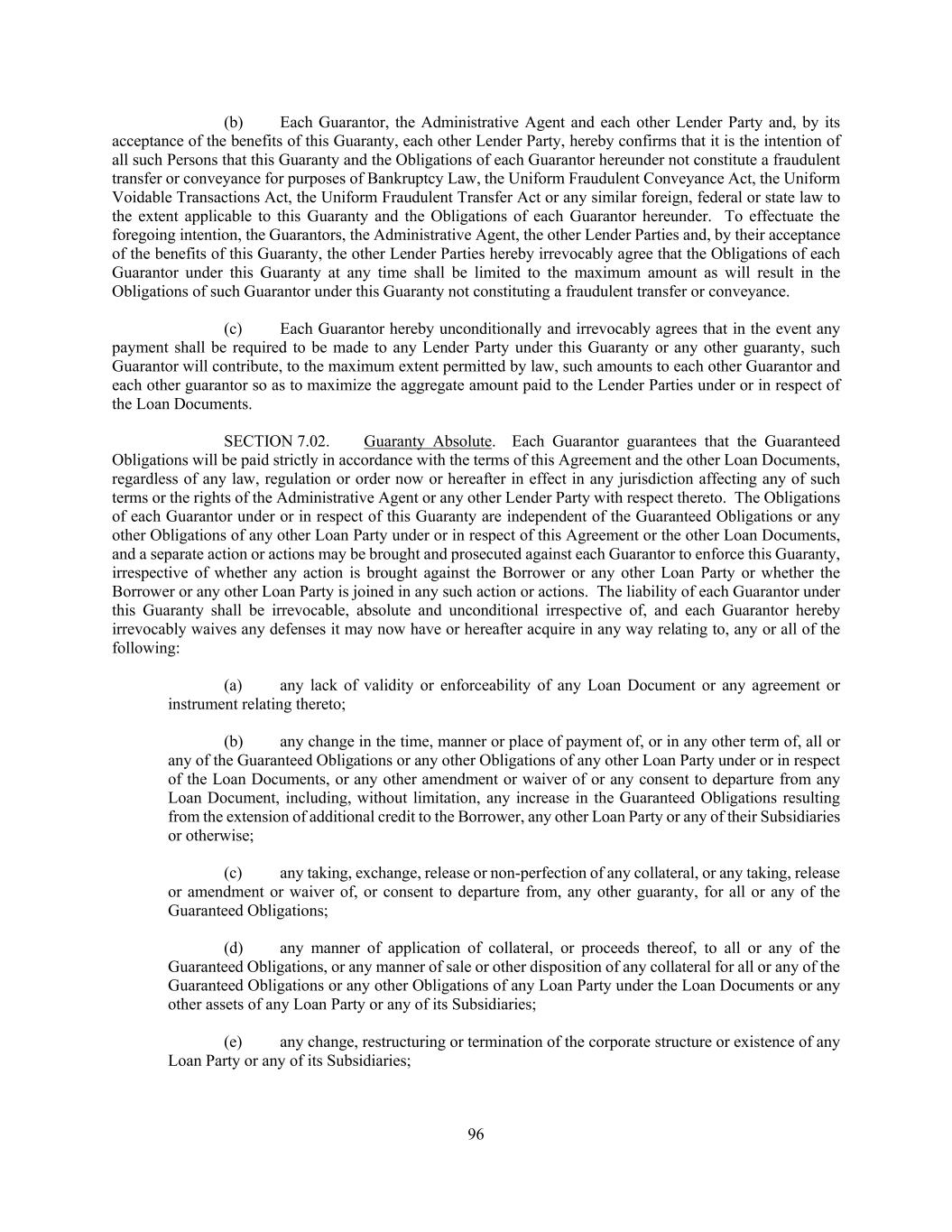 96 (b) Each Guarantor, the Administrative Agent and each other Lender Party and, by its acceptance of the benefits of this Guaranty, each other Lender Party, hereby confirms that it is the intention of all such Persons that this Guaranty and the Obligations of each Guarantor hereunder not constitute a fraudulent transfer or conveyance for purposes of Bankruptcy Law, the Uniform Fraudulent Conveyance Act, the Uniform Voidable Transactions Act, the Uniform Fraudulent Transfer Act or any similar foreign, federal or state law to the extent applicable to this Guaranty and the Obligations of each Guarantor hereunder. To effectuate the foregoing intention, the Guarantors, the Administrative Agent, the other Lender Parties and, by their acceptance of the benefits of this Guaranty, the other Lender Parties hereby irrevocably agree that the Obligations of each Guarantor under this Guaranty at any time shall be limited to the maximum amount as will result in the Obligations of such Guarantor under this Guaranty not constituting a fraudulent transfer or conveyance. (c) Each Guarantor hereby unconditionally and irrevocably agrees that in the event any payment shall be required to be made to any Lender Party under this Guaranty or any other guaranty, such Guarantor will contribute, to the maximum extent permitted by law, such amounts to each other Guarantor and each other guarantor so as to maximize the aggregate amount paid to the Lender Parties under or in respect of the Loan Documents. SECTION 7.02. Guaranty Absolute. Each Guarantor guarantees that the Guaranteed Obligations will be paid strictly in accordance with the terms of this Agreement and the other Loan Documents, regardless of any law, regulation or order now or hereafter in effect in any jurisdiction affecting any of such terms or the rights of the Administrative Agent or any other Lender Party with respect thereto. The Obligations of each Guarantor under or in respect of this Guaranty are independent of the Guaranteed Obligations or any other Obligations of any other Loan Party under or in respect of this Agreement or the other Loan Documents, and a separate action or actions may be brought and prosecuted against each Guarantor to enforce this Guaranty, irrespective of whether any action is brought against the Borrower or any other Loan Party or whether the Borrower or any other Loan Party is joined in any such action or actions. The liability of each Guarantor under this Guaranty shall be irrevocable, absolute and unconditional irrespective of, and each Guarantor hereby irrevocably waives any defenses it may now have or hereafter acquire in any way relating to, any or all of the following: (a) any lack of validity or enforceability of any Loan Document or any agreement or instrument relating thereto; (b) any change in the time, manner or place of payment of, or in any other term of, all or any of the Guaranteed Obligations or any other Obligations of any other Loan Party under or in respect of the Loan Documents, or any other amendment or waiver of or any consent to departure from any Loan Document, including, without limitation, any increase in the Guaranteed Obligations resulting from the extension of additional credit to the Borrower, any other Loan Party or any of their Subsidiaries or otherwise; (c) any taking, exchange, release or non-perfection of any collateral, or any taking, release or amendment or waiver of, or consent to departure from, any other guaranty, for all or any of the Guaranteed Obligations; (d) any manner of application of collateral, or proceeds thereof, to all or any of the Guaranteed Obligations, or any manner of sale or other disposition of any collateral for all or any of the Guaranteed Obligations or any other Obligations of any Loan Party under the Loan Documents or any other assets of any Loan Party or any of its Subsidiaries; (e) any change, restructuring or termination of the corporate structure or existence of any Loan Party or any of its Subsidiaries;