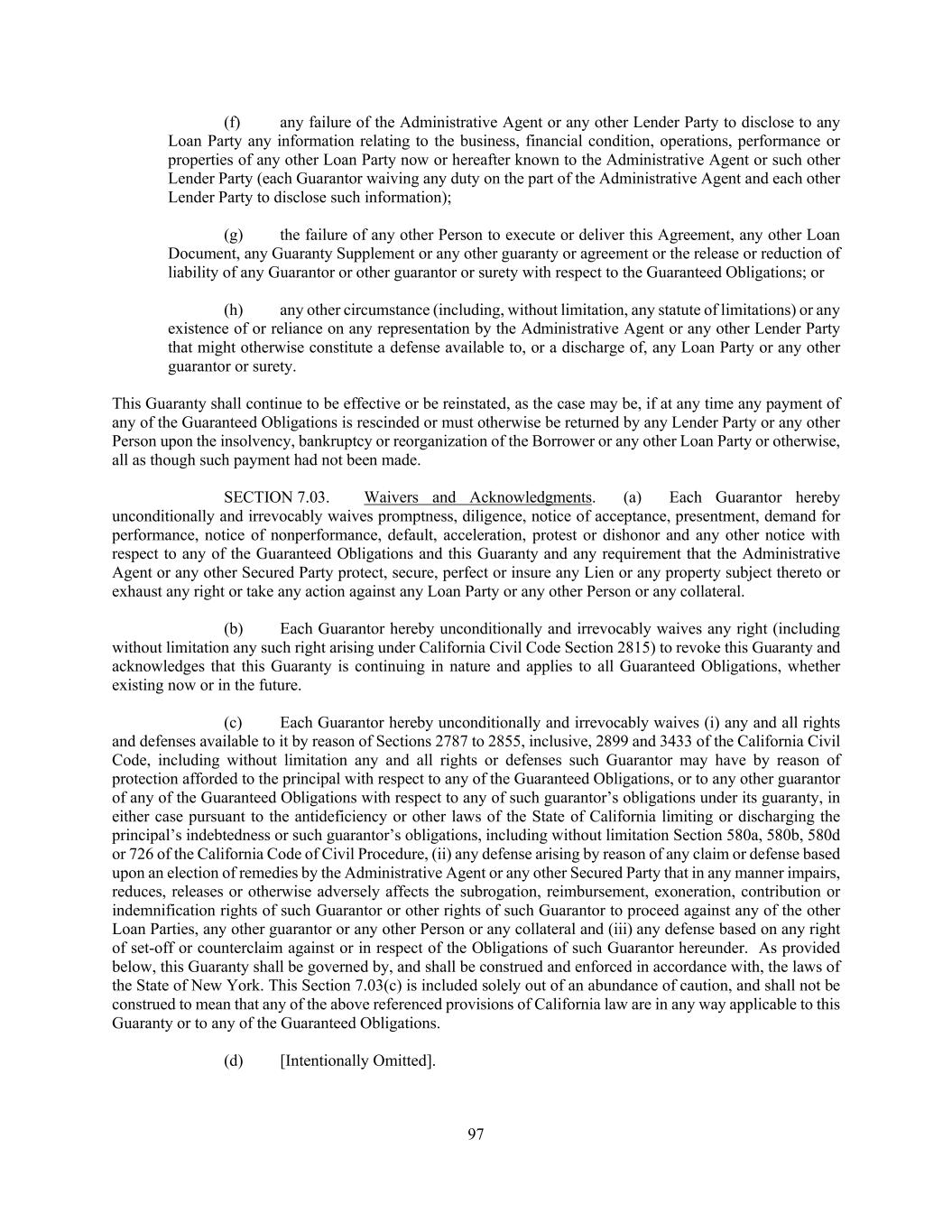 97 (f) any failure of the Administrative Agent or any other Lender Party to disclose to any Loan Party any information relating to the business, financial condition, operations, performance or properties of any other Loan Party now or hereafter known to the Administrative Agent or such other Lender Party (each Guarantor waiving any duty on the part of the Administrative Agent and each other Lender Party to disclose such information); (g) the failure of any other Person to execute or deliver this Agreement, any other Loan Document, any Guaranty Supplement or any other guaranty or agreement or the release or reduction of liability of any Guarantor or other guarantor or surety with respect to the Guaranteed Obligations; or (h) any other circumstance (including, without limitation, any statute of limitations) or any existence of or reliance on any representation by the Administrative Agent or any other Lender Party that might otherwise constitute a defense available to, or a discharge of, any Loan Party or any other guarantor or surety. This Guaranty shall continue to be effective or be reinstated, as the case may be, if at any time any payment of any of the Guaranteed Obligations is rescinded or must otherwise be returned by any Lender Party or any other Person upon the insolvency, bankruptcy or reorganization of the Borrower or any other Loan Party or otherwise, all as though such payment had not been made. SECTION 7.03. Waivers and Acknowledgments. (a) Each Guarantor hereby unconditionally and irrevocably waives promptness, diligence, notice of acceptance, presentment, demand for performance, notice of nonperformance, default, acceleration, protest or dishonor and any other notice with respect to any of the Guaranteed Obligations and this Guaranty and any requirement that the Administrative Agent or any other Secured Party protect, secure, perfect or insure any Lien or any property subject thereto or exhaust any right or take any action against any Loan Party or any other Person or any collateral. (b) Each Guarantor hereby unconditionally and irrevocably waives any right (including without limitation any such right arising under California Civil Code Section 2815) to revoke this Guaranty and acknowledges that this Guaranty is continuing in nature and applies to all Guaranteed Obligations, whether existing now or in the future. (c) Each Guarantor hereby unconditionally and irrevocably waives (i) any and all rights and defenses available to it by reason of Sections 2787 to 2855, inclusive, 2899 and 3433 of the California Civil Code, including without limitation any and all rights or defenses such Guarantor may have by reason of protection afforded to the principal with respect to any of the Guaranteed Obligations, or to any other guarantor of any of the Guaranteed Obligations with respect to any of such guarantor’s obligations under its guaranty, in either case pursuant to the antideficiency or other laws of the State of California limiting or discharging the principal’s indebtedness or such guarantor’s obligations, including without limitation Section 580a, 580b, 580d or 726 of the California Code of Civil Procedure, (ii) any defense arising by reason of any claim or defense based upon an election of remedies by the Administrative Agent or any other Secured Party that in any manner impairs, reduces, releases or otherwise adversely affects the subrogation, reimbursement, exoneration, contribution or indemnification rights of such Guarantor or other rights of such Guarantor to proceed against any of the other Loan Parties, any other guarantor or any other Person or any collateral and (iii) any defense based on any right of set-off or counterclaim against or in respect of the Obligations of such Guarantor hereunder. As provided below, this Guaranty shall be governed by, and shall be construed and enforced in accordance with, the laws of the State of New York. This Section 7.03(c) is included solely out of an abundance of caution, and shall not be construed to mean that any of the above referenced provisions of California law are in any way applicable to this Guaranty or to any of the Guaranteed Obligations. (d) [Intentionally Omitted].