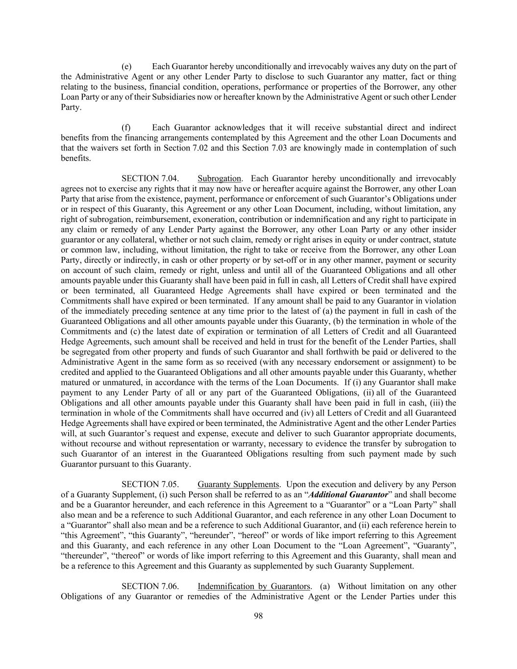 98 (e) Each Guarantor hereby unconditionally and irrevocably waives any duty on the part of the Administrative Agent or any other Lender Party to disclose to such Guarantor any matter, fact or thing relating to the business, financial condition, operations, performance or properties of the Borrower, any other Loan Party or any of their Subsidiaries now or hereafter known by the Administrative Agent or such other Lender Party. (f) Each Guarantor acknowledges that it will receive substantial direct and indirect benefits from the financing arrangements contemplated by this Agreement and the other Loan Documents and that the waivers set forth in Section 7.02 and this Section 7.03 are knowingly made in contemplation of such benefits. SECTION 7.04. Subrogation. Each Guarantor hereby unconditionally and irrevocably agrees not to exercise any rights that it may now have or hereafter acquire against the Borrower, any other Loan Party that arise from the existence, payment, performance or enforcement of such Guarantor’s Obligations under or in respect of this Guaranty, this Agreement or any other Loan Document, including, without limitation, any right of subrogation, reimbursement, exoneration, contribution or indemnification and any right to participate in any claim or remedy of any Lender Party against the Borrower, any other Loan Party or any other insider guarantor or any collateral, whether or not such claim, remedy or right arises in equity or under contract, statute or common law, including, without limitation, the right to take or receive from the Borrower, any other Loan Party, directly or indirectly, in cash or other property or by set-off or in any other manner, payment or security on account of such claim, remedy or right, unless and until all of the Guaranteed Obligations and all other amounts payable under this Guaranty shall have been paid in full in cash, all Letters of Credit shall have expired or been terminated, all Guaranteed Hedge Agreements shall have expired or been terminated and the Commitments shall have expired or been terminated. If any amount shall be paid to any Guarantor in violation of the immediately preceding sentence at any time prior to the latest of (a) the payment in full in cash of the Guaranteed Obligations and all other amounts payable under this Guaranty, (b) the termination in whole of the Commitments and (c) the latest date of expiration or termination of all Letters of Credit and all Guaranteed Hedge Agreements, such amount shall be received and held in trust for the benefit of the Lender Parties, shall be segregated from other property and funds of such Guarantor and shall forthwith be paid or delivered to the Administrative Agent in the same form as so received (with any necessary endorsement or assignment) to be credited and applied to the Guaranteed Obligations and all other amounts payable under this Guaranty, whether matured or unmatured, in accordance with the terms of the Loan Documents. If (i) any Guarantor shall make payment to any Lender Party of all or any part of the Guaranteed Obligations, (ii) all of the Guaranteed Obligations and all other amounts payable under this Guaranty shall have been paid in full in cash, (iii) the termination in whole of the Commitments shall have occurred and (iv) all Letters of Credit and all Guaranteed Hedge Agreements shall have expired or been terminated, the Administrative Agent and the other Lender Parties will, at such Guarantor’s request and expense, execute and deliver to such Guarantor appropriate documents, without recourse and without representation or warranty, necessary to evidence the transfer by subrogation to such Guarantor of an interest in the Guaranteed Obligations resulting from such payment made by such Guarantor pursuant to this Guaranty. SECTION 7.05. Guaranty Supplements. Upon the execution and delivery by any Person of a Guaranty Supplement, (i) such Person shall be referred to as an “Additional Guarantor” and shall become and be a Guarantor hereunder, and each reference in this Agreement to a “Guarantor” or a “Loan Party” shall also mean and be a reference to such Additional Guarantor, and each reference in any other Loan Document to a “Guarantor” shall also mean and be a reference to such Additional Guarantor, and (ii) each reference herein to “this Agreement”, “this Guaranty”, “hereunder”, “hereof” or words of like import referring to this Agreement and this Guaranty, and each reference in any other Loan Document to the “Loan Agreement”, “Guaranty”, “thereunder”, “thereof” or words of like import referring to this Agreement and this Guaranty, shall mean and be a reference to this Agreement and this Guaranty as supplemented by such Guaranty Supplement. SECTION 7.06. Indemnification by Guarantors. (a) Without limitation on any other Obligations of any Guarantor or remedies of the Administrative Agent or the Lender Parties under this