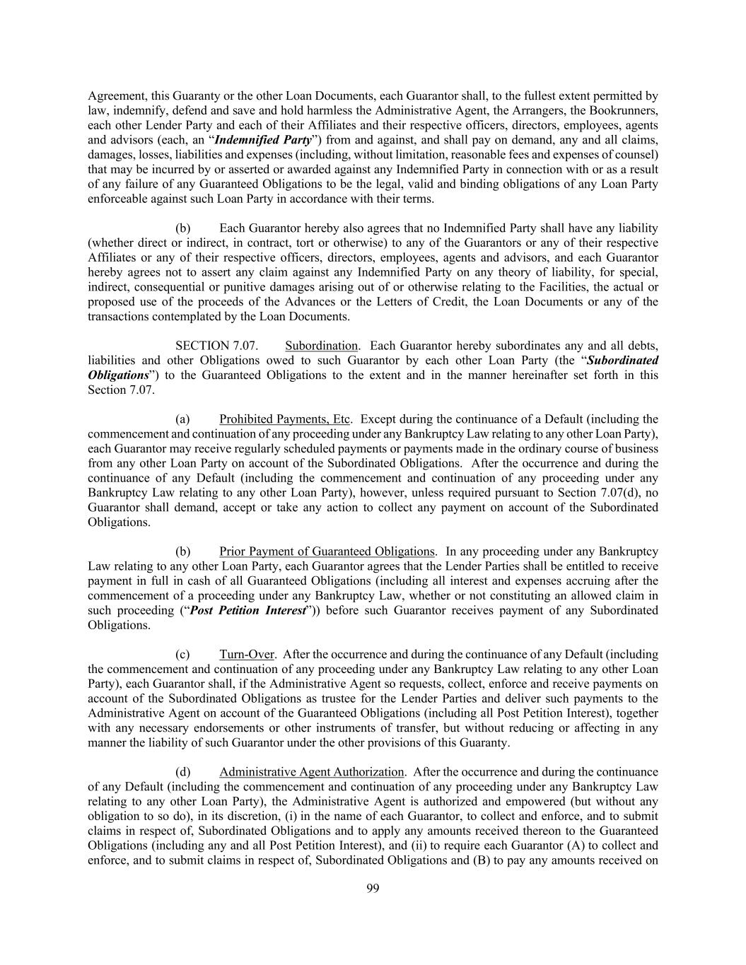 99 Agreement, this Guaranty or the other Loan Documents, each Guarantor shall, to the fullest extent permitted by law, indemnify, defend and save and hold harmless the Administrative Agent, the Arrangers, the Bookrunners, each other Lender Party and each of their Affiliates and their respective officers, directors, employees, agents and advisors (each, an “Indemnified Party”) from and against, and shall pay on demand, any and all claims, damages, losses, liabilities and expenses (including, without limitation, reasonable fees and expenses of counsel) that may be incurred by or asserted or awarded against any Indemnified Party in connection with or as a result of any failure of any Guaranteed Obligations to be the legal, valid and binding obligations of any Loan Party enforceable against such Loan Party in accordance with their terms. (b) Each Guarantor hereby also agrees that no Indemnified Party shall have any liability (whether direct or indirect, in contract, tort or otherwise) to any of the Guarantors or any of their respective Affiliates or any of their respective officers, directors, employees, agents and advisors, and each Guarantor hereby agrees not to assert any claim against any Indemnified Party on any theory of liability, for special, indirect, consequential or punitive damages arising out of or otherwise relating to the Facilities, the actual or proposed use of the proceeds of the Advances or the Letters of Credit, the Loan Documents or any of the transactions contemplated by the Loan Documents. SECTION 7.07. Subordination. Each Guarantor hereby subordinates any and all debts, liabilities and other Obligations owed to such Guarantor by each other Loan Party (the “Subordinated Obligations”) to the Guaranteed Obligations to the extent and in the manner hereinafter set forth in this Section 7.07. (a) Prohibited Payments, Etc. Except during the continuance of a Default (including the commencement and continuation of any proceeding under any Bankruptcy Law relating to any other Loan Party), each Guarantor may receive regularly scheduled payments or payments made in the ordinary course of business from any other Loan Party on account of the Subordinated Obligations. After the occurrence and during the continuance of any Default (including the commencement and continuation of any proceeding under any Bankruptcy Law relating to any other Loan Party), however, unless required pursuant to Section 7.07(d), no Guarantor shall demand, accept or take any action to collect any payment on account of the Subordinated Obligations. (b) Prior Payment of Guaranteed Obligations. In any proceeding under any Bankruptcy Law relating to any other Loan Party, each Guarantor agrees that the Lender Parties shall be entitled to receive payment in full in cash of all Guaranteed Obligations (including all interest and expenses accruing after the commencement of a proceeding under any Bankruptcy Law, whether or not constituting an allowed claim in such proceeding (“Post Petition Interest”)) before such Guarantor receives payment of any Subordinated Obligations. (c) Turn-Over. After the occurrence and during the continuance of any Default (including the commencement and continuation of any proceeding under any Bankruptcy Law relating to any other Loan Party), each Guarantor shall, if the Administrative Agent so requests, collect, enforce and receive payments on account of the Subordinated Obligations as trustee for the Lender Parties and deliver such payments to the Administrative Agent on account of the Guaranteed Obligations (including all Post Petition Interest), together with any necessary endorsements or other instruments of transfer, but without reducing or affecting in any manner the liability of such Guarantor under the other provisions of this Guaranty. (d) Administrative Agent Authorization. After the occurrence and during the continuance of any Default (including the commencement and continuation of any proceeding under any Bankruptcy Law relating to any other Loan Party), the Administrative Agent is authorized and empowered (but without any obligation to so do), in its discretion, (i) in the name of each Guarantor, to collect and enforce, and to submit claims in respect of, Subordinated Obligations and to apply any amounts received thereon to the Guaranteed Obligations (including any and all Post Petition Interest), and (ii) to require each Guarantor (A) to collect and enforce, and to submit claims in respect of, Subordinated Obligations and (B) to pay any amounts received on