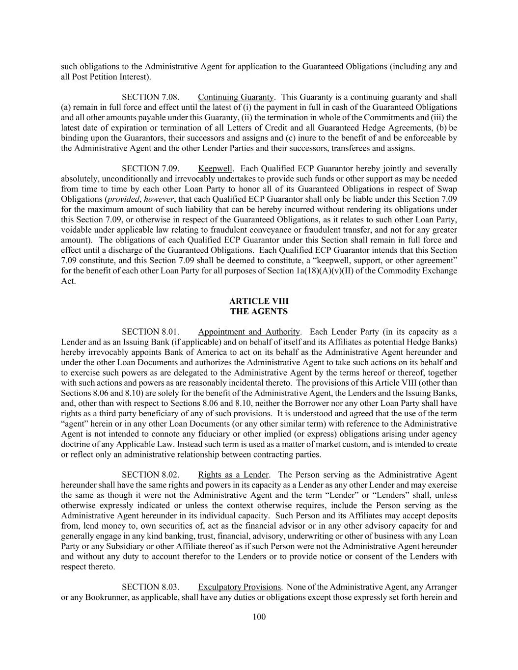 100 such obligations to the Administrative Agent for application to the Guaranteed Obligations (including any and all Post Petition Interest). SECTION 7.08. Continuing Guaranty. This Guaranty is a continuing guaranty and shall (a) remain in full force and effect until the latest of (i) the payment in full in cash of the Guaranteed Obligations and all other amounts payable under this Guaranty, (ii) the termination in whole of the Commitments and (iii) the latest date of expiration or termination of all Letters of Credit and all Guaranteed Hedge Agreements, (b) be binding upon the Guarantors, their successors and assigns and (c) inure to the benefit of and be enforceable by the Administrative Agent and the other Lender Parties and their successors, transferees and assigns. SECTION 7.09. Keepwell. Each Qualified ECP Guarantor hereby jointly and severally absolutely, unconditionally and irrevocably undertakes to provide such funds or other support as may be needed from time to time by each other Loan Party to honor all of its Guaranteed Obligations in respect of Swap Obligations (provided, however, that each Qualified ECP Guarantor shall only be liable under this Section 7.09 for the maximum amount of such liability that can be hereby incurred without rendering its obligations under this Section 7.09, or otherwise in respect of the Guaranteed Obligations, as it relates to such other Loan Party, voidable under applicable law relating to fraudulent conveyance or fraudulent transfer, and not for any greater amount). The obligations of each Qualified ECP Guarantor under this Section shall remain in full force and effect until a discharge of the Guaranteed Obligations. Each Qualified ECP Guarantor intends that this Section 7.09 constitute, and this Section 7.09 shall be deemed to constitute, a “keepwell, support, or other agreement” for the benefit of each other Loan Party for all purposes of Section 1a(18)(A)(v)(II) of the Commodity Exchange Act. ARTICLE VIII THE AGENTS SECTION 8.01. Appointment and Authority. Each Lender Party (in its capacity as a Lender and as an Issuing Bank (if applicable) and on behalf of itself and its Affiliates as potential Hedge Banks) hereby irrevocably appoints Bank of America to act on its behalf as the Administrative Agent hereunder and under the other Loan Documents and authorizes the Administrative Agent to take such actions on its behalf and to exercise such powers as are delegated to the Administrative Agent by the terms hereof or thereof, together with such actions and powers as are reasonably incidental thereto. The provisions of this Article VIII (other than Sections 8.06 and 8.10) are solely for the benefit of the Administrative Agent, the Lenders and the Issuing Banks, and, other than with respect to Sections 8.06 and 8.10, neither the Borrower nor any other Loan Party shall have rights as a third party beneficiary of any of such provisions. It is understood and agreed that the use of the term “agent” herein or in any other Loan Documents (or any other similar term) with reference to the Administrative Agent is not intended to connote any fiduciary or other implied (or express) obligations arising under agency doctrine of any Applicable Law. Instead such term is used as a matter of market custom, and is intended to create or reflect only an administrative relationship between contracting parties. SECTION 8.02. Rights as a Lender. The Person serving as the Administrative Agent hereunder shall have the same rights and powers in its capacity as a Lender as any other Lender and may exercise the same as though it were not the Administrative Agent and the term “Lender” or “Lenders” shall, unless otherwise expressly indicated or unless the context otherwise requires, include the Person serving as the Administrative Agent hereunder in its individual capacity. Such Person and its Affiliates may accept deposits from, lend money to, own securities of, act as the financial advisor or in any other advisory capacity for and generally engage in any kind banking, trust, financial, advisory, underwriting or other of business with any Loan Party or any Subsidiary or other Affiliate thereof as if such Person were not the Administrative Agent hereunder and without any duty to account therefor to the Lenders or to provide notice or consent of the Lenders with respect thereto. SECTION 8.03. Exculpatory Provisions. None of the Administrative Agent, any Arranger or any Bookrunner, as applicable, shall have any duties or obligations except those expressly set forth herein and